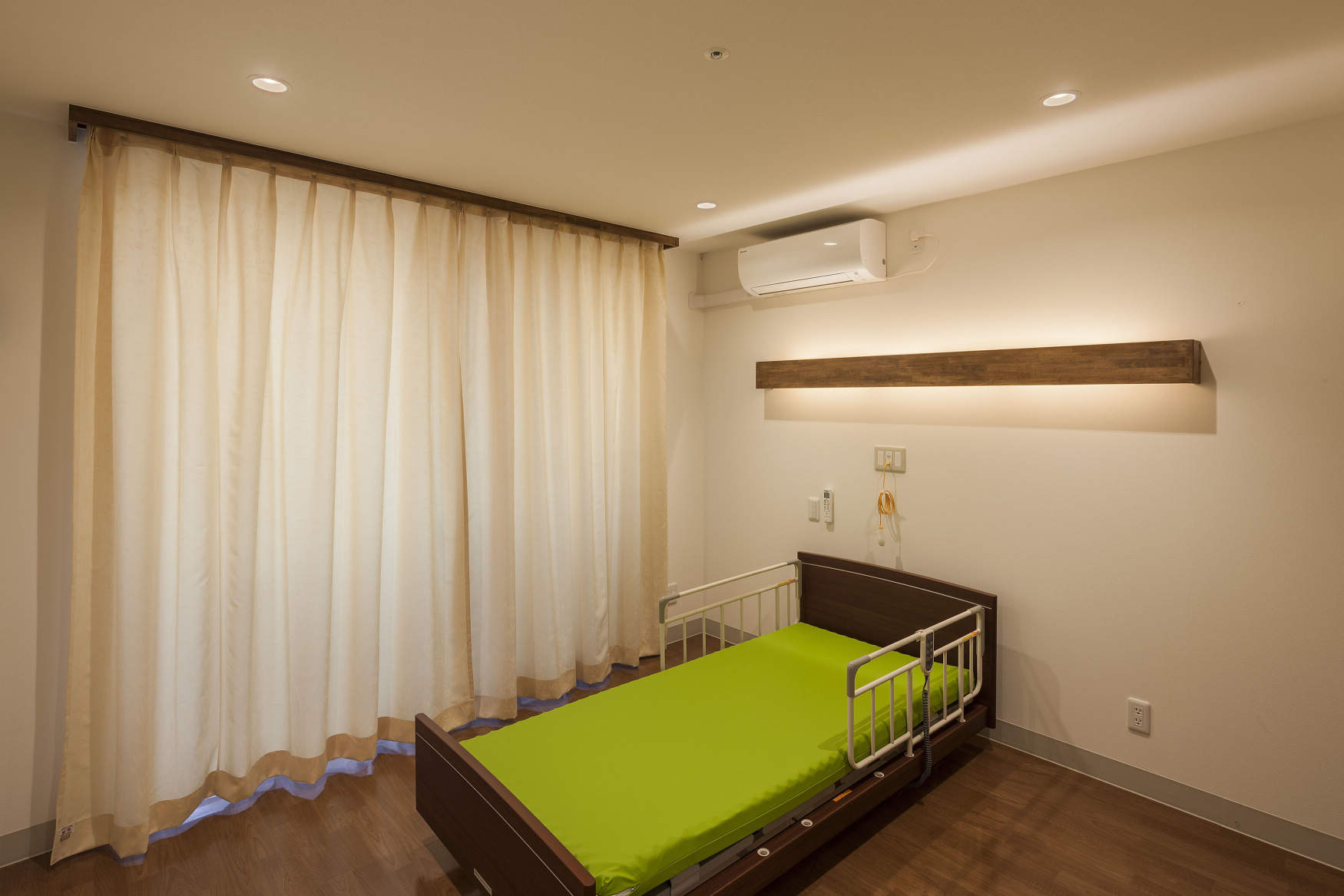 デイサービスを利用するお年寄り向けの静養室です。体調が優れない方がゆっくりと休めるように照度を低めに設定するとともに、光源が直接目に入らないように枕元にコーニス照明、通路にはケアサポートライトを採用しています。
