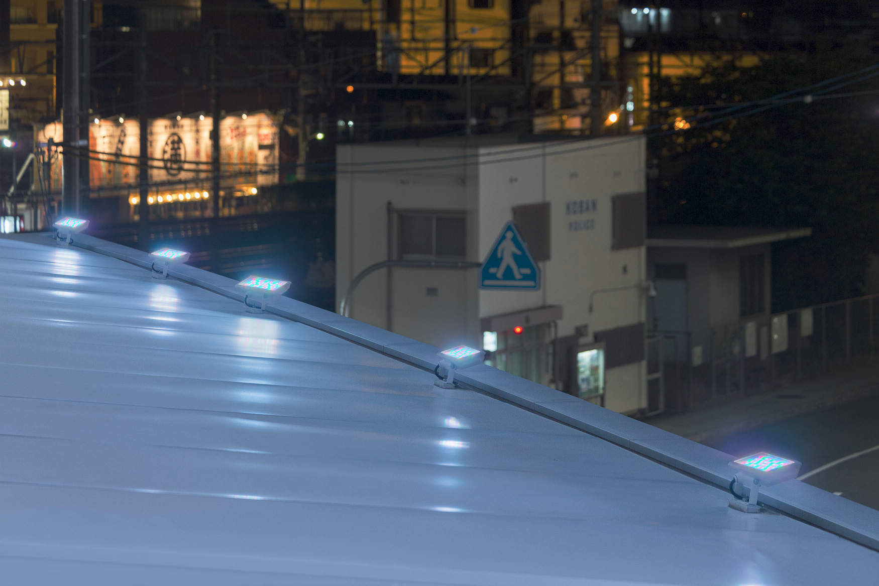 夜間はペデストリアンデッキ2階の雲をイメージした真っ白な大屋根をカラーライトアップし、駅前の新しいシンボルとして存在感を高めています。ライトアップは屋根の輪郭を強調するように周囲だけをフラットにライトアップされており、白を基本色に正時毎に5分間1日の空の色の移り変わりをイメージしたやさしいパステルカラーでライトアップし、時を演出します。