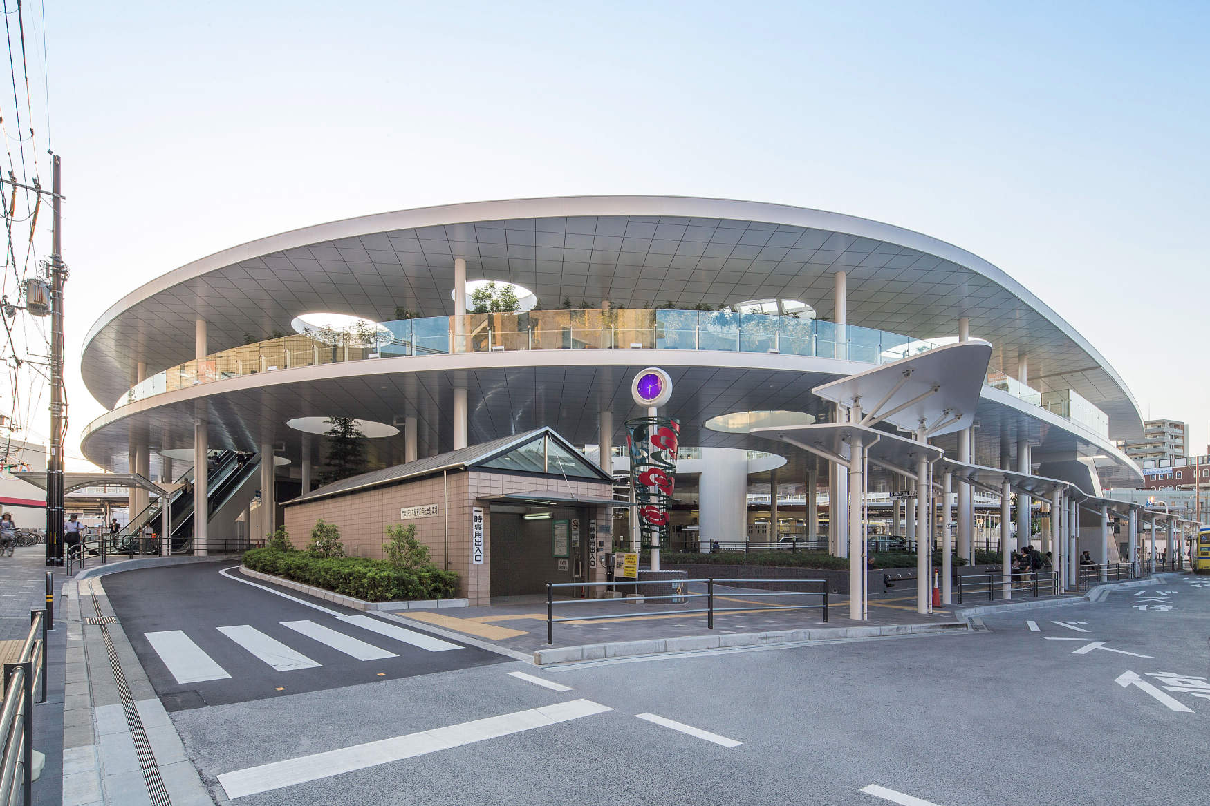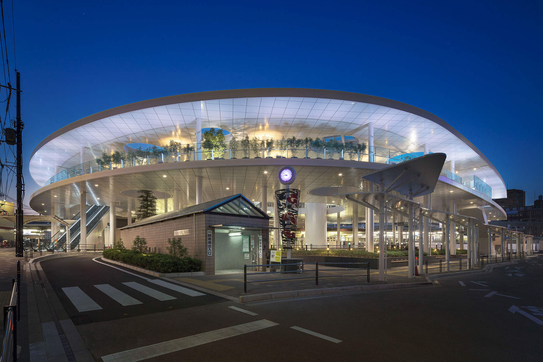 - 「立命館茨木キャンパス」の開校に合わせ駅東口駅前広場が改修され、2階建て・約1600㎡のペデストリアンデッキが新設されました。ペデストリアンデッキ1階はロータリーやタクシー乗り場、2階は植栽などが配されたくつろぎスペース・イベント広場となっており、雲をイメージした真っ白な大屋根が特徴です。雲をイメージした大屋根を白~パステル系のやさしい色味でライトアップし、駅前の新しいシンボルとしての存在感を演出しています。