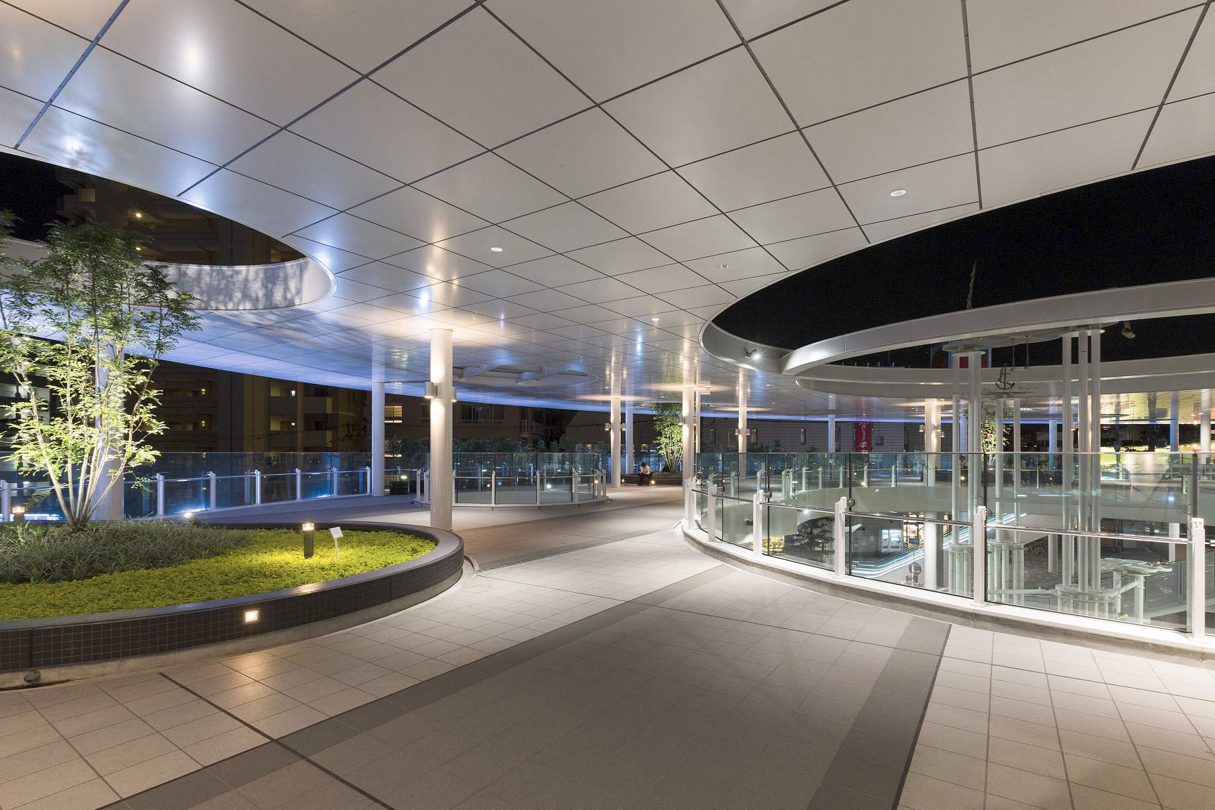 ペデストリアンデッキ2階はライトアップの光を生かすため、ベース照明にはグレアレスダウンライトを採用しスッキリとした天井を演出しながら安全照度を確保しています。デッキ内部では、柱周りに上下配光型ブラケットを配置することで天井面・床面に光溜を演出し、明るさ感を高めています。植栽周りにはフットライトを配置。し樹木をライトアップする事で明るさ感を高め、空間に光の陰影を演出し、癒しムードを高めています。