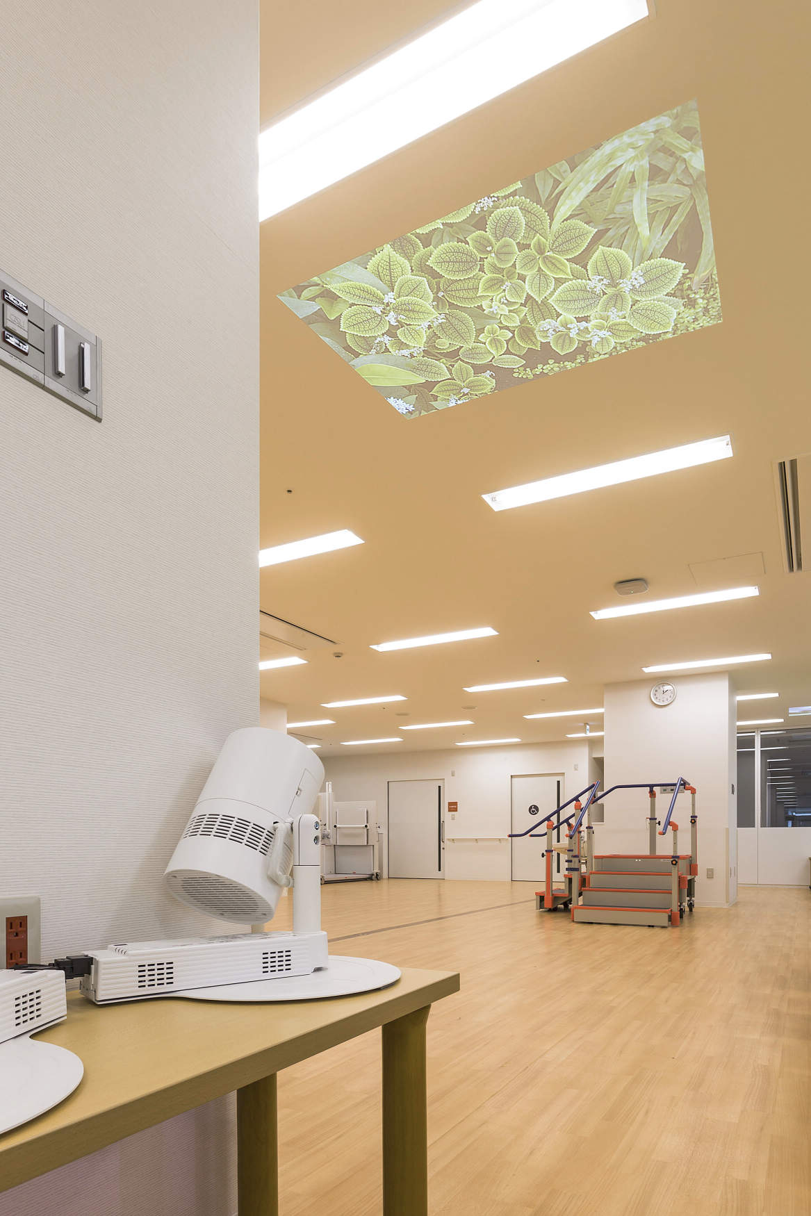 リハビリテーション科では、毎日約150人の患者様がリハビリに取り組んでおられます。がん患者の方は、心理的ストレスをもっておられるケースが多く、身体リハビリテーションと合わせてメンタルケアが重要となります。そのため、同センターのリハビリテーション科では、以前からリハビリ空間に癒し効果を取り入れるために、天井面に絵画を飾る構想を持っておられました。 今回、病院を移転、新築する際に建設会社様から当社のスペースプレーヤーのご紹介があり、導入頂くことになりました。