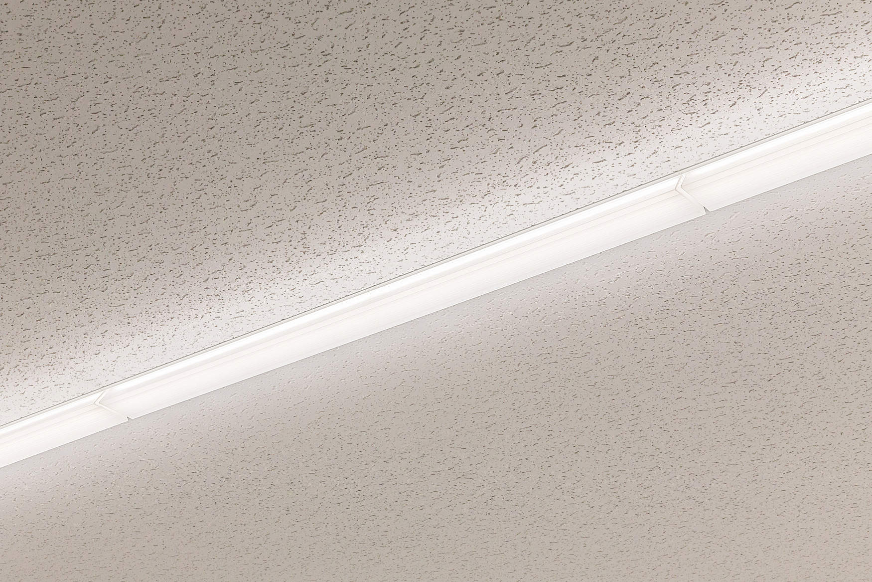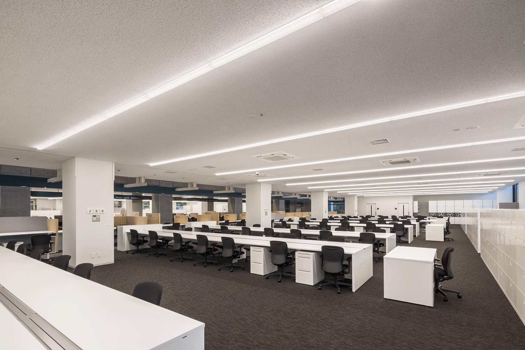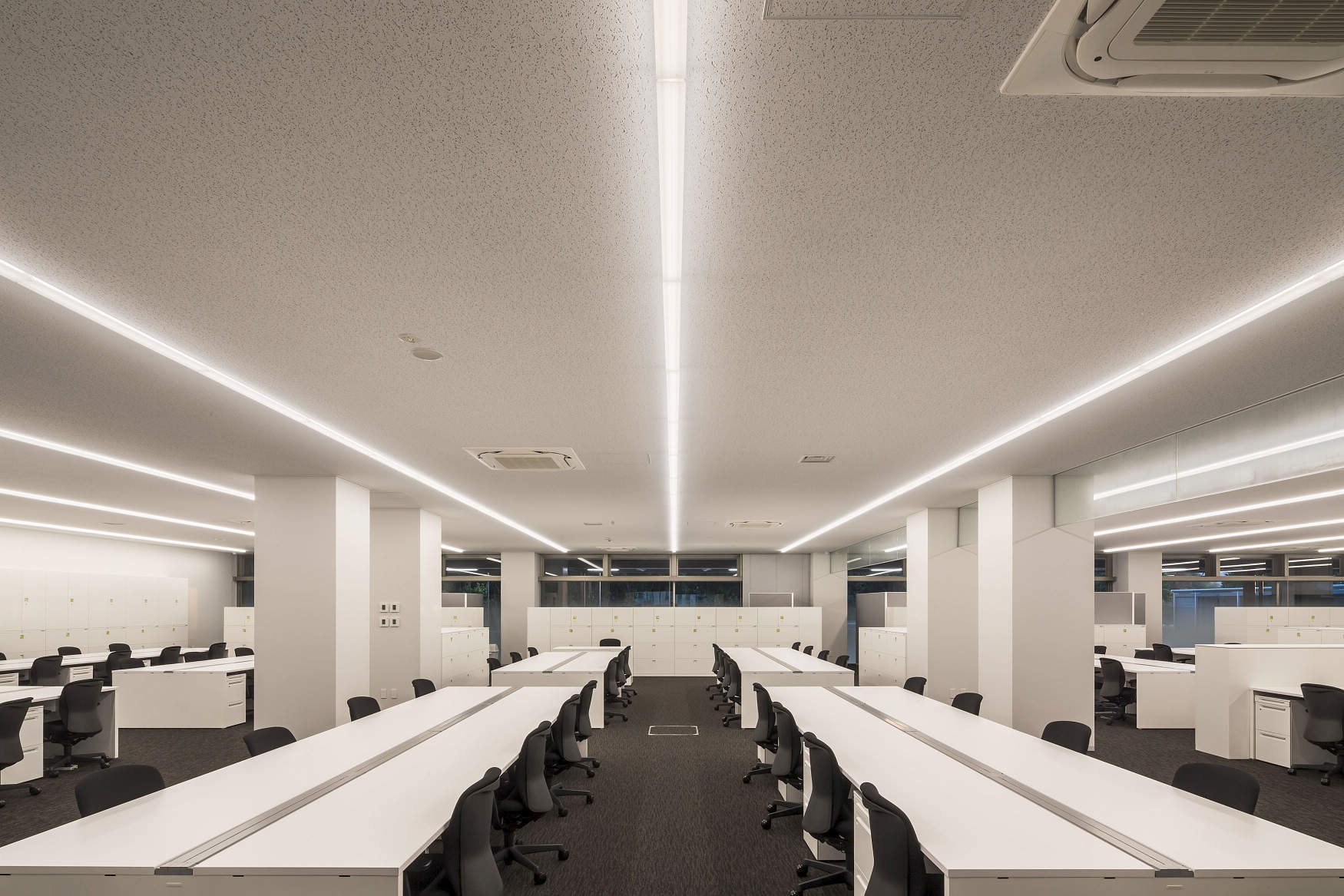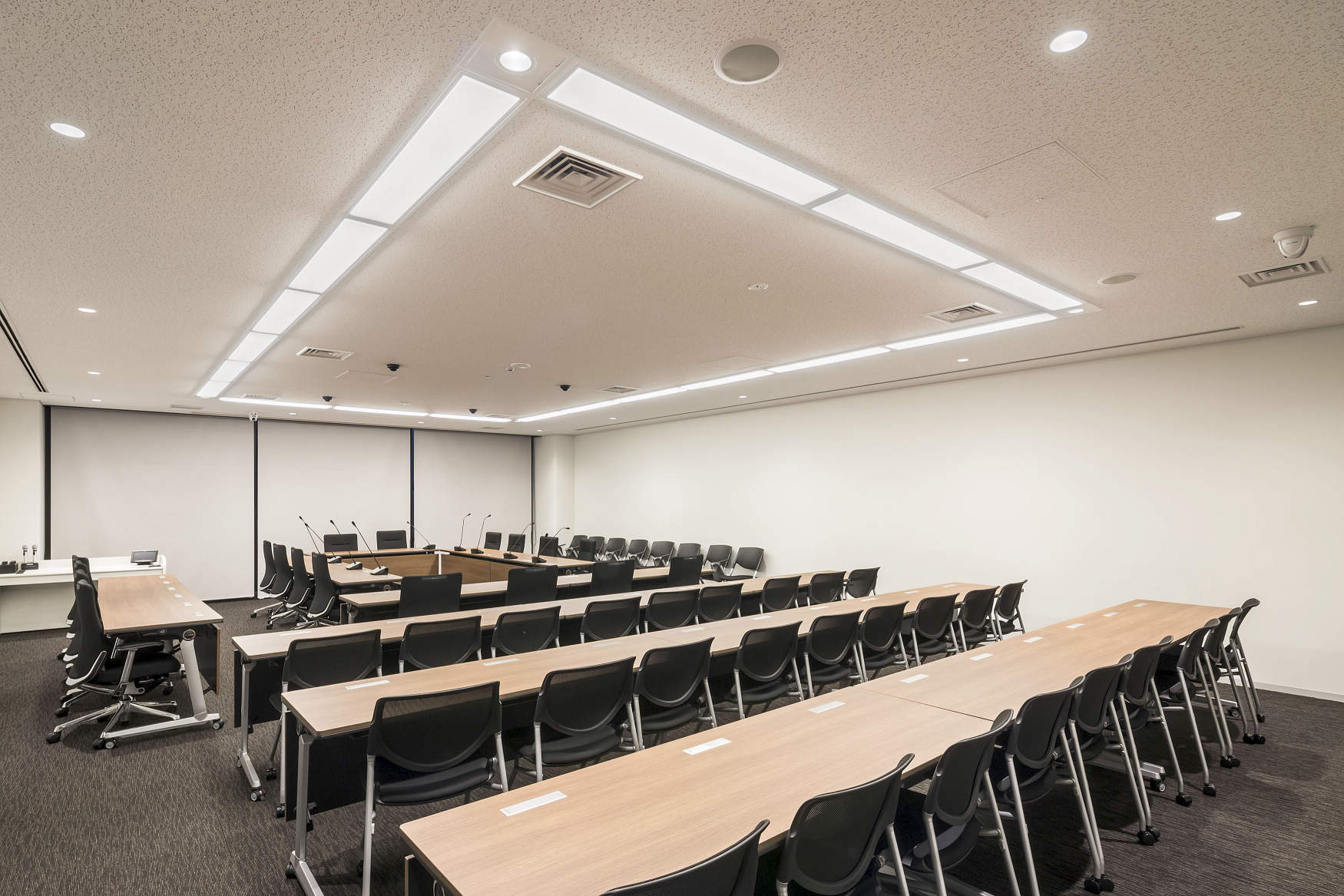 ロの字連結に対応した照明器具。コーナーにはダウンライトを内蔵。一体感のある照明設備空間。