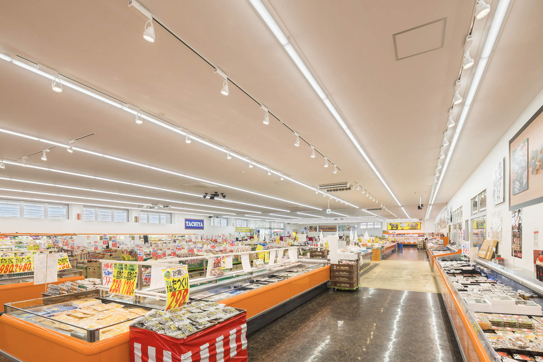 平台・対面は彩光色250形広角スポットライトにて精肉・鮮魚・惣菜を演出しています。
