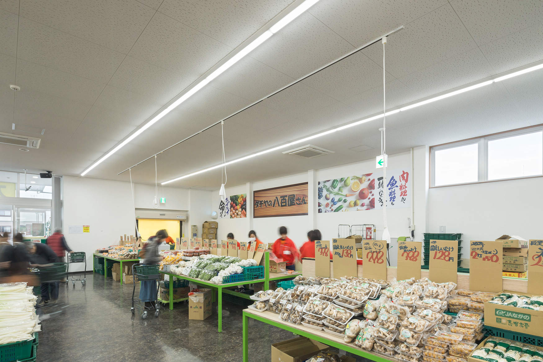 生鮮食料品をお手頃価格で市場の様に販売している為、什器などは簡易化されてシンプルなつくりの店舗です。