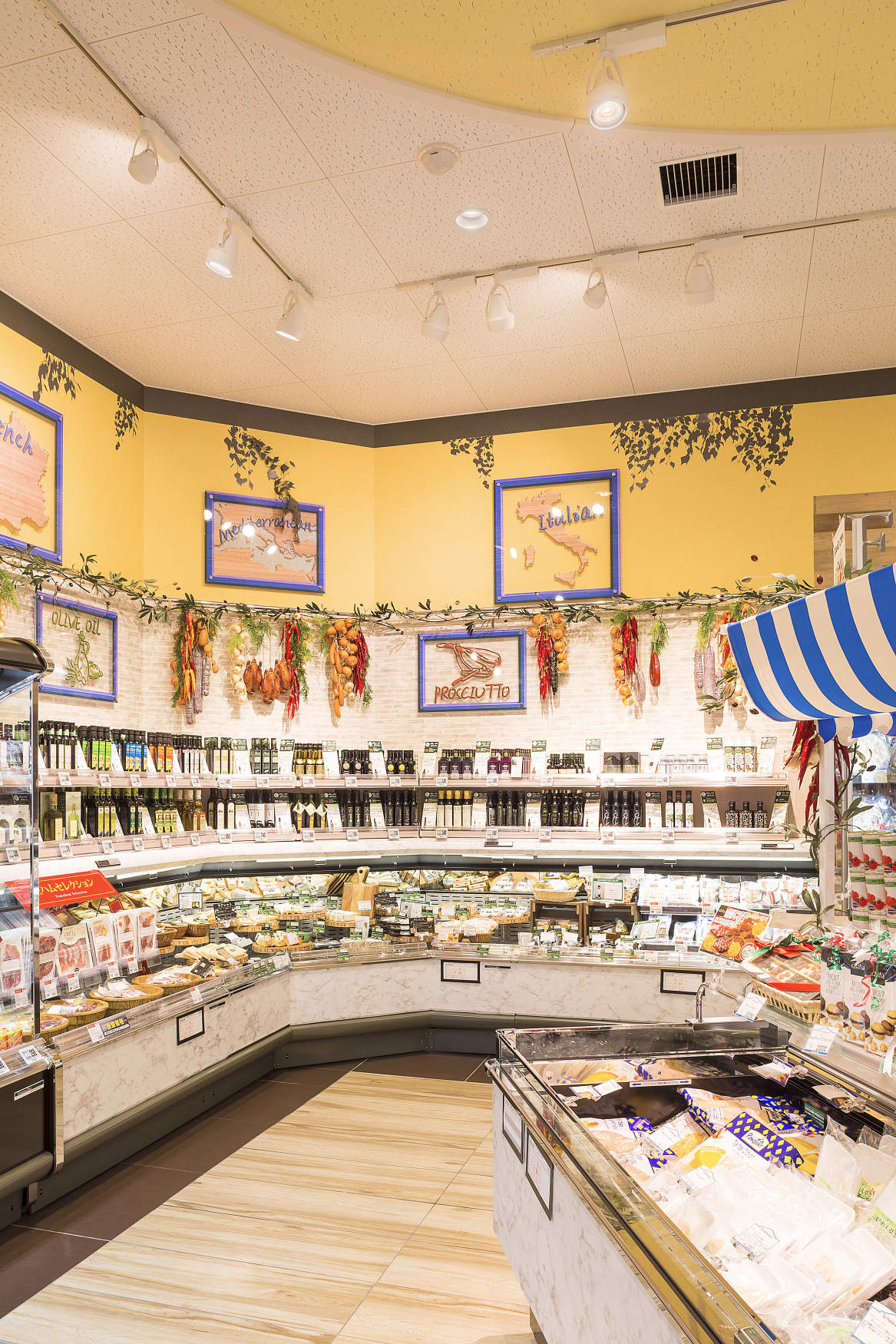 イタリアをテーマにした売場です。「彩光色」400形スポットライトの23°でメリハリをつけて照射しています。壁面は、「彩光色」の250形34°で、内装をより鮮やかに見せています。