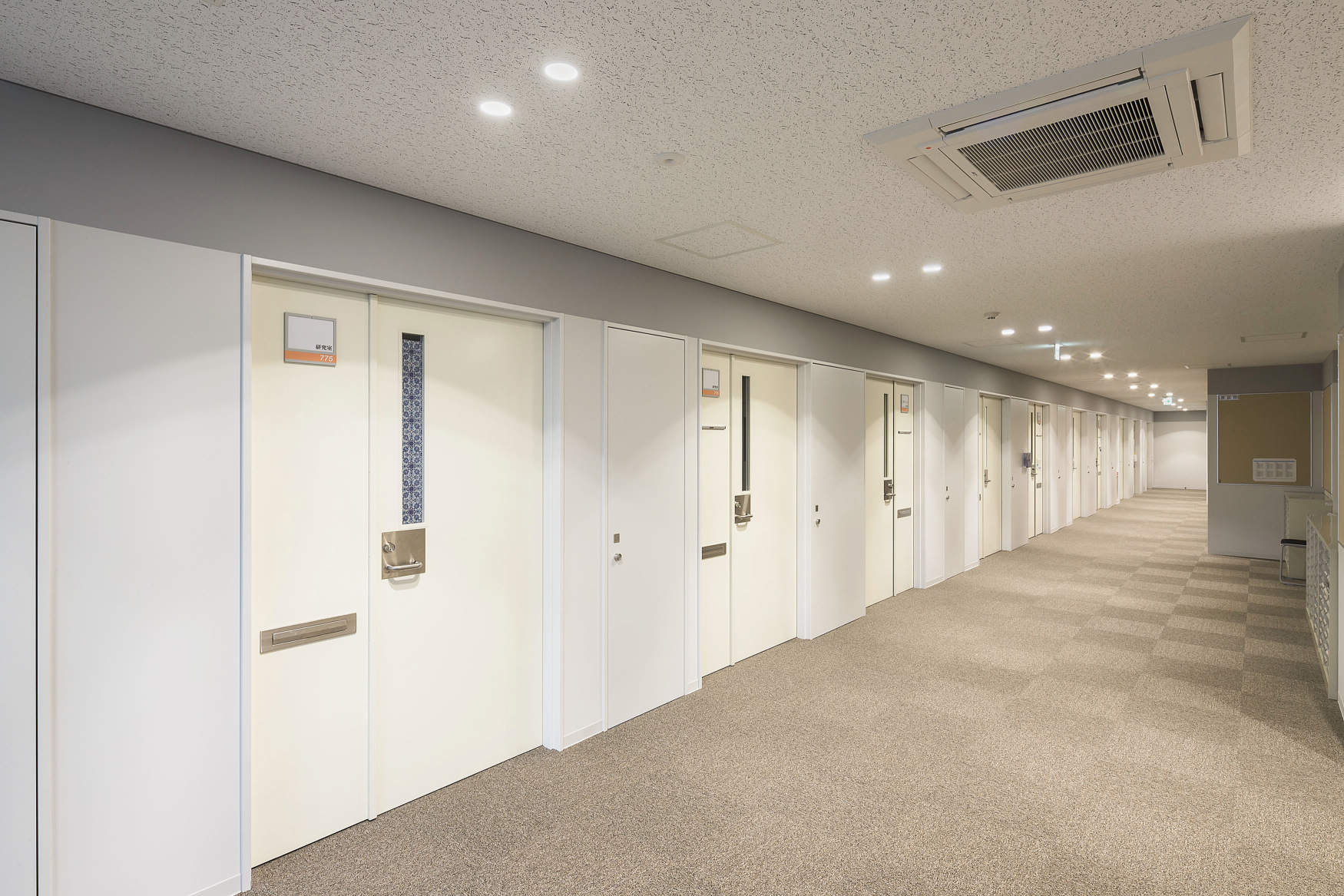 廊下やトイレは、LED ダウンライト150 形(1,470lm、13W、4,000K)により100~200lx を確保し、人感センサーと組み合わせることで、スイッチレスの制御を実現しています。
