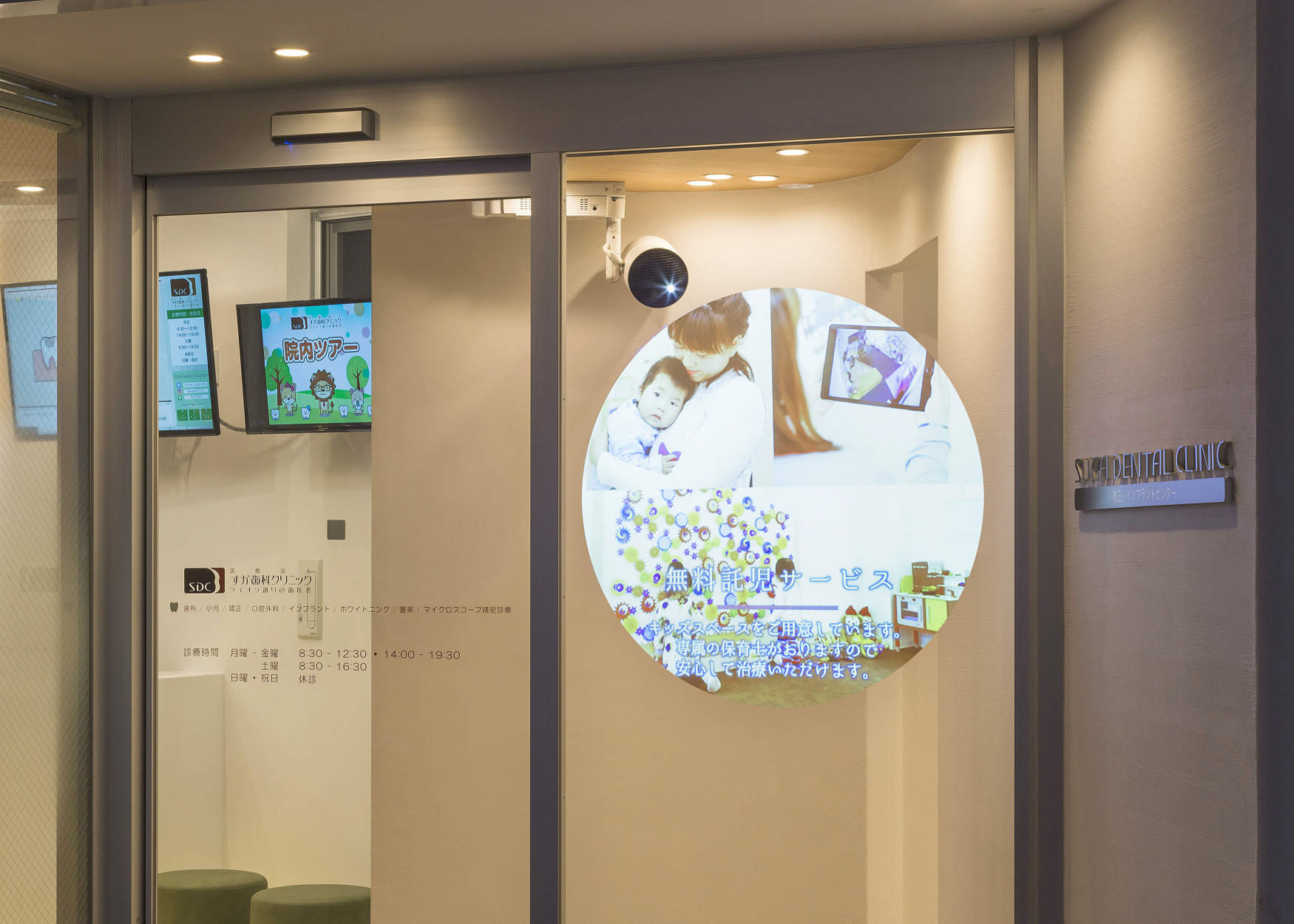 スペースプレーヤーを2台納入し、1台はエントランス横のガラスに院内から裏投影して道行く人へのサイネージとして活用し、もう1台はキッズルームの天井に多彩なコンテンツを投影して子どもが楽しめる空間を演出しています。 - 採用商品