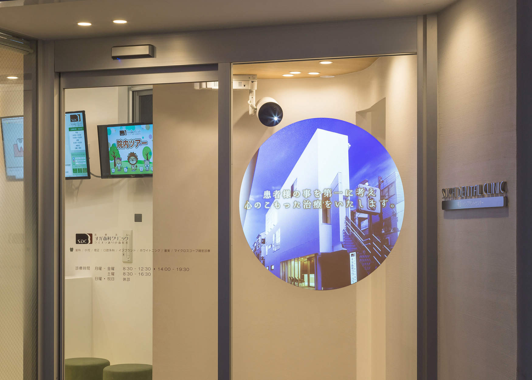 エントランス横のガラスに透過スクリーンシートを貼り、院内からの裏投影で道行く人へのサイネージとして活用しています。