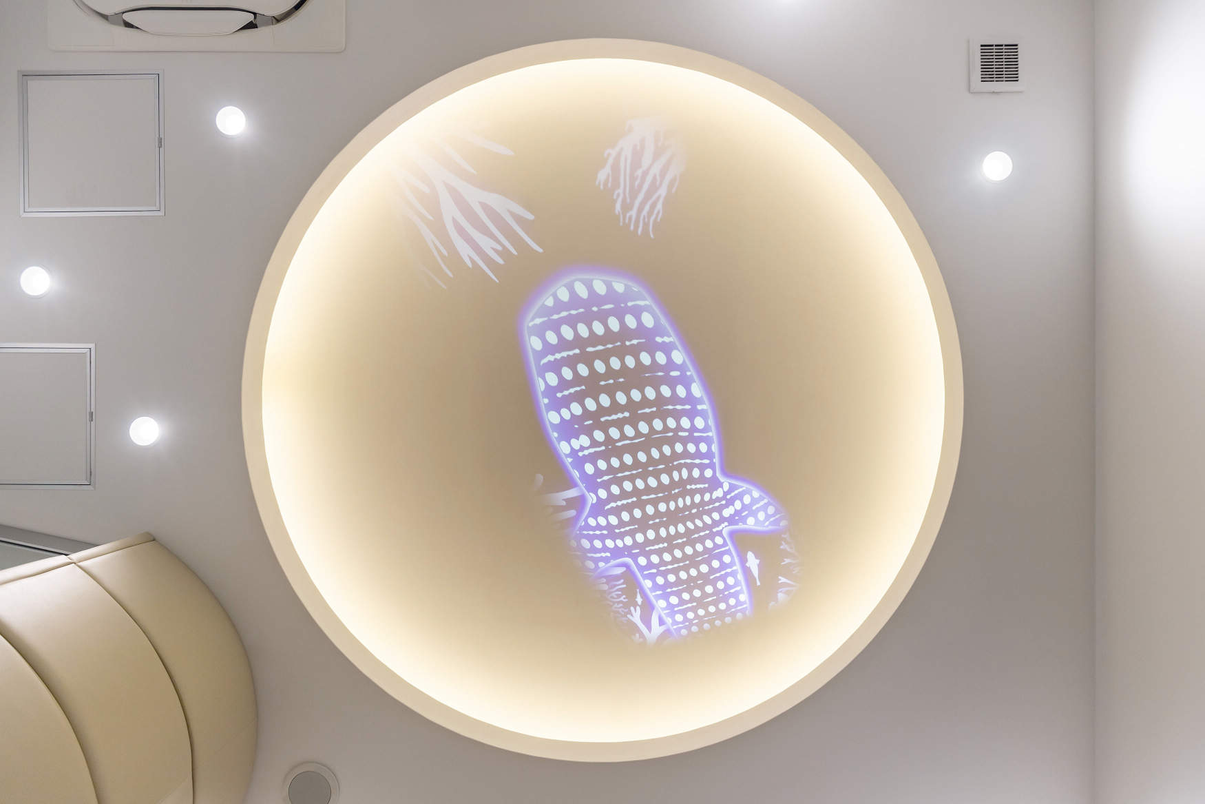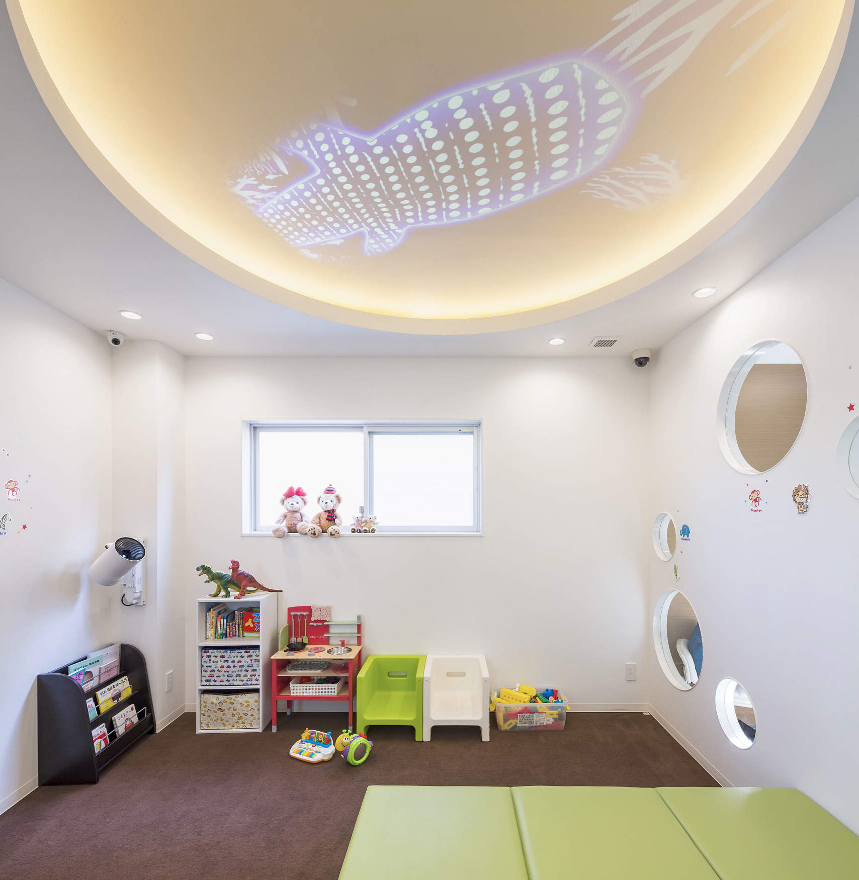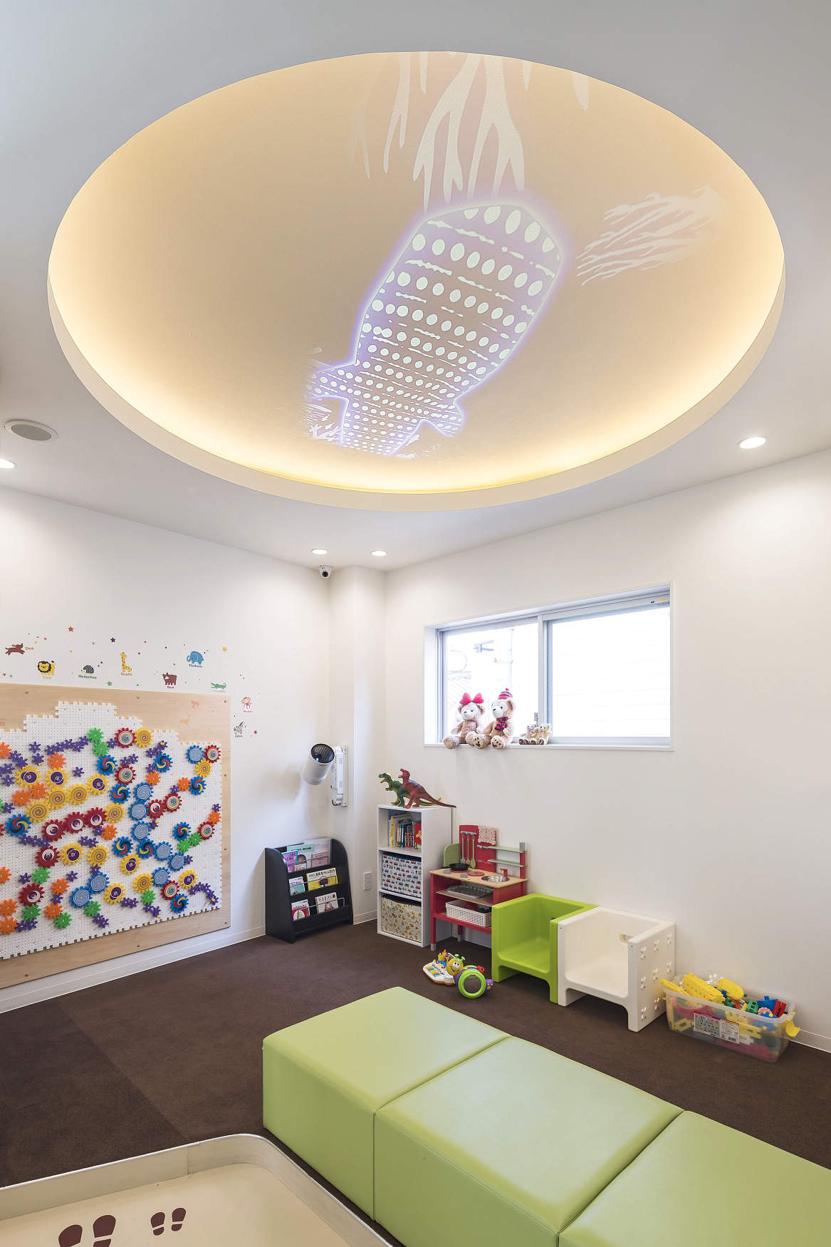 スペースプレーヤーを2台納入し、1台はエントランス横のガラスに院内から裏投影して道行く人へのサイネージとして活用し、もう1台はキッズルームの天井に多彩なコンテンツを投影して子どもが楽しめる空間を演出しています。