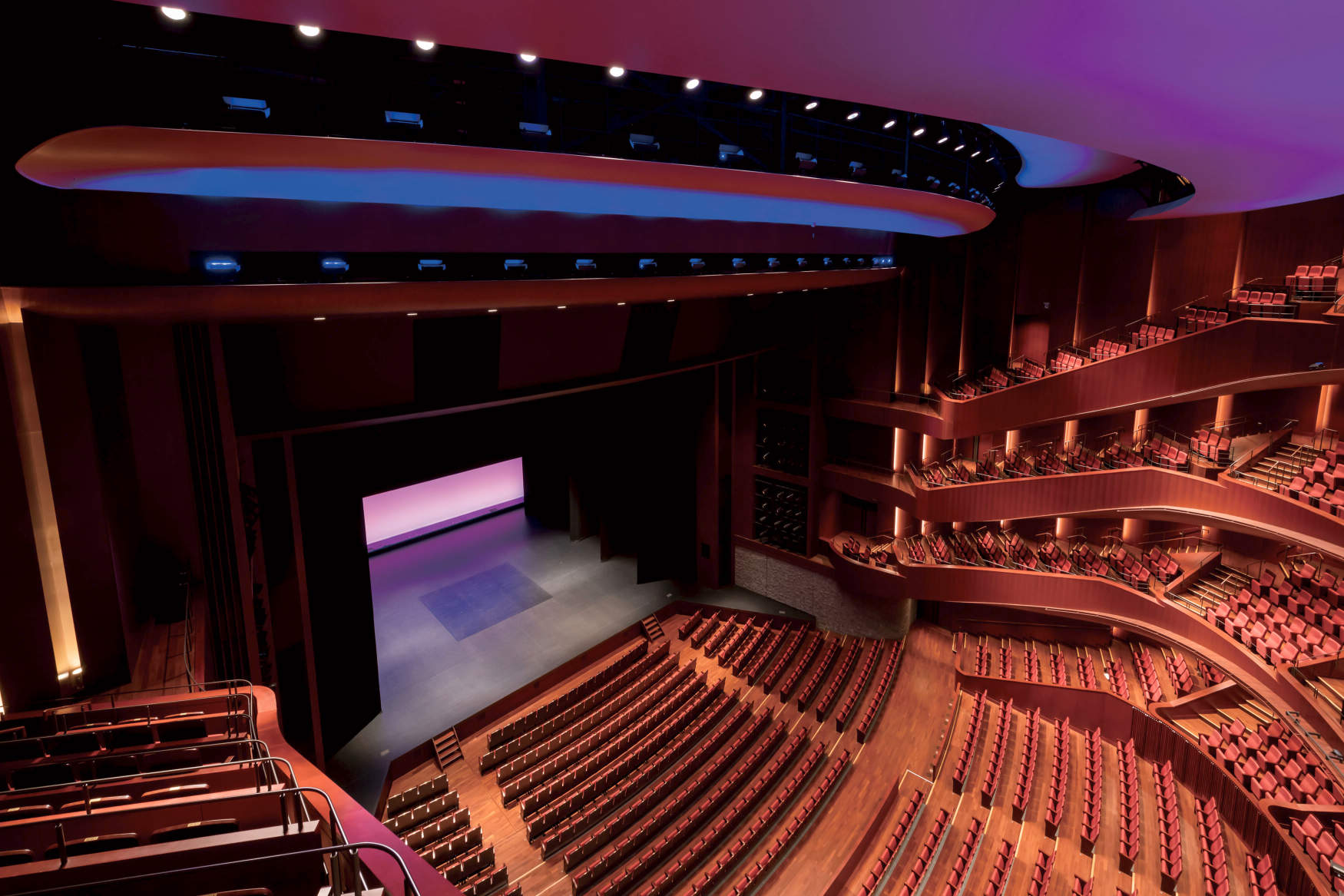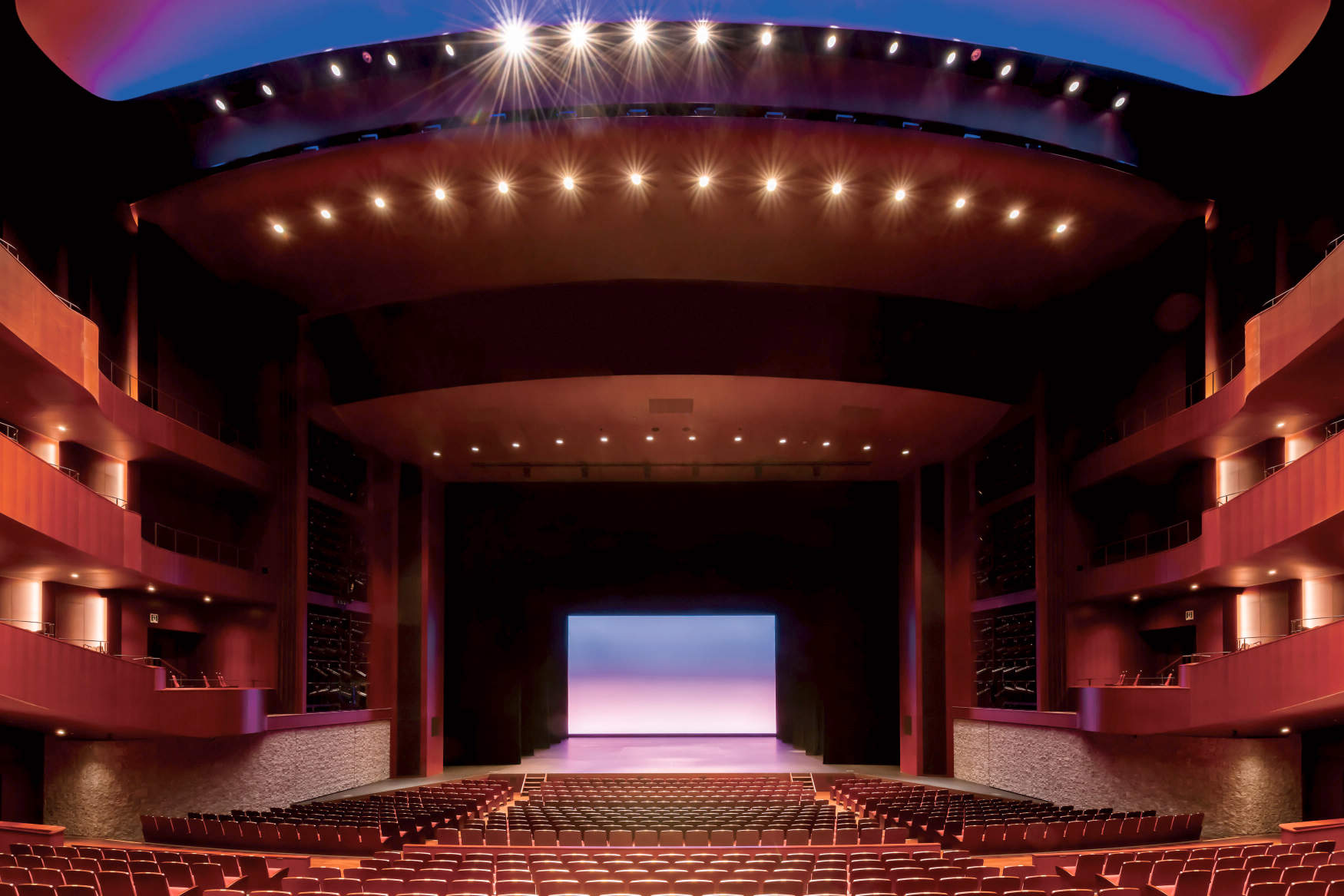 天井上部に設置するLEDフルカラー照明(RGBAW色、50W、ビーム角23°,60°×10°)により開演前から開演時の天井に雲のように浮かぶ反射板を一瞬消え行く残照のように淡い赤から紫へ、そして青色帯びた光に変わり、その余韻を残して消えていく演出を行うことでこれから始まるパフォーマンスへの期待感を一層膨らませて行きます。