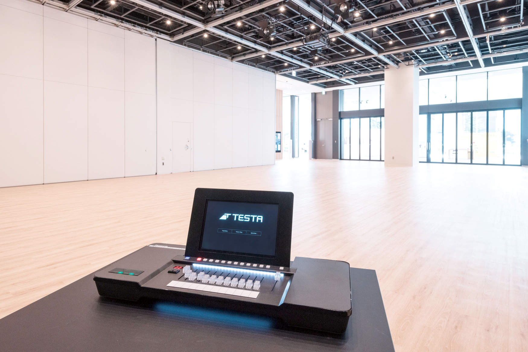 「SCARTSコート」は最大150人、床面積165㎡の空間にLEDシーリング調光(5~100%)タイプ(3000K、5660lm、48.1W、Ra85)を66台、LEDスポッライト調光(0~100%)タイプ(3000K、160W、Ra95)を10台設置し、床面照度約500~1000lxを確保しています。タッチ式ムービングライト操作卓により卓を使ったあらゆる演出操作が可能になっています。
