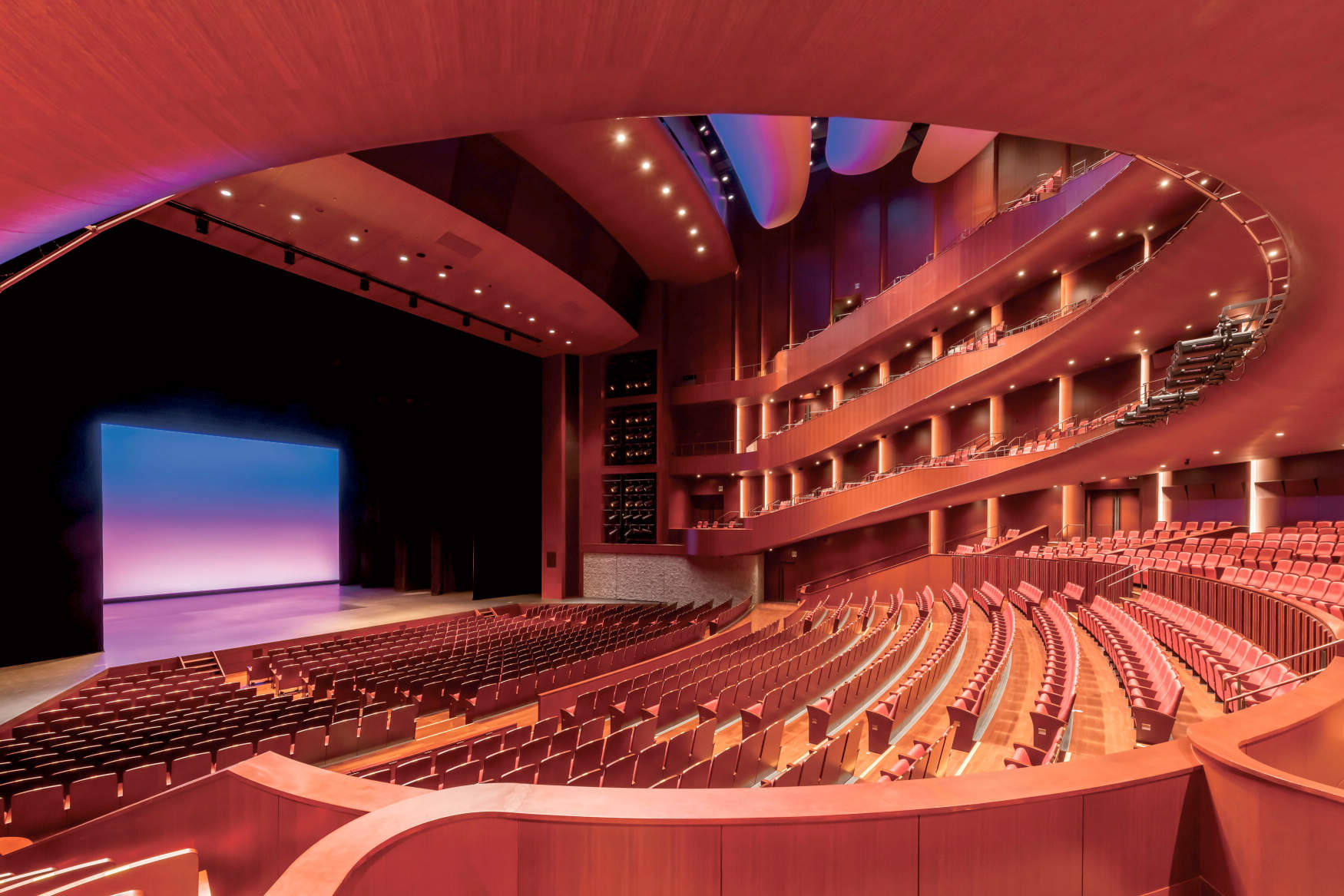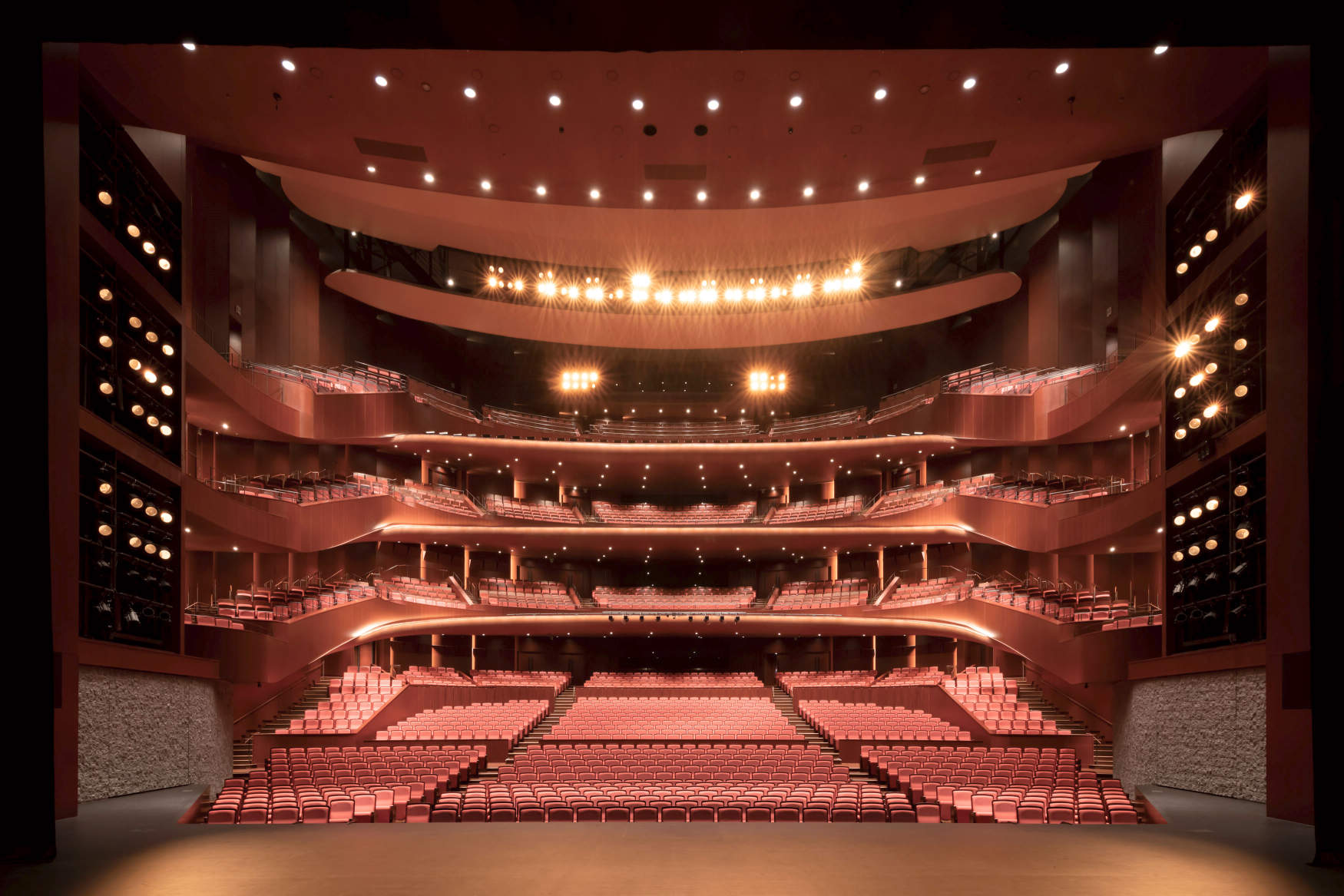 本施設の中核となる「札幌文化芸術劇場hitaru」のメイン劇場は2302席を備えた北海道初の多面舞台であり、4層吹抜けのホール内部の形状はすべて音響の為に構成されています。壁の角度やバルコニーの曲率、さらには高揚感を高める求心性の高い円形と音を拡げるための非円形の組み合わせなど究極の音空間が創出されています。客席の光はこの究極のラインと調和を考慮し、舞台だけではなく客席の鑑賞者やホール内装もより華やかに魅せる演出を行っています。