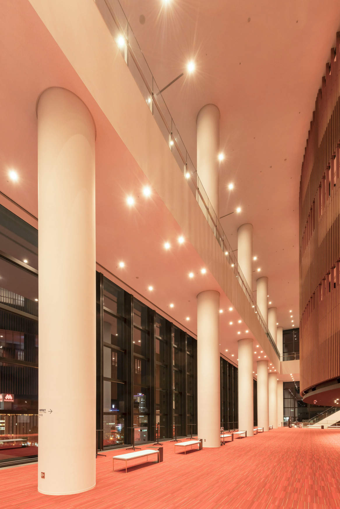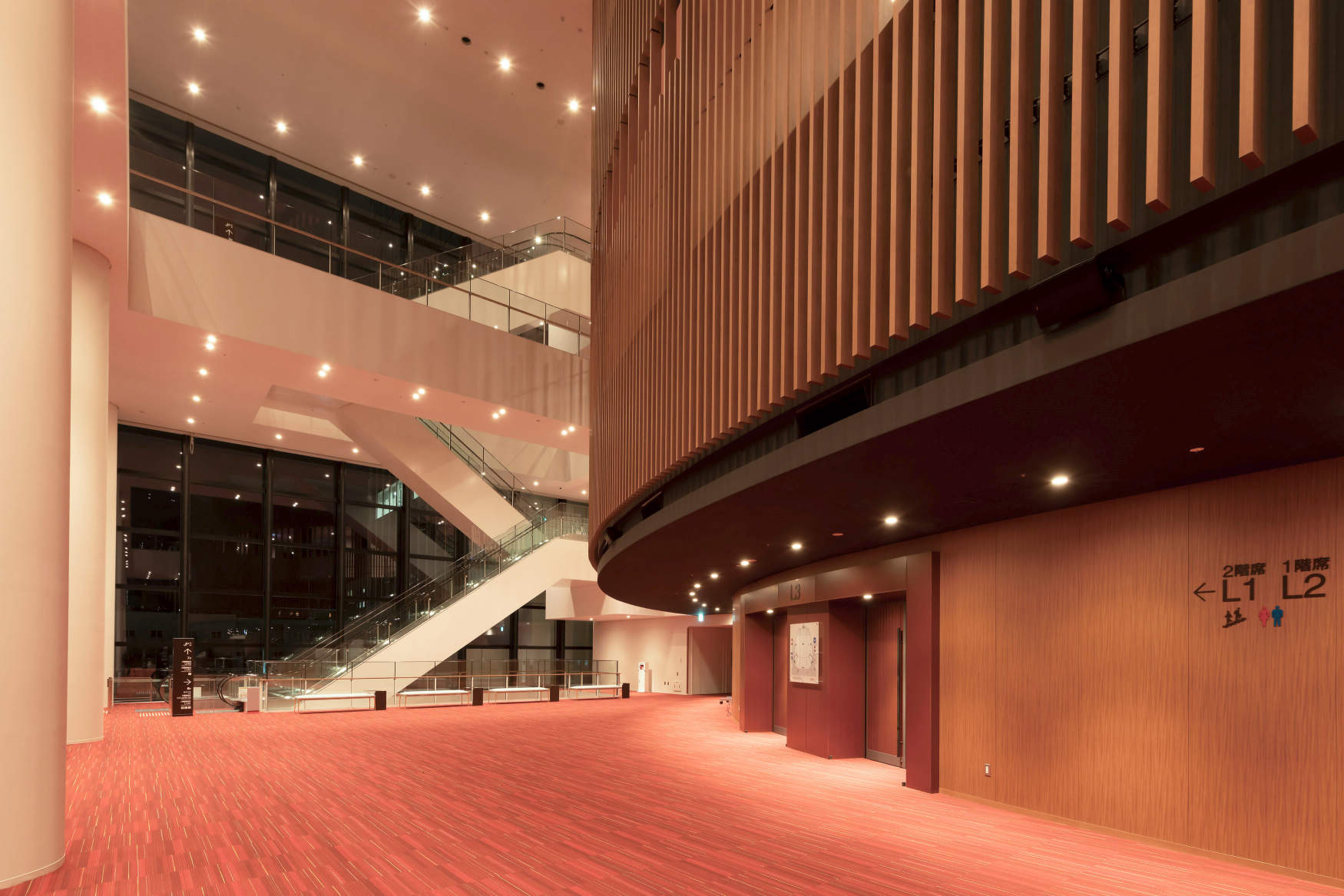 吹抜け空間にLEDダウンライトを配置し、ホワイエとして床面平均照度約150~200lxを確保しています。外部からもカーテンウォールと通して縦軸の木ルーバーで構成されたR形状のメイン劇場壁面を美しく見せています。