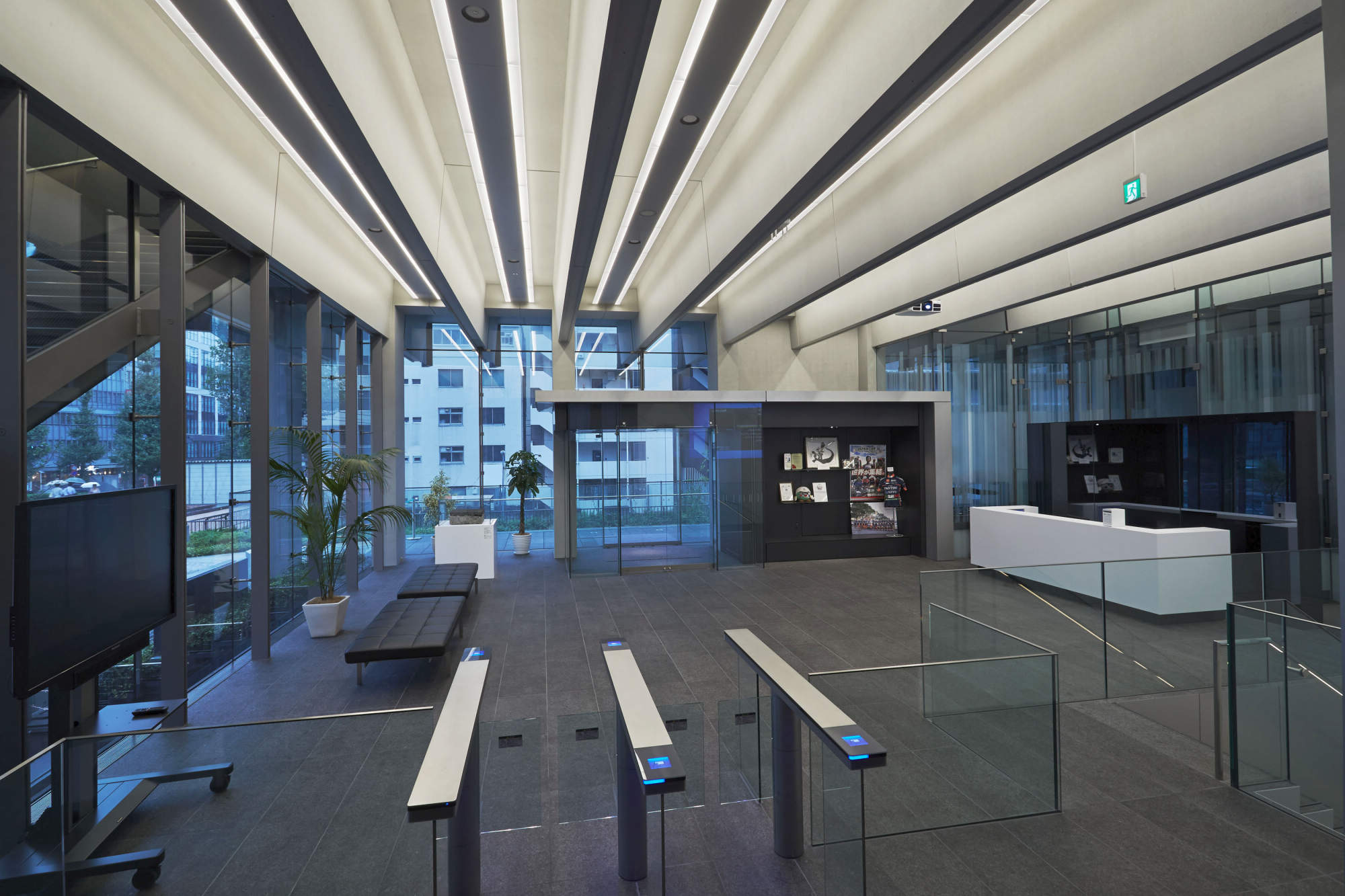 オフィスロビーは、PCa天井を照射する導光パネル照明を建築に組み込んで、梁間の天井、梁側面を上方配光の間接照明で明るく照らし、下方配光で床面の照度を確保しています。建築と照明が一体化した照明計画となっています。