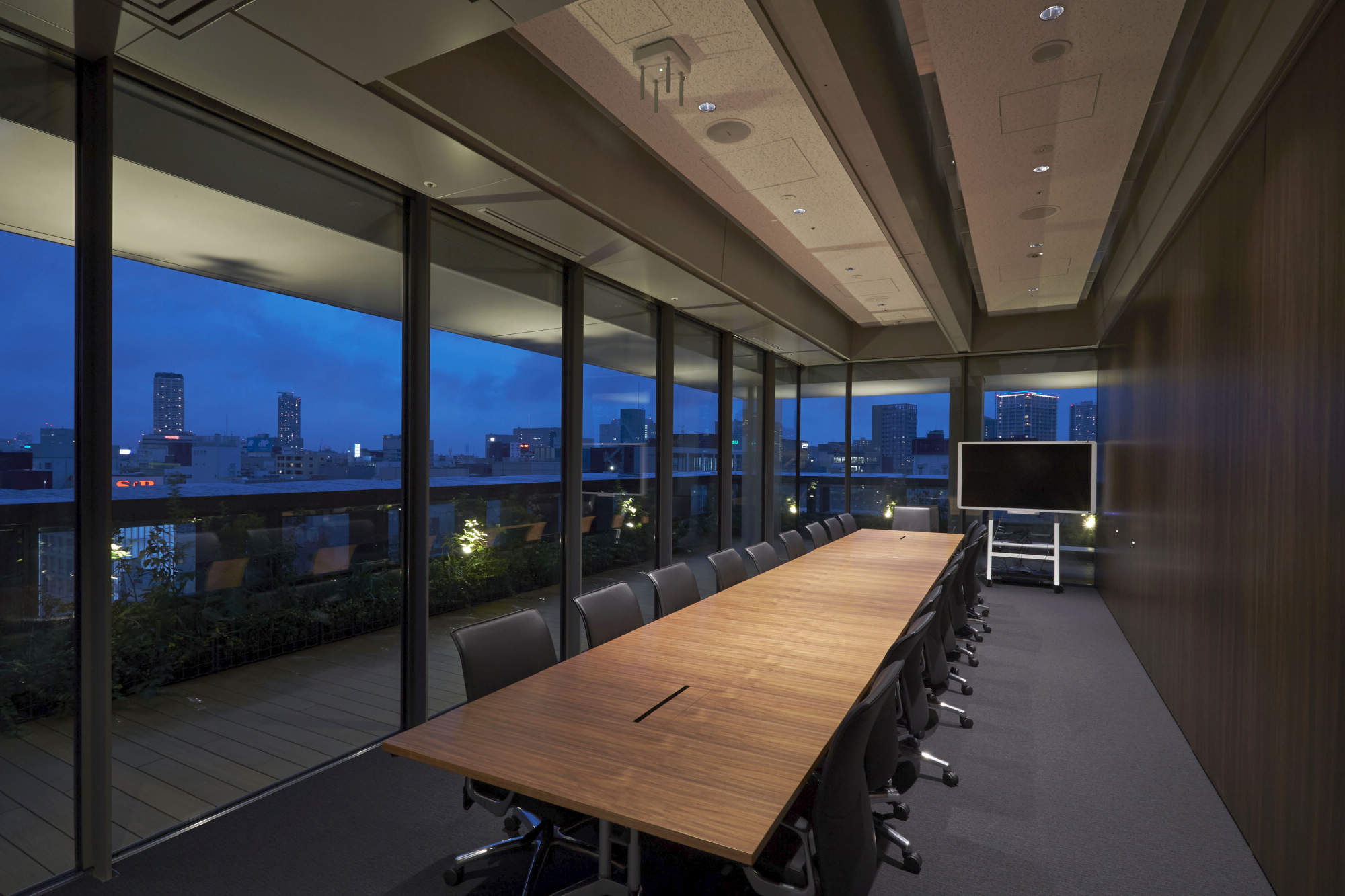 導光パネルは消灯すると透明になり、完全に存在感を消す。外部庇のバウンド光とグレアレスダウンライトの光は、都市の夜景-屋上テラス-会議室が一体となるような雰囲気を形成しています。