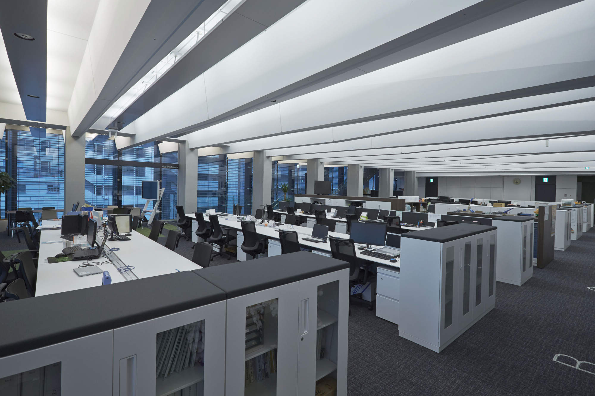 間接照明のみでオフィスに充分な照度を確保しつつ、照度以上の明るさ感と開放感を与え、均斉度が高く仕事のしやすい快適な光環境を実現しています。