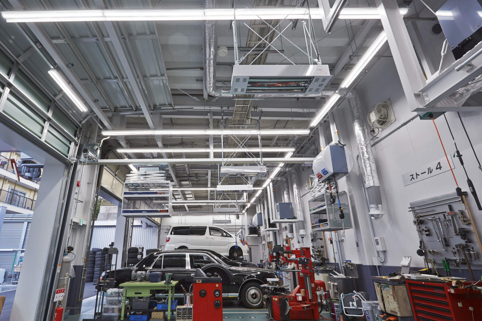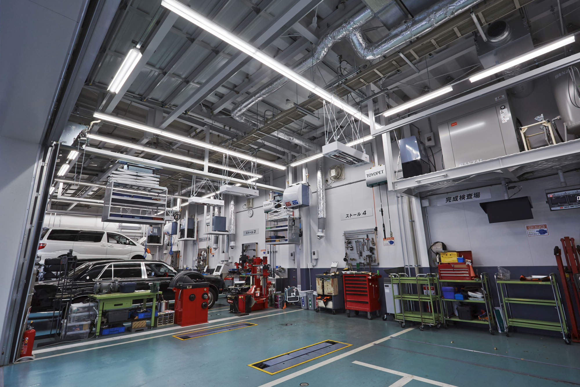 整備工場にはIDシリーズを導入。整備工場はベースの建物が以前と同じ作りのため、差がわかりやすく「パッと見ただけで明るくなったのがよくわかった。作業場は安全第一なので、必要な明るさが確保できてよかった」と高評価を頂いております。