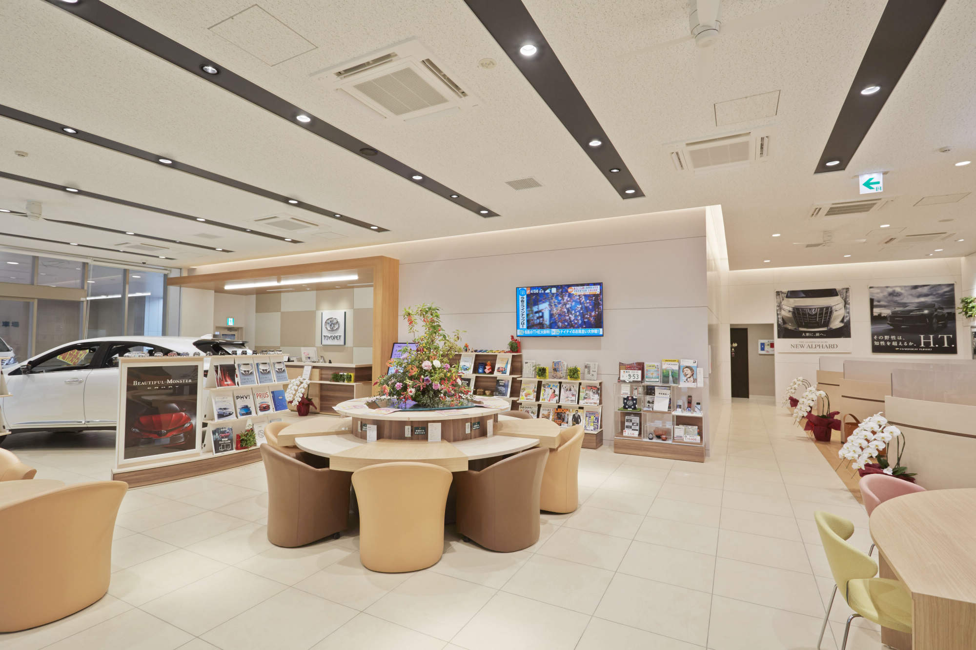 ショールームの照明には色温度4000KのLEDダウンライトを採用。色の再現性(演色性)が高く落ち着きのある色温度で、車選びや熱の入りやすい商談などで長時間滞在しても快適に過ごせる居心地のよい空間を演出しています。LEDのダウンライト導入後は、「屋内で見るボディの色が屋外で見る色と近い」と店舗スタッフからも好評です。
