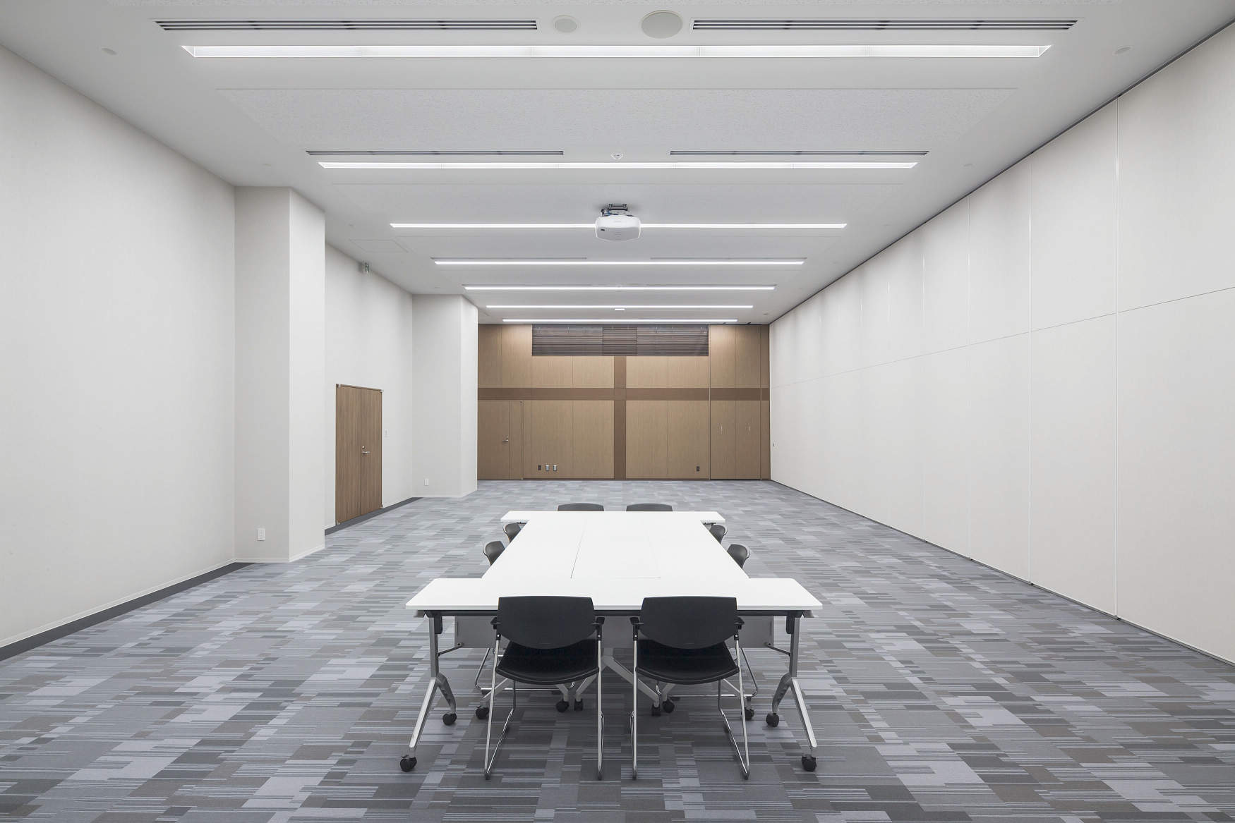 導光パネル式LEDベースライトをラインで配置しており最大机上面平均照度約1000lxを確保しながら、従来のLEDベースライトとは異なるスタイリッシュで、光源を見せないスリット照明として建築との一体感を成しています。