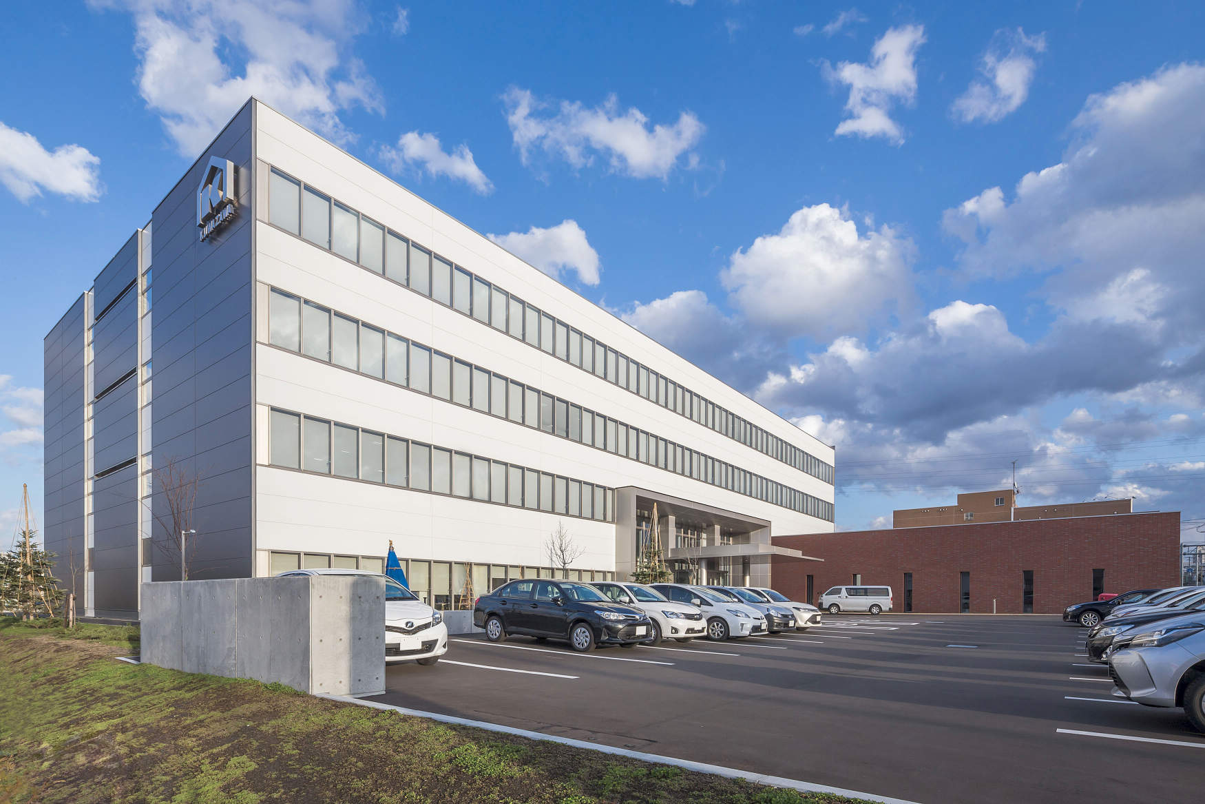 本施設は旧本社ビルが老朽化して手狭になったことから同一敷地内にある倉庫を取り壊し、その跡地に建設された新本社ビルです。鉄筋鉄骨4階建て、延床面積約7600㎡のオフイスビルであり、1階は吹き抜けエントランス、カフェテリア、大会議室及び書庫や倉庫を有し、中央EVより各階へアクセスを行います。2階から4階は事務室スペースが続き、4階の一部に社長室や応接室、役員会議室が配置されています。