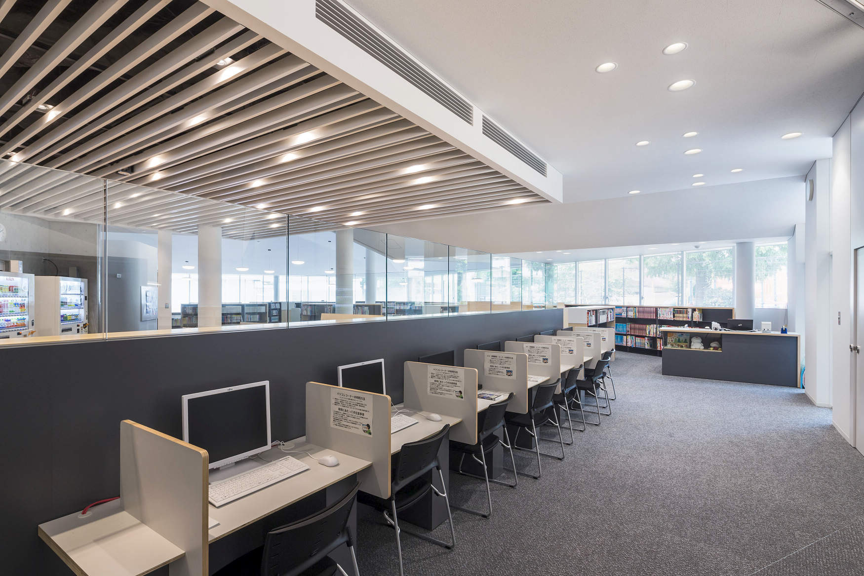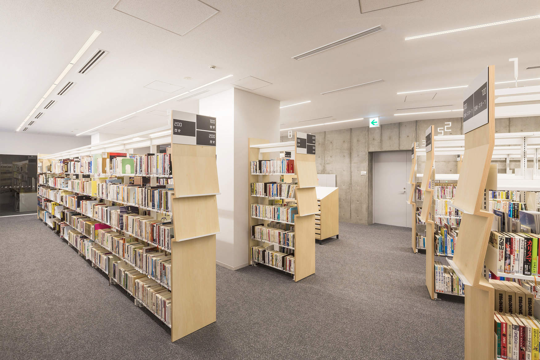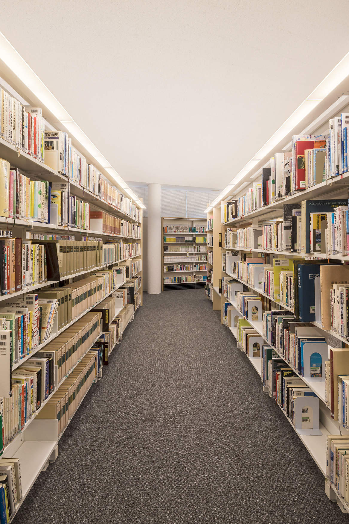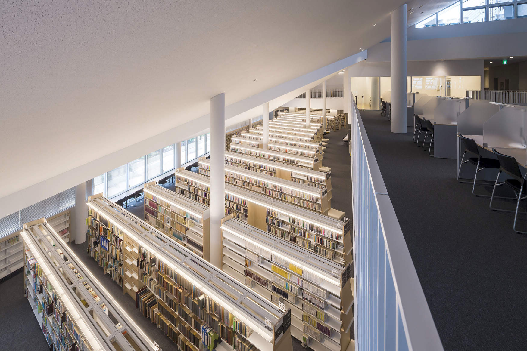 上下配光の導光板ブラケットによりダイナミックな傾斜天井はムラのない間接光を実現しています、書架面にも間接光と直接光によりムラのない照度を確保しています。導光板ブラケットは書架の幅に合わせたL900、色温度は3500Kの特注仕様になっています。