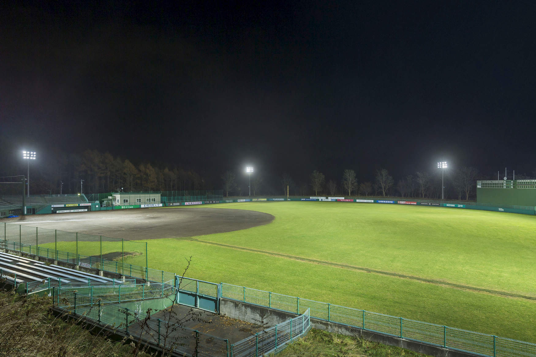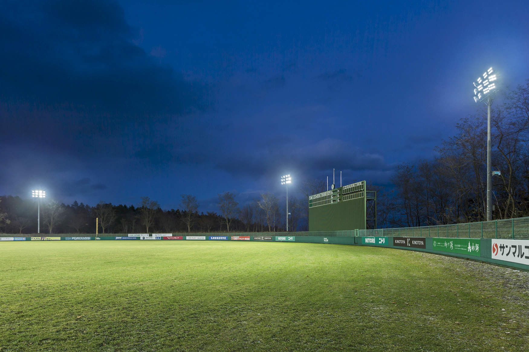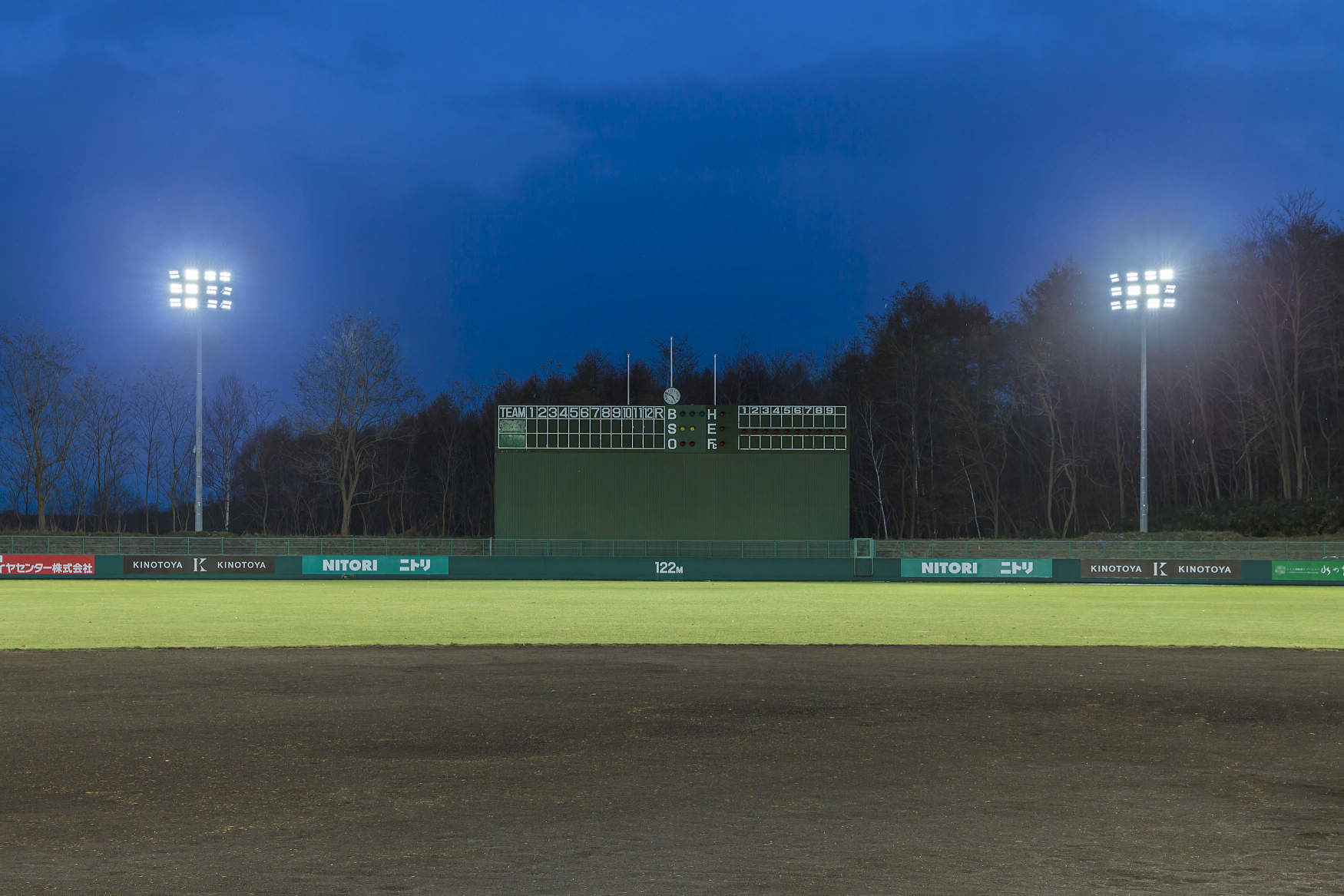 札幌スタジアムは世界的なクロスカントリースキーコースで知られる白旗山の山麓,緑豊かな札幌市清田区真栄に位置する野球場です.かつて社会人野球チームの専用球場だったこともあり,両翼99m,中堅122mの申し分ない広さに加え,フェンスにはケガ防止のためにラバーが張られ,バックスクリーン,スコアボードのBSO/HEFc表示,放送設備,クラブハウスもある本格的な野球場です.慢性的に不足している硬式野球大会が開催可能な野球場としての使命はもちろん,軟式野球大会,朝野球大会の会場,そして野球少年,少女ら青少年の育成に微力ながら貢献したいとの思いで建てられた民間の施設です.