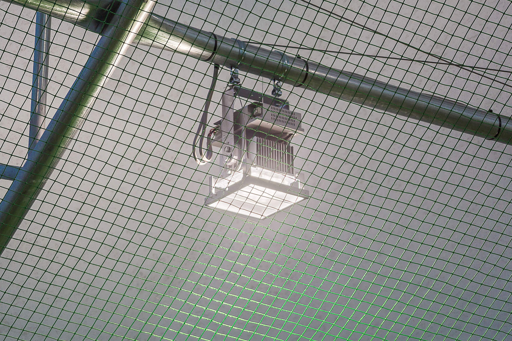 室内練習場の照明設備は,メタルハライドランプ400形相当のLED高天井器具(定格出力初期光束補正型,5000K,Ra70,21200lm,170W)を28台使用し,フットサルのレクリエーションレベルのJIS基準200lxより1ランク上の平均水平面照度300lx確保しています。