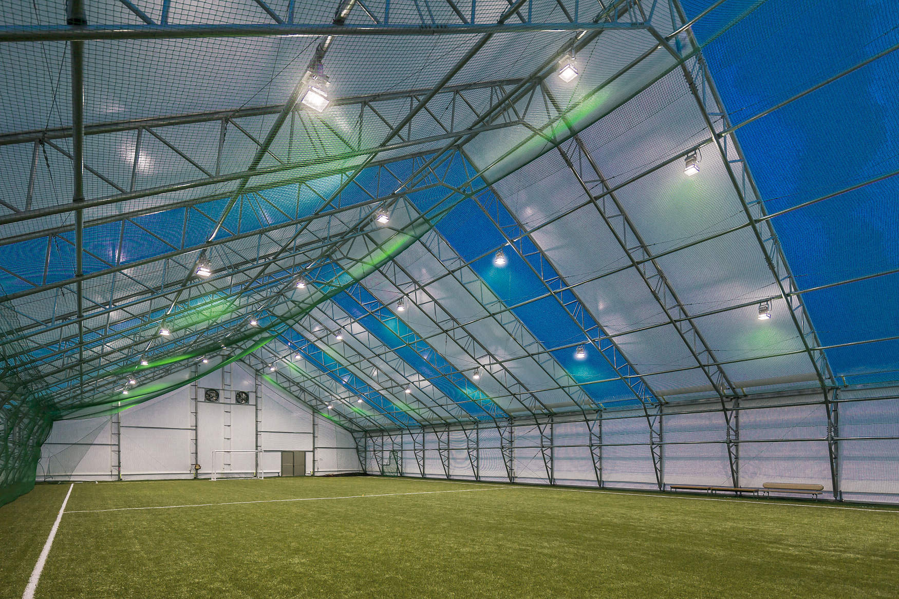 天井に透過性の高い幕を使用することで、日中は外光を積極的に取り入れ、開放感が高い環境でプレイができるテント構造の施設となっています。