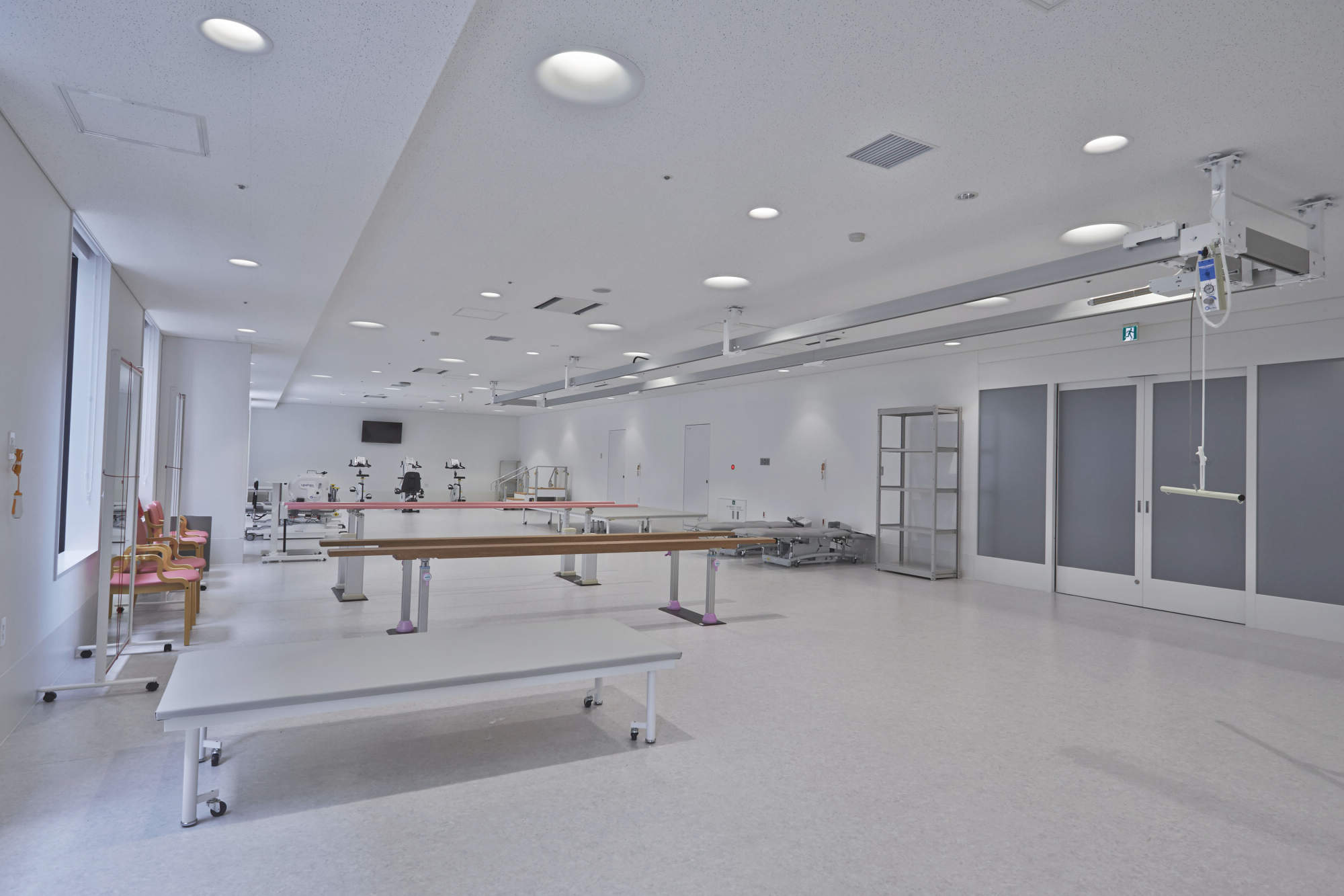 リハビリテーションルームには柔らかなソフトライトが採用されています。さらに、器具の大きさを変えてランダムに配置することによって、活気のある楽しい空間づくりでリハビリに取り組んで貰えるようにしています。