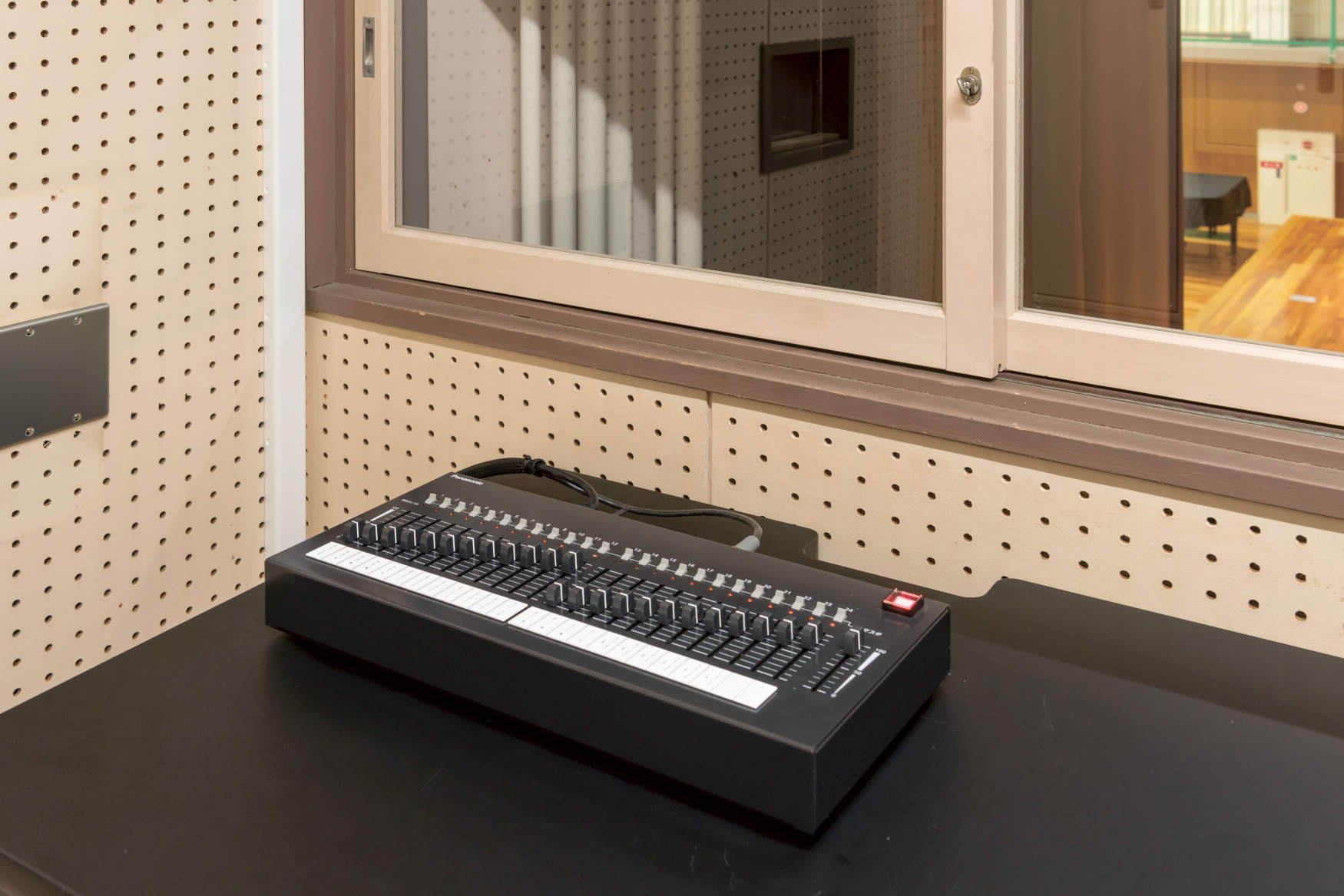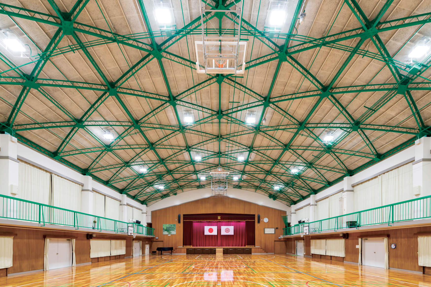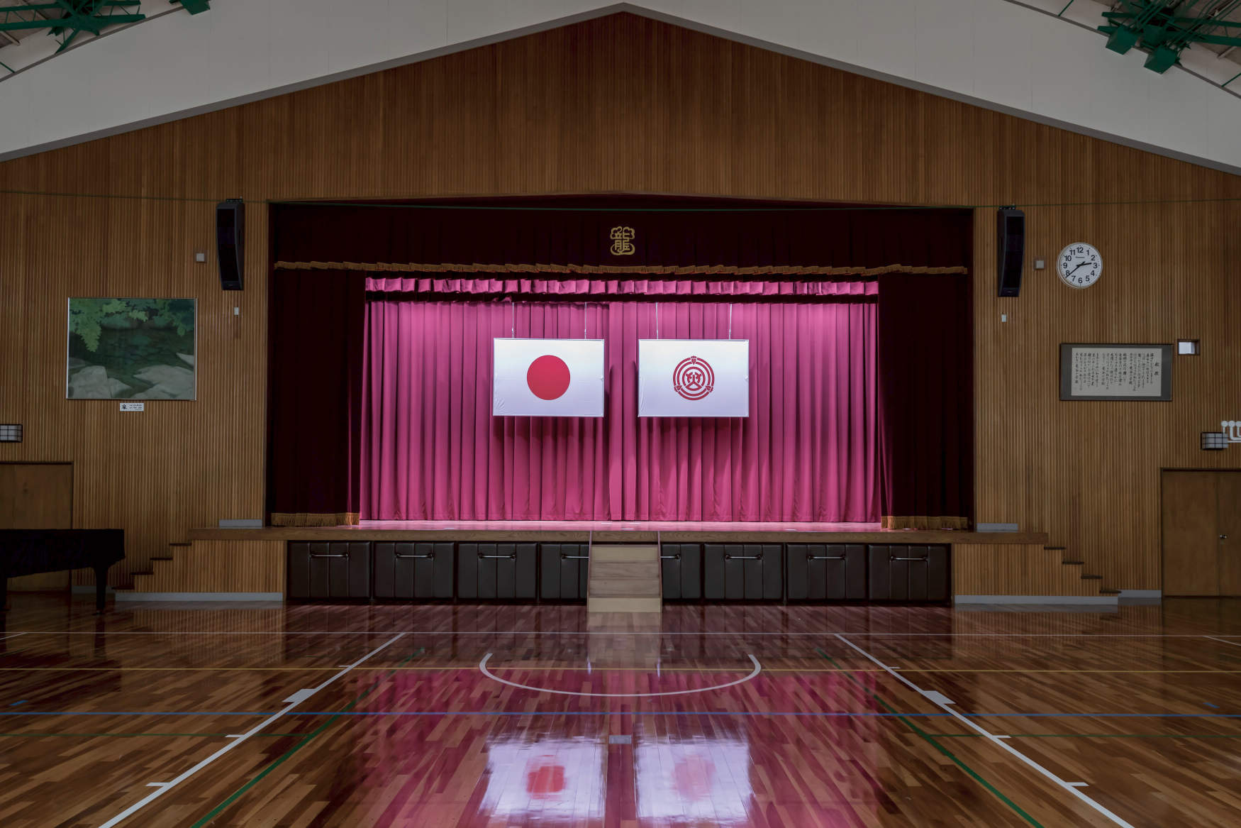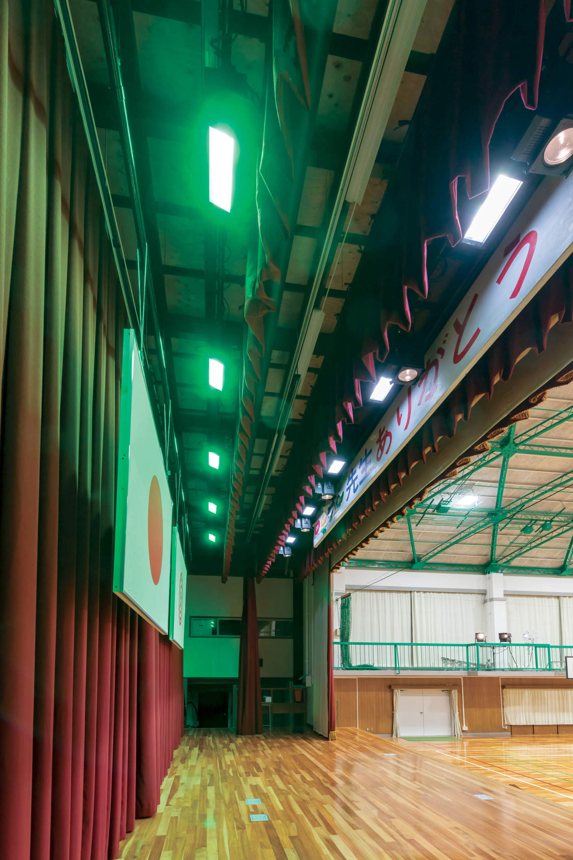 屋内運動場改修に伴いLED化しました。舞台間口11m、奥行3.6m、高さ5.0m。