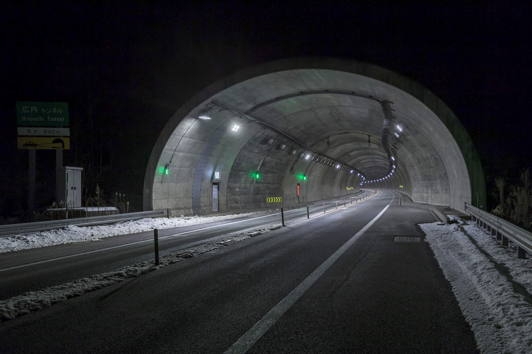 - 広内トンネルは道東自動車道に位置する延長944mのトンネルです。既設照明(高圧ナトリウムランプ)は1.6cd/㎡設計ですが、内器交換(LED化)では3.2cd/㎡で設計されたため、非常に明るくなり、走行しやすくなりました。寒冷地域(-30度設計)で初めて採用された高速自動車道のLEDトンネル照明器具であります。LED光源は、長寿命、高演色、昼白色(90,000h、Ra70、5000K)であるため、既設の高圧ナトリウムランプ(24,000h、Ra25、2,050K)と比較して、飛躍的に視環境が向上し、省エネ性、メンテナンスの向上もはかれています。なお、入口照明の高光束の器具に関してはLED改修しておりません。