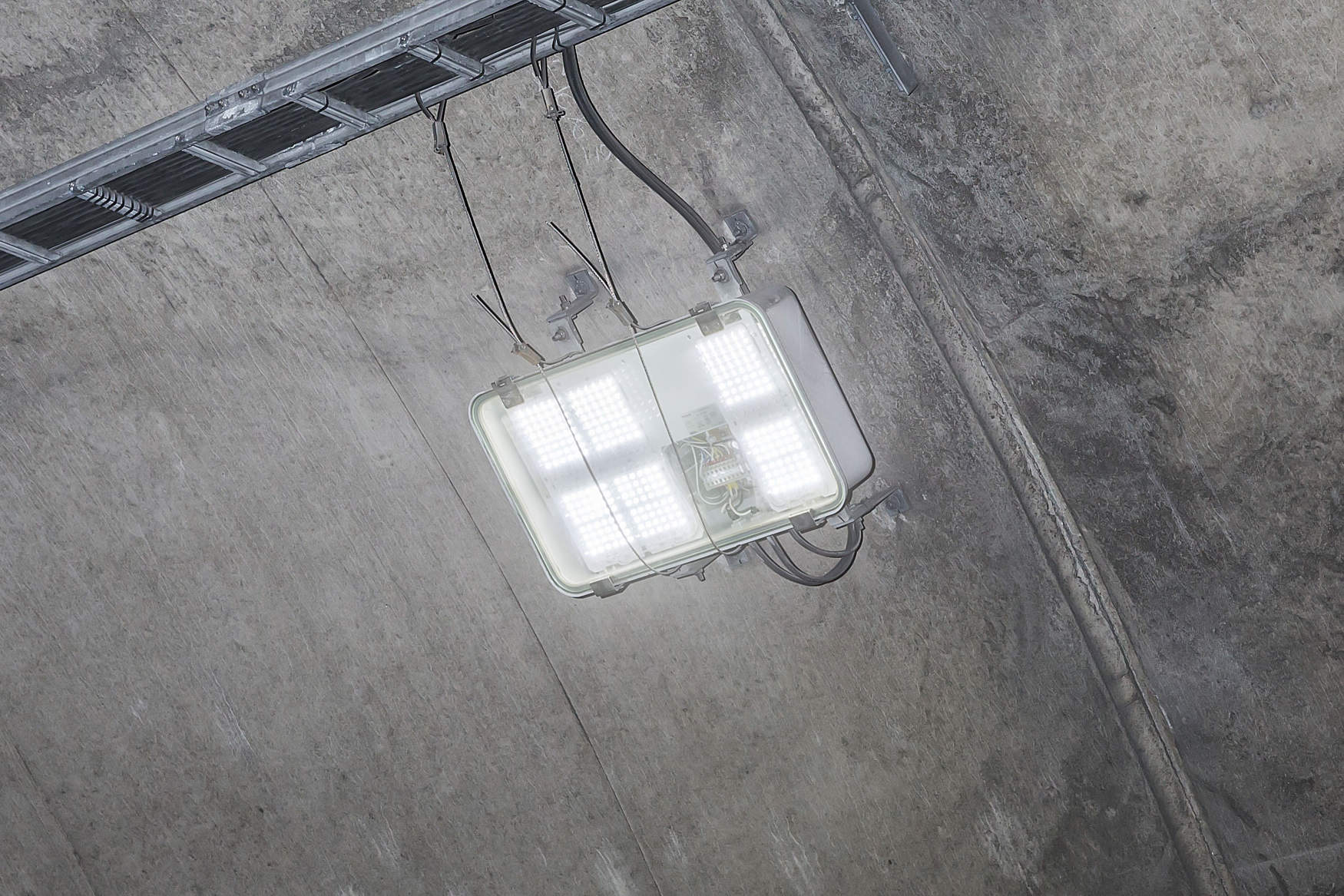 広内トンネルは道東自動車道に位置する延長944mのトンネルです。既設照明(高圧ナトリウムランプ)は1.6cd/㎡設計ですが、内器交換(LED化)では3.2cd/㎡で設計されたため、非常に明るくなり、走行しやすくなりました。寒冷地域(-30度設計)で初めて採用された高速自動車道のLEDトンネル照明器具であります。LED光源は、長寿命、高演色、昼白色(90,000h、Ra70、5000K)であるため、既設の高圧ナトリウムランプ(24,000h、Ra25、2,050K)と比較して、飛躍的に視環境が向上し、省エネ性、メンテナンスの向上もはかれています。なお、入口照明の高光束の器具に関してはLED改修しておりません。