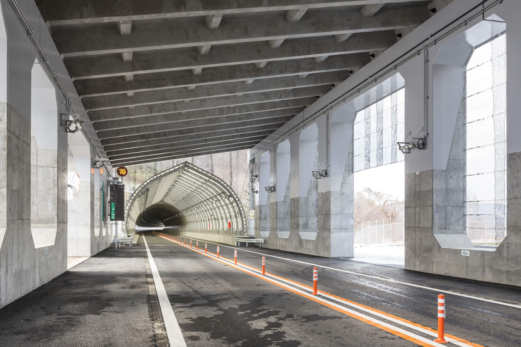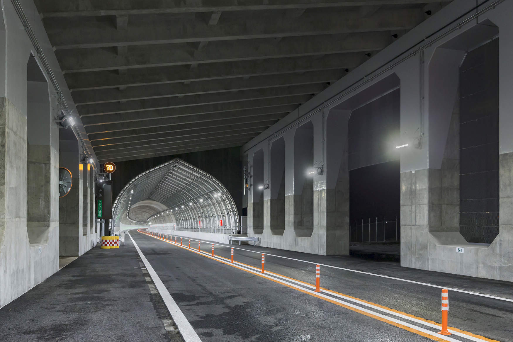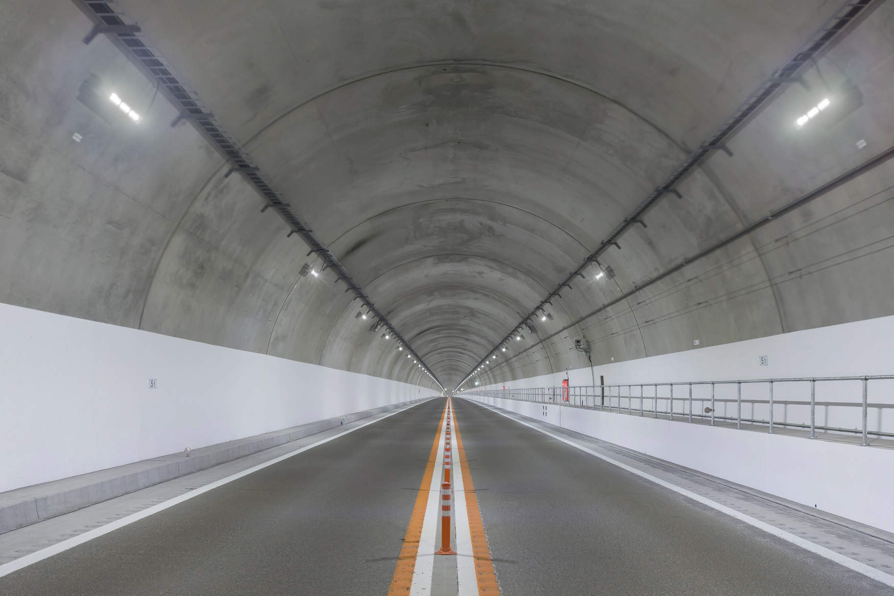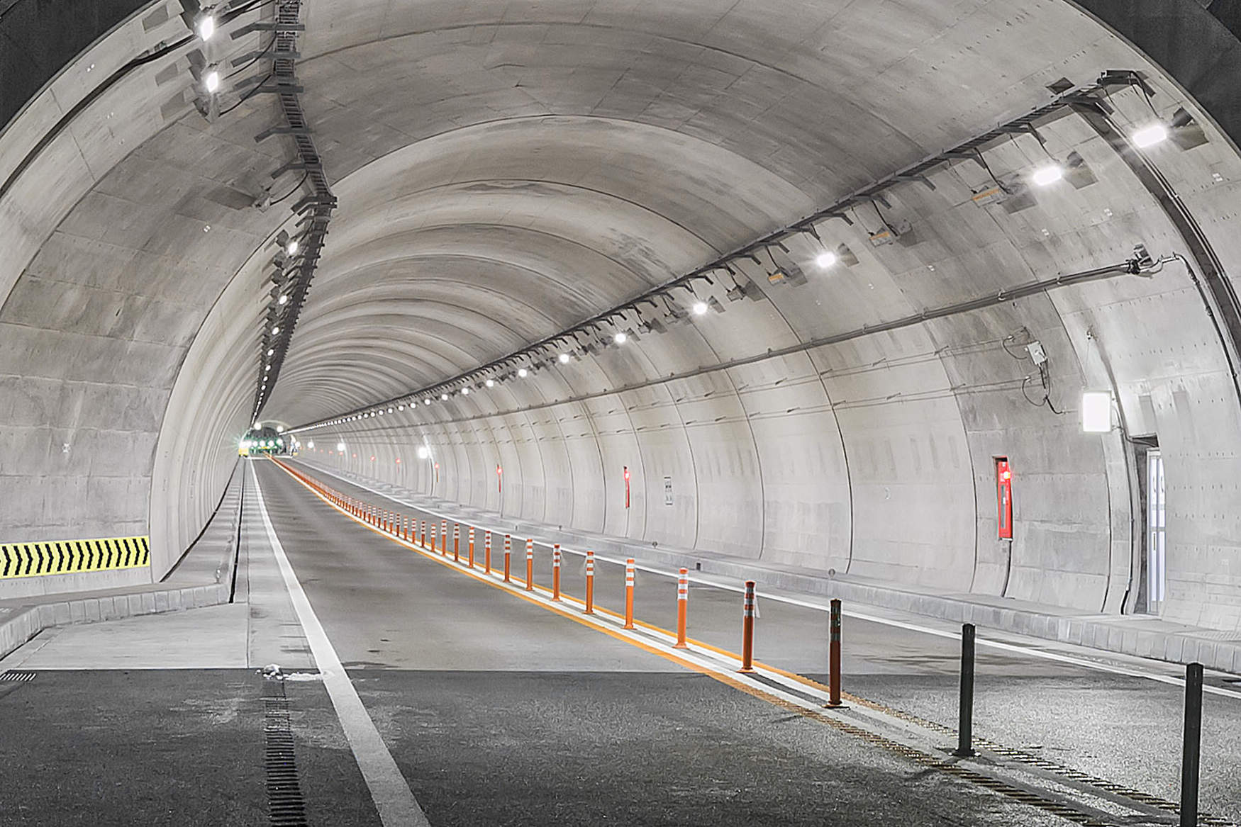 区間内に8本のトンネルがあり、スリム型LEDトンネル照明器具を採用しました。アルミ本体の採用により、従来器具に比べて質量を65%低減(基本照明の場合)、施工性を向上し、落下などの危険性を軽減しています。また、11段個別調光制御を採用することで視環境の向上および省エネを実現し、制御異常と不点状態を自動監視して不点が生じた場合には周囲の器具の調光率を調整することで、メンテナンスの軽減と安全性の向上も実現しています。