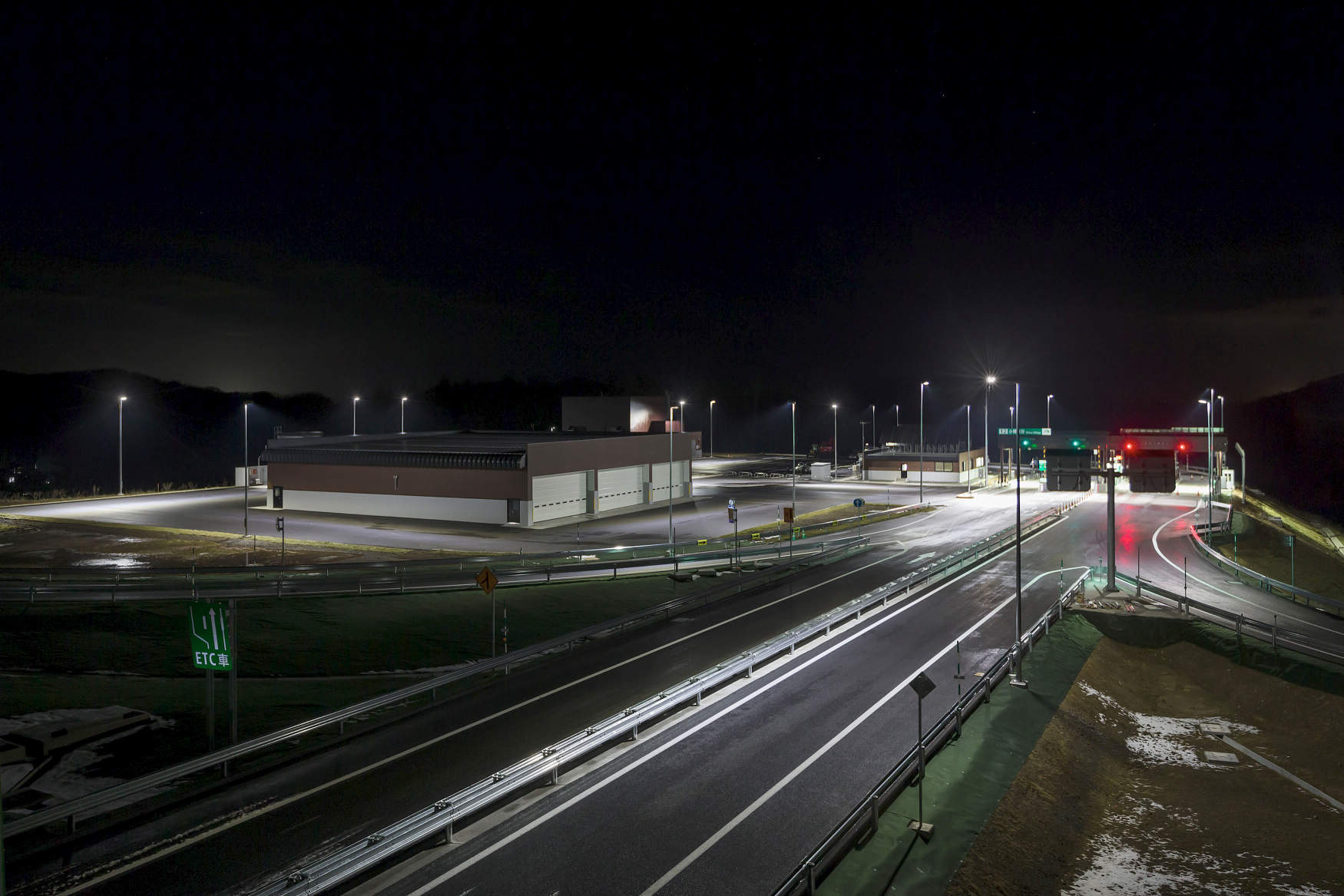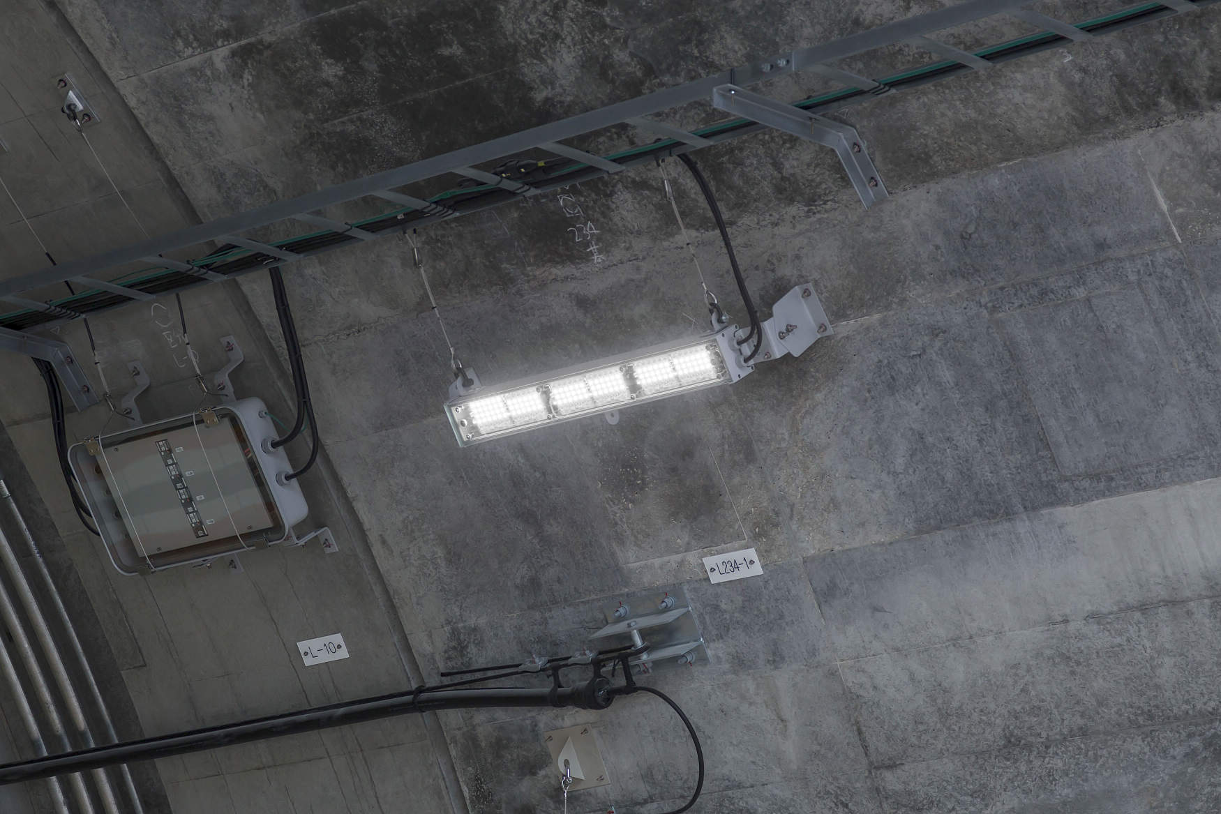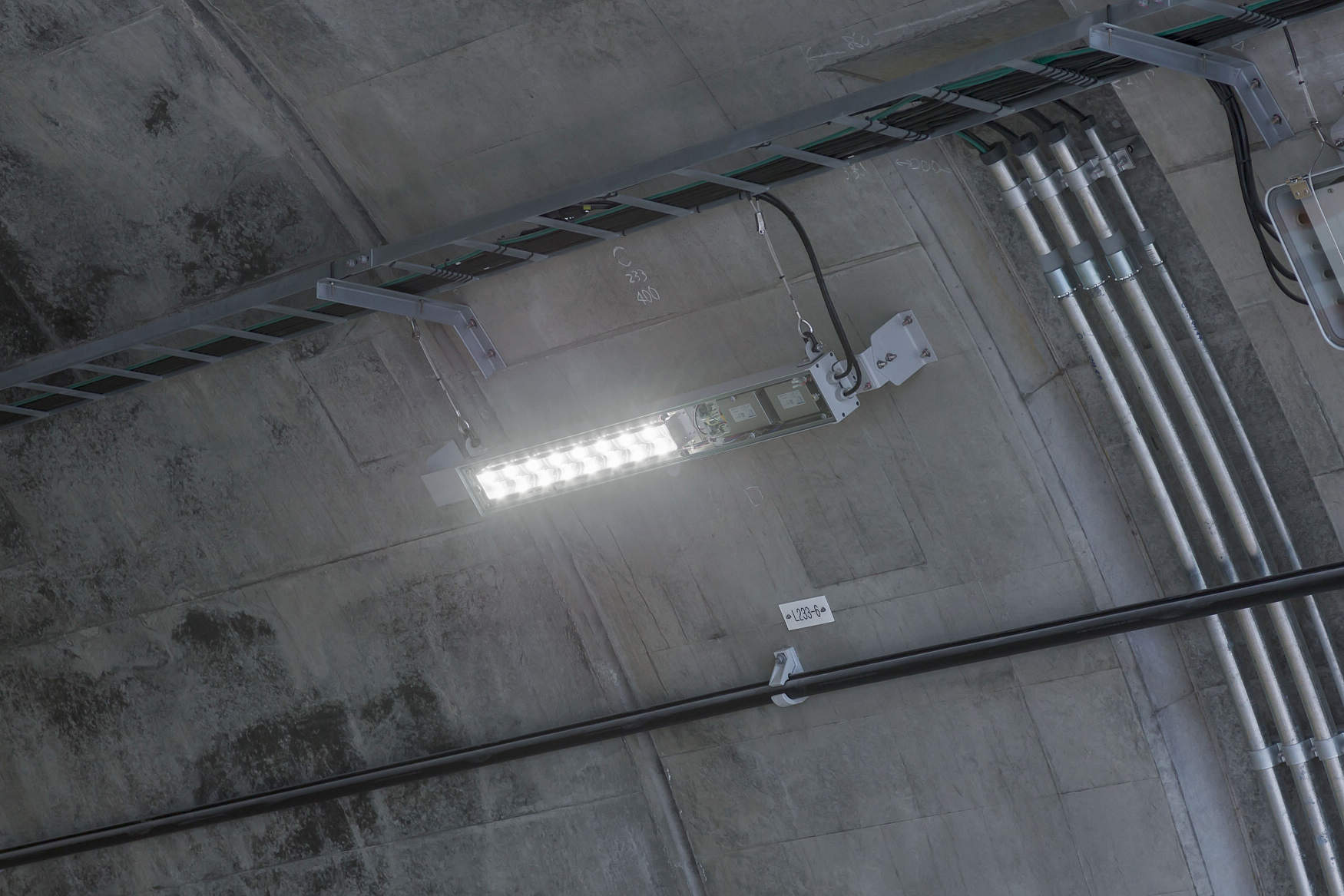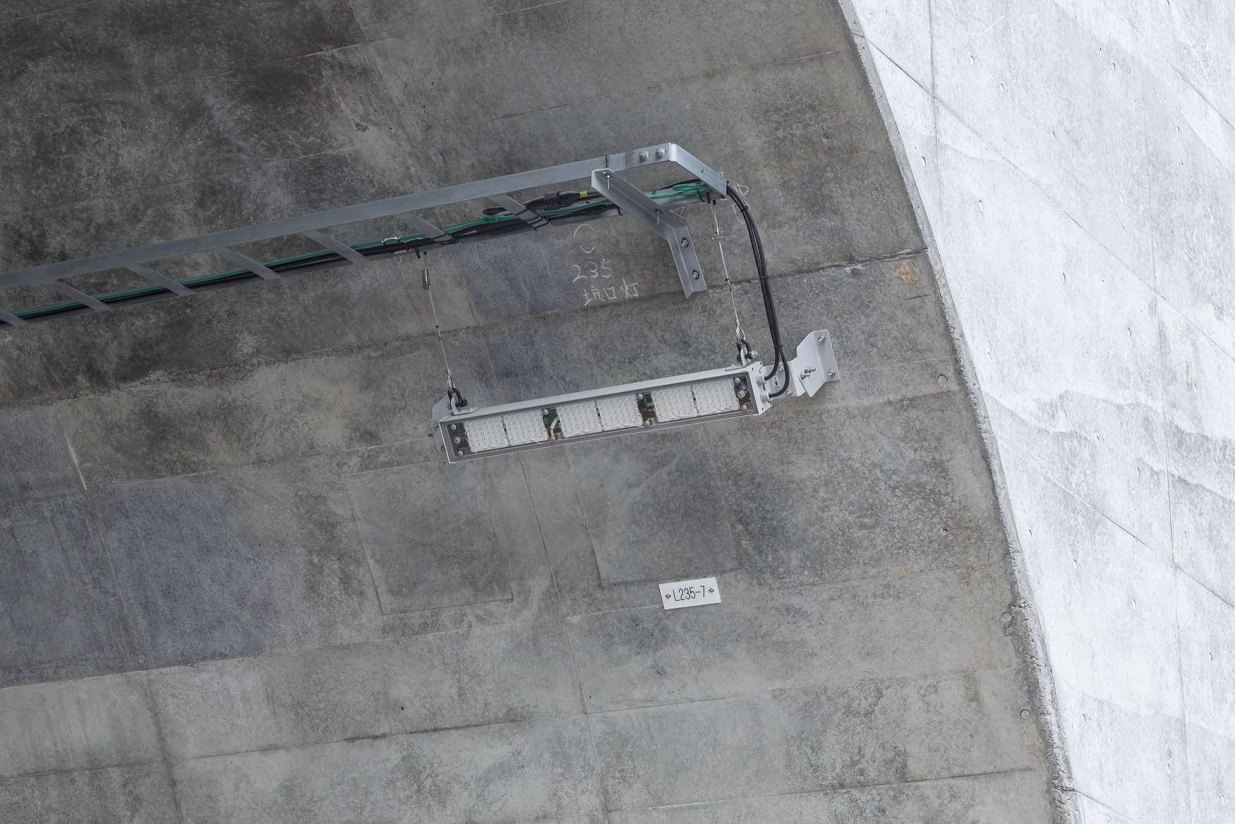 区間内に8本のトンネルがあり、スリム型LEDトンネル照明器具を採用しました。アルミ本体の採用により、従来器具に比べて質量を65%低減(基本照明の場合)、施工性を向上し、落下などの危険性を軽減しています。また、11段個別調光制御を採用することで視環境の向上および省エネを実現し、制御異常と不点状態を自動監視して不点が生じた場合には周囲の器具の調光率を調整することで、メンテナンスの軽減と安全性の向上も実現しています。