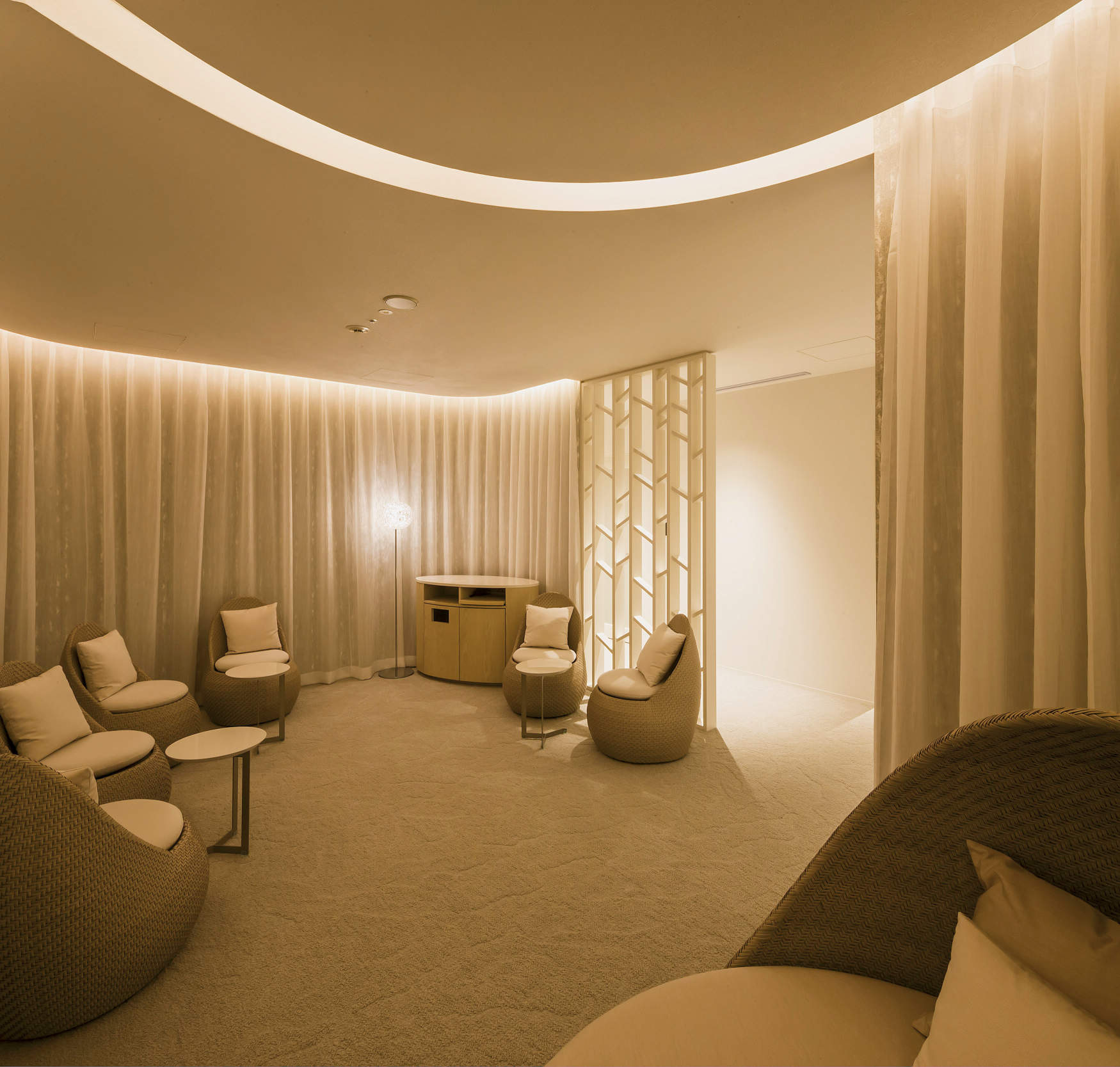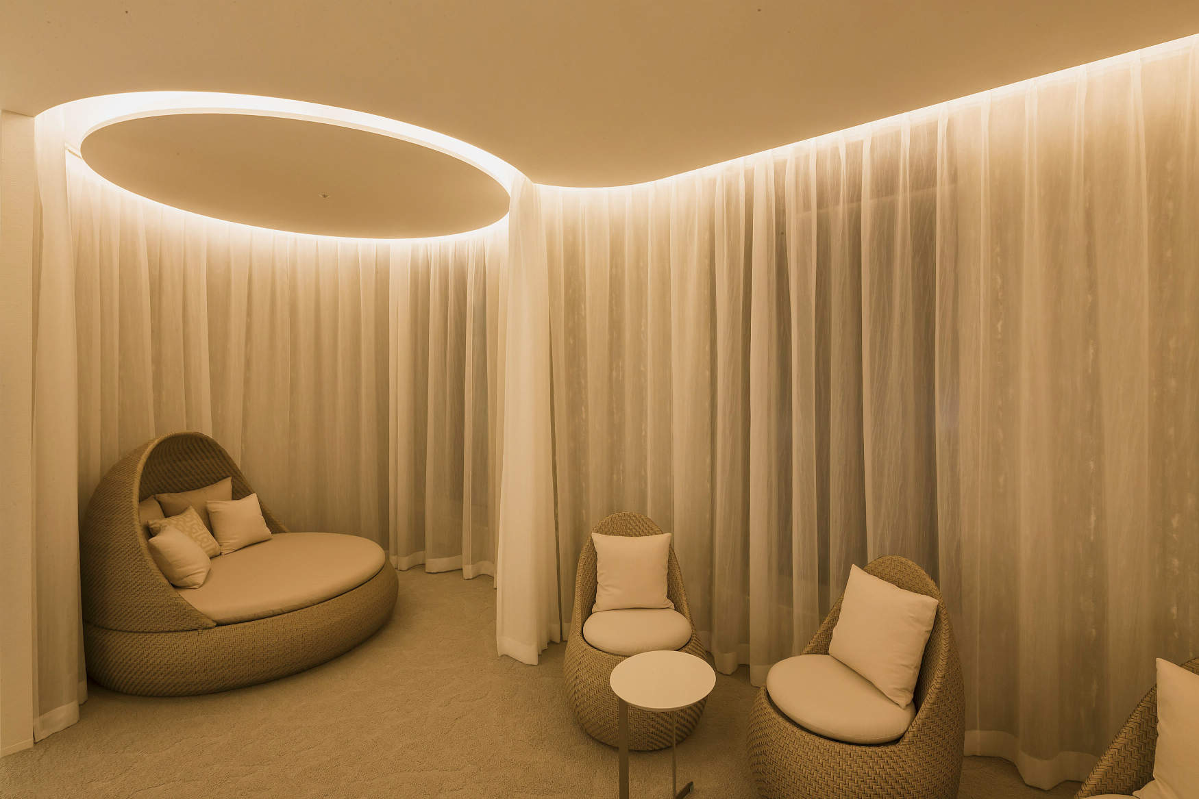 フロント後ろ壁面オブジェはインテリアのライン照明で優しく照射