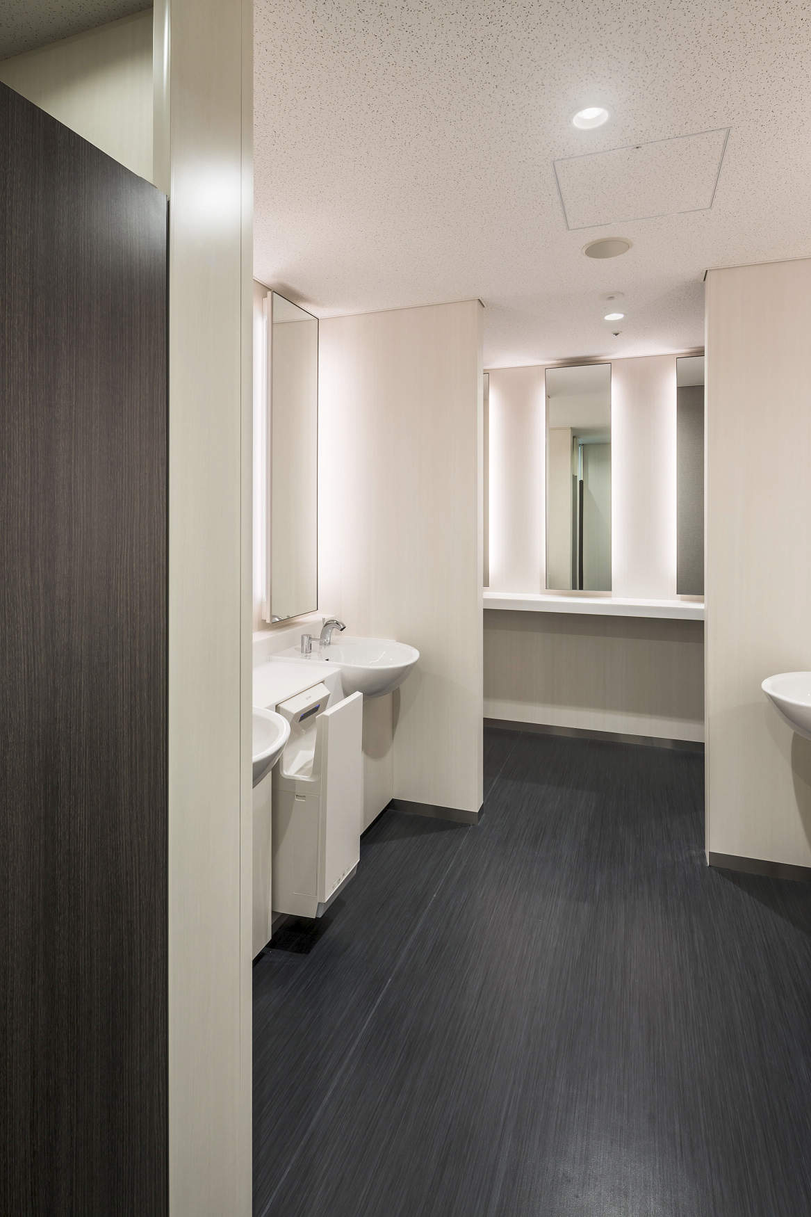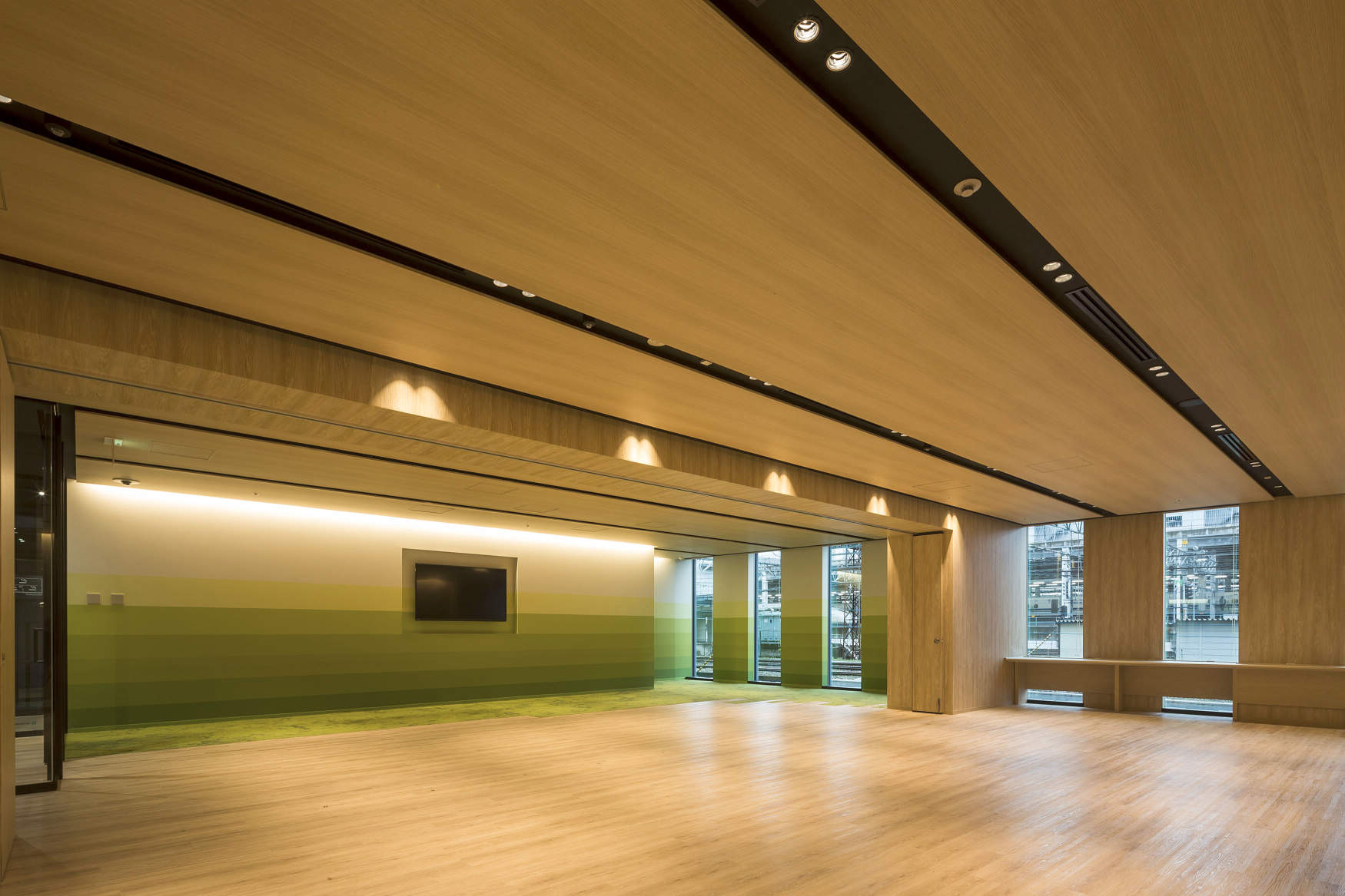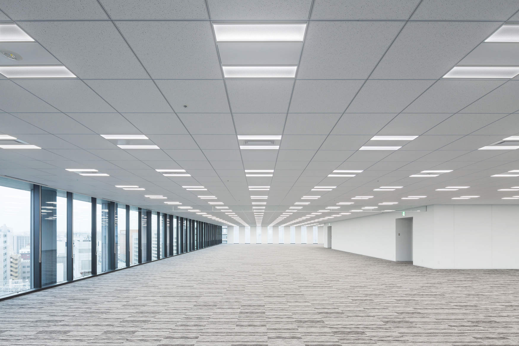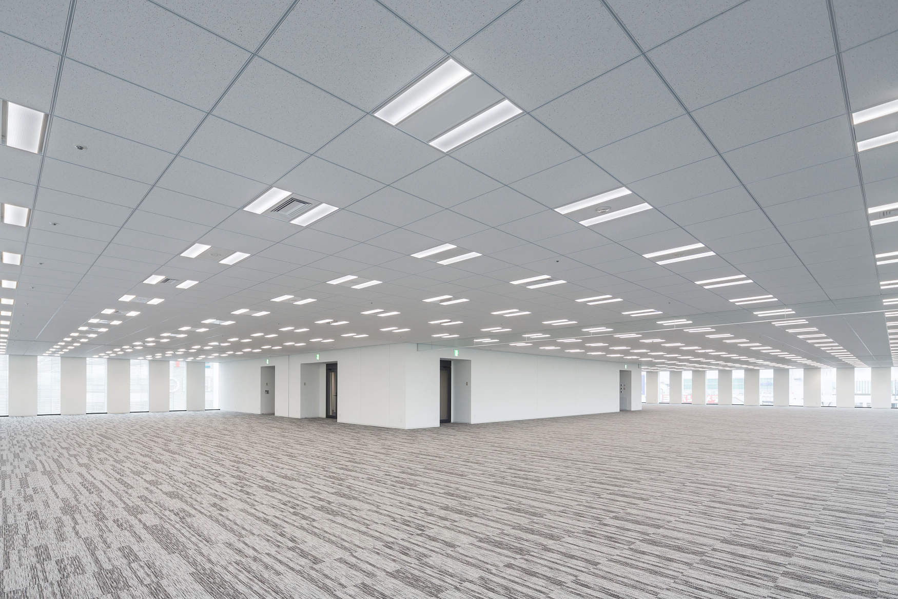 納入商品は基準階の執務室にシステム天井 スリム21シリーズ一体型LEDベースライト フラットパネルタイプ ピラミッドタイプを2800台納入しております。