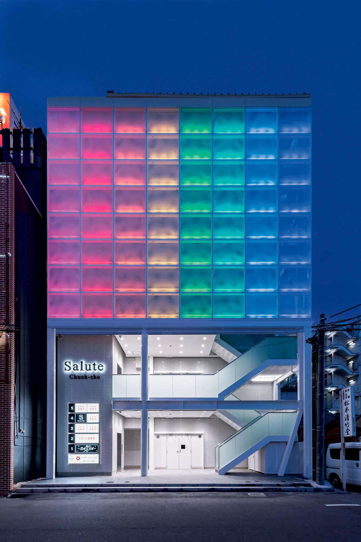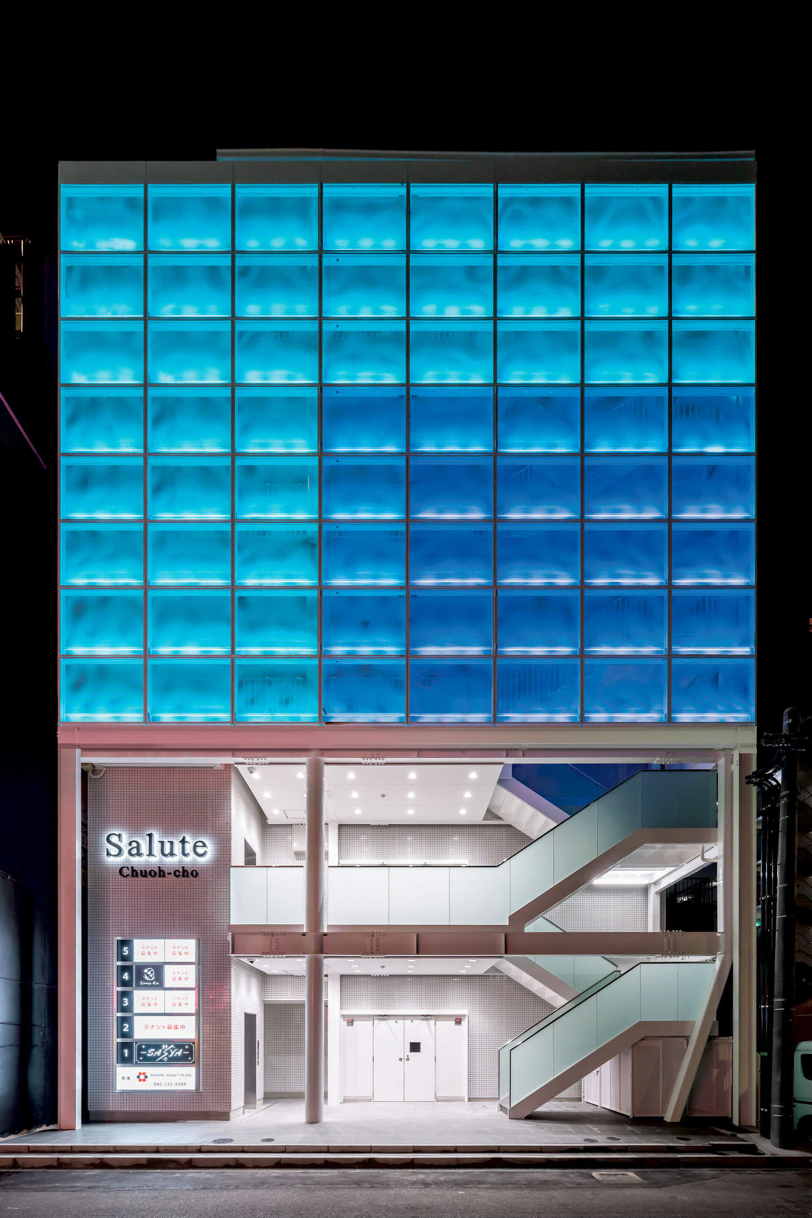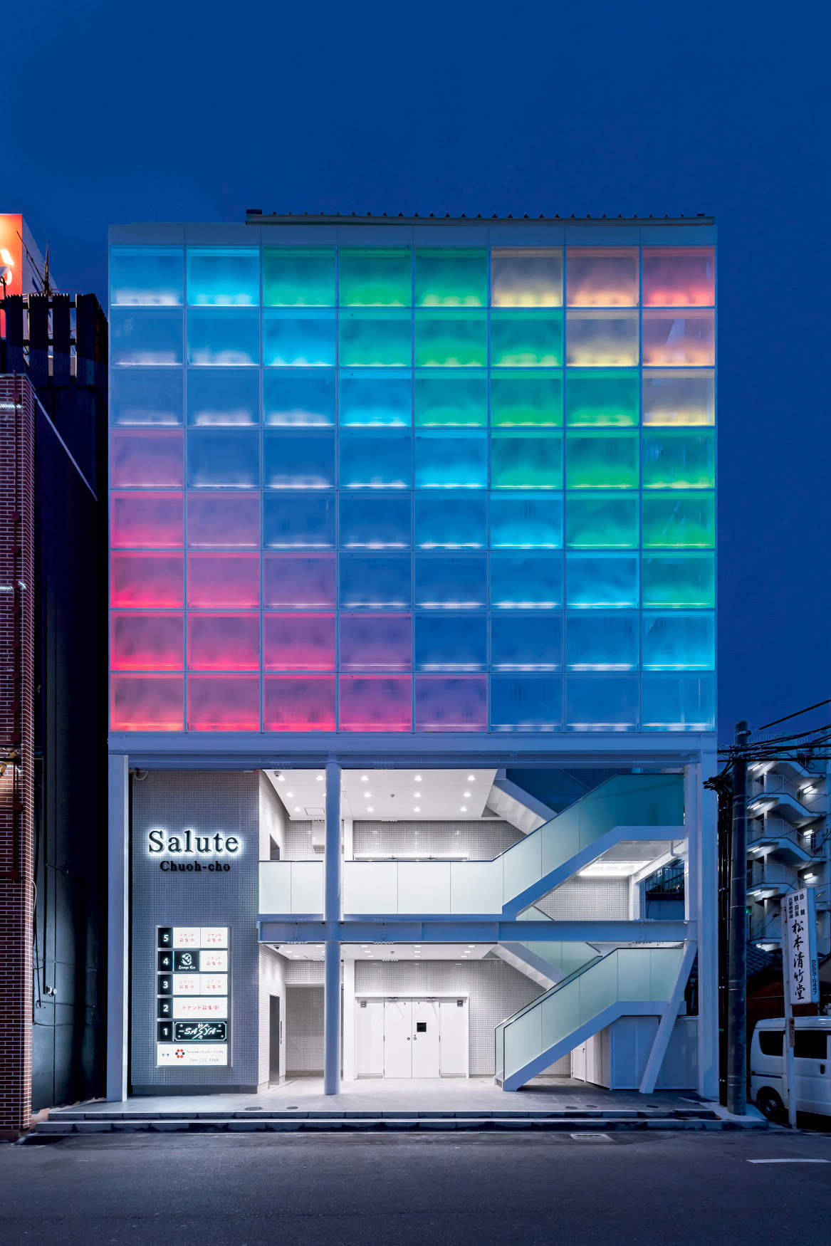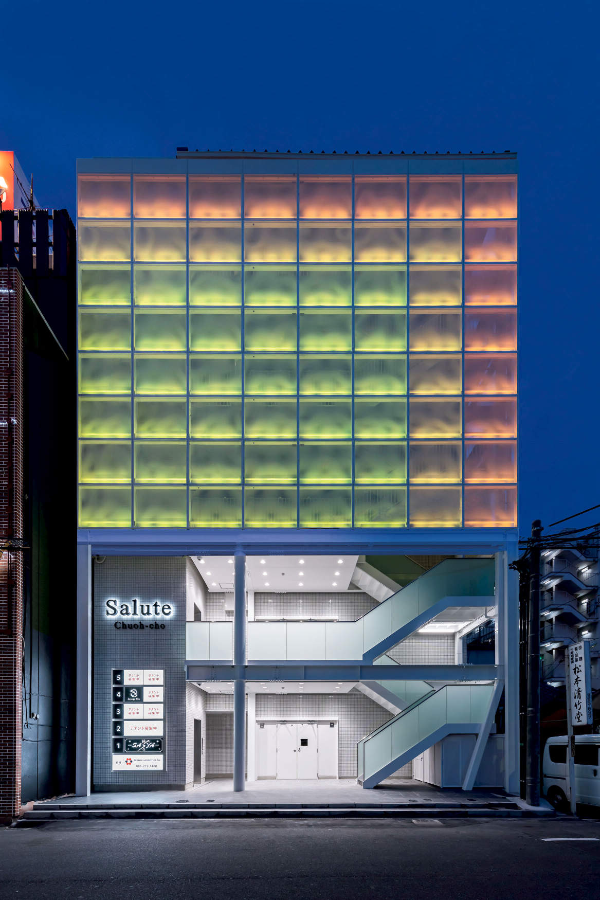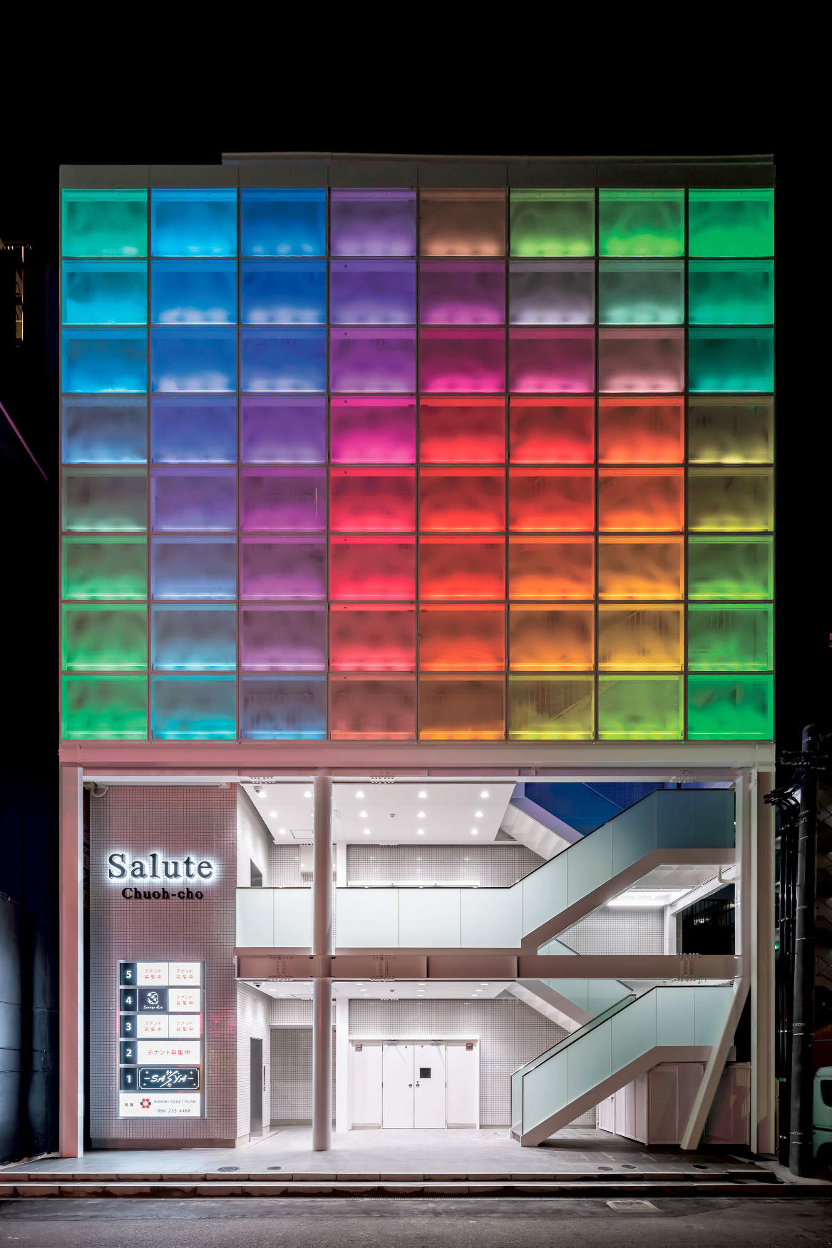 岡山市の新築テナントビル。両面パンチングメタル壁面にRGB照明を仕込み、鮮やかに複数のパターンを演出し好評を得ています。
