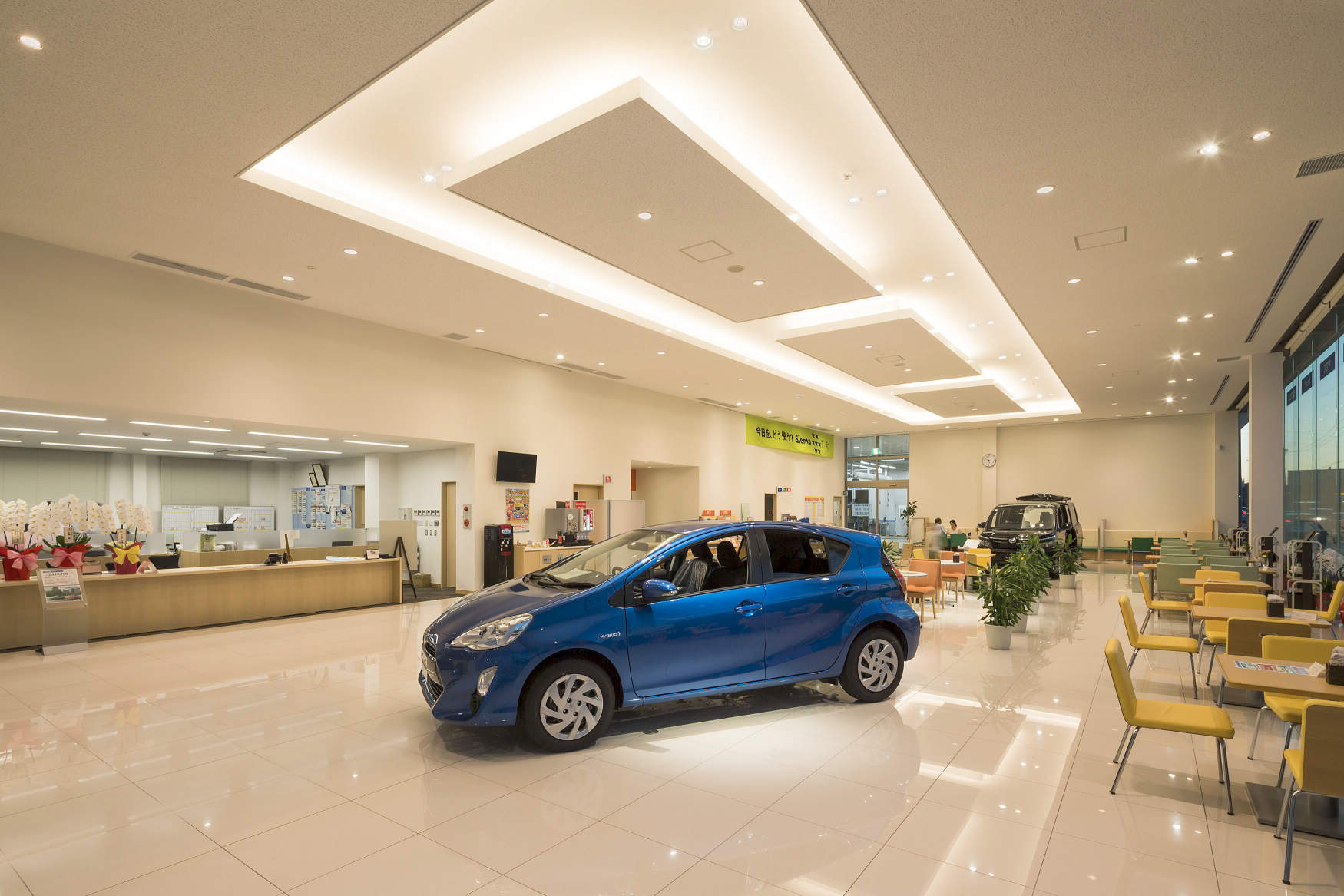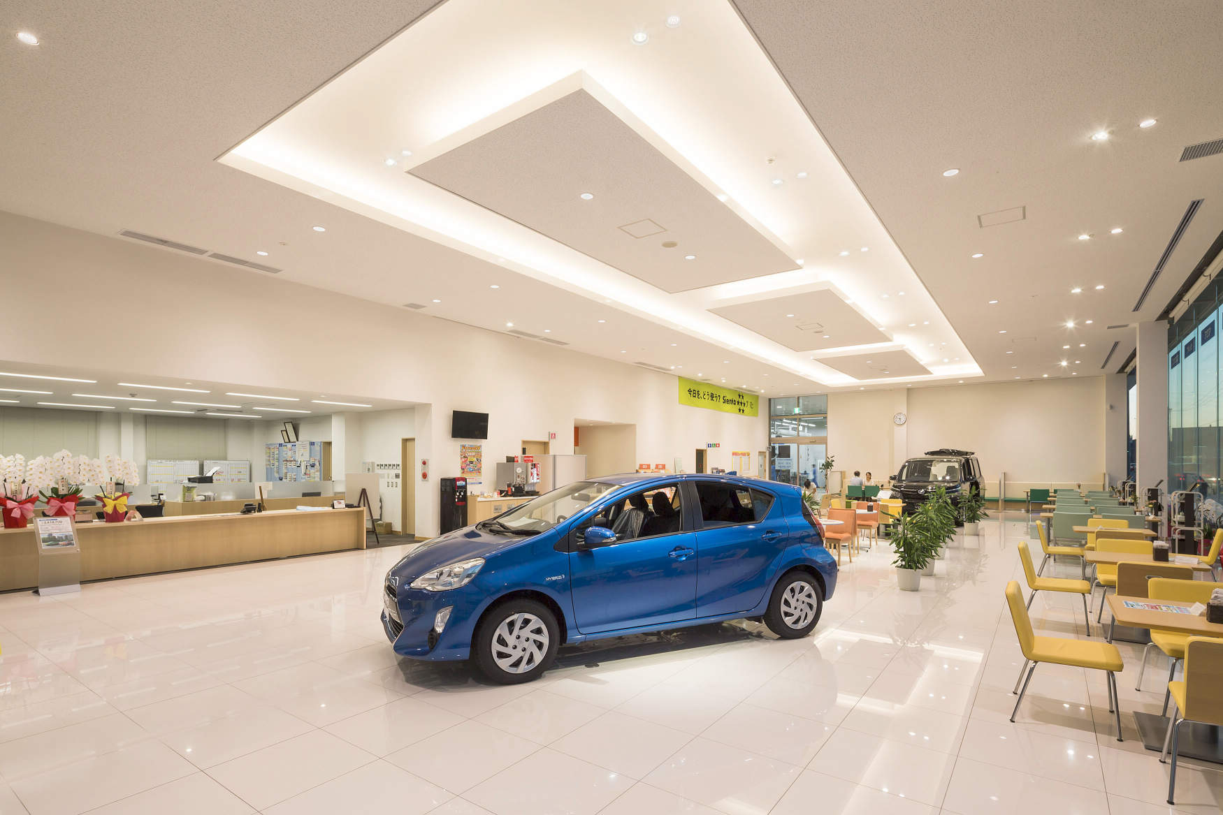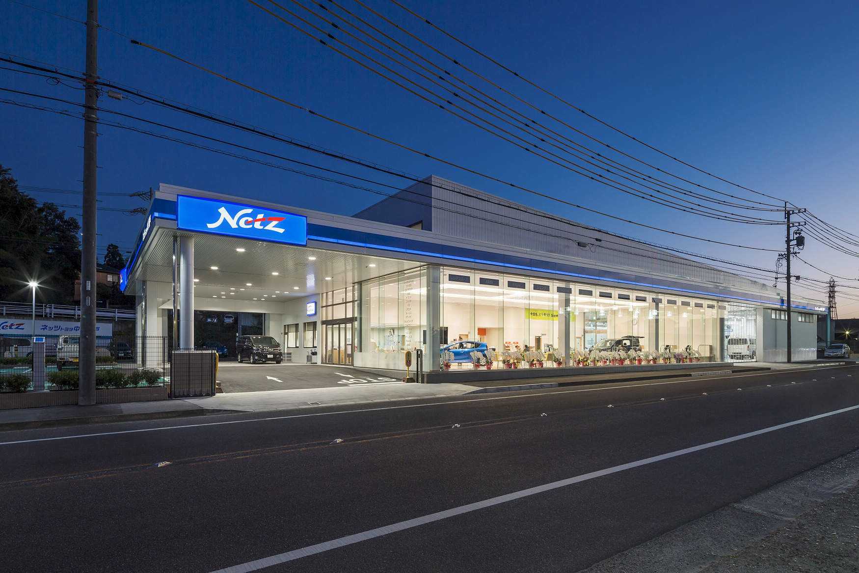 - 国道沿いに建つ白い外壁に青色のネッツのラインが目を引く。全面ガラス張りの間口の広いショールームの店内は、全面白色の清潔感のある店舗空間は、ゆったりとしたバリアフリーで、車と人が主役となるワクワクするような空間になっています。