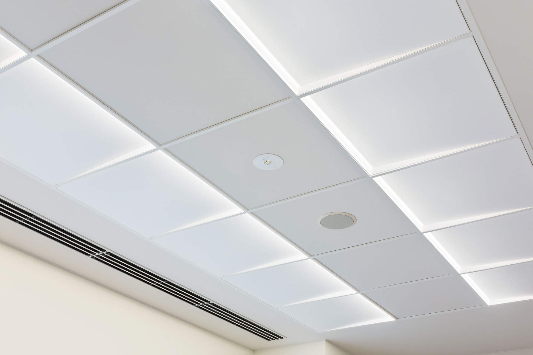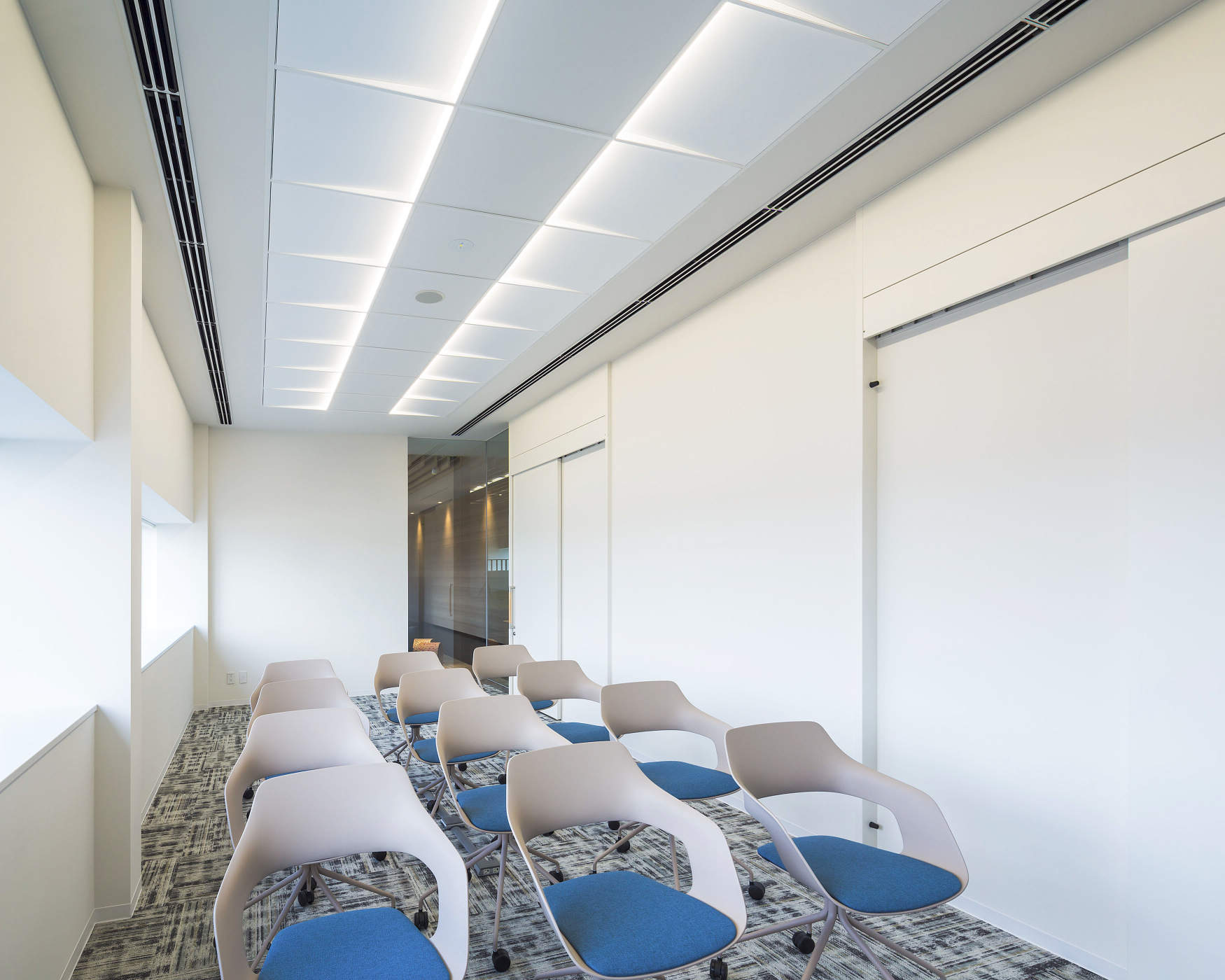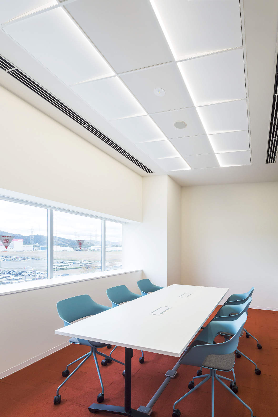 会議室にはSmartArchiアーキテクチュアスクエア+を採用いただきました。照度を確保しながら間接照明のような柔らかな光で開放感を高めています。在来天井用の取付枠を特注で納入しています。