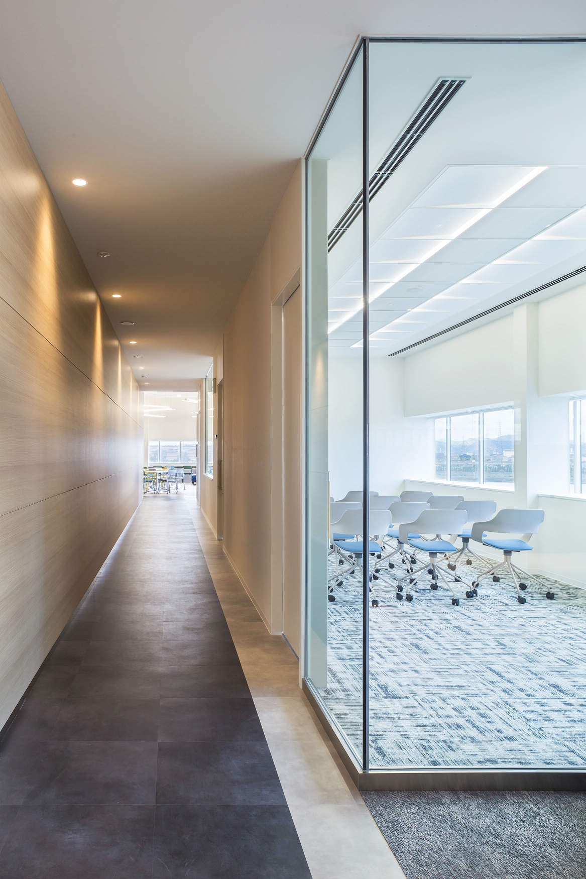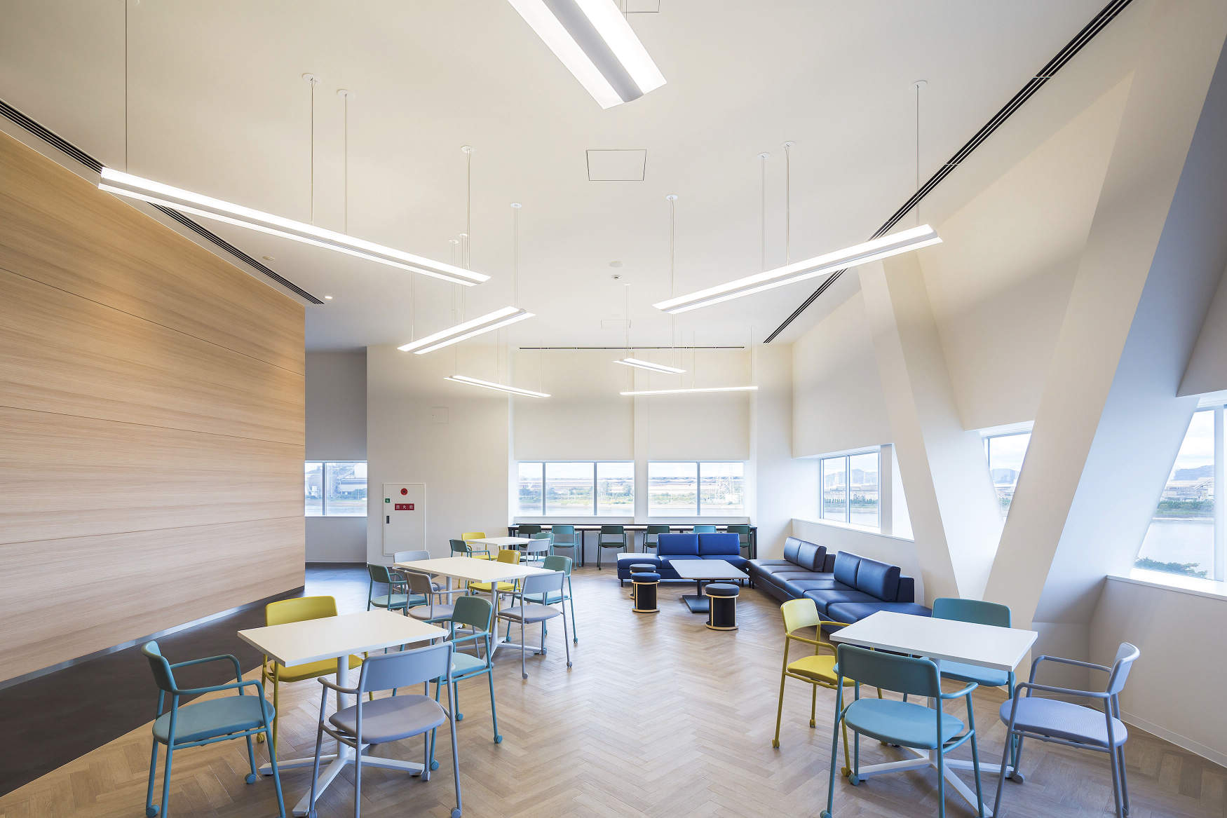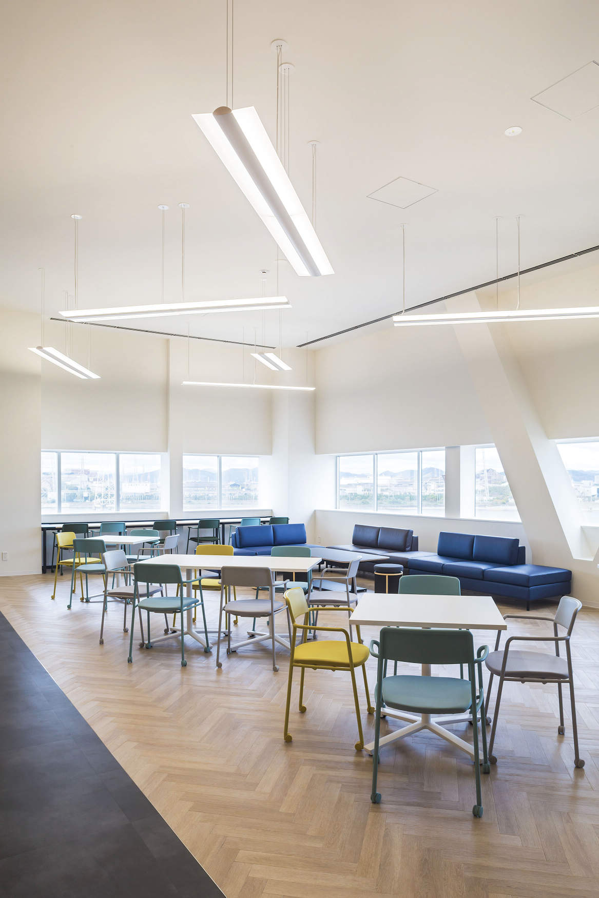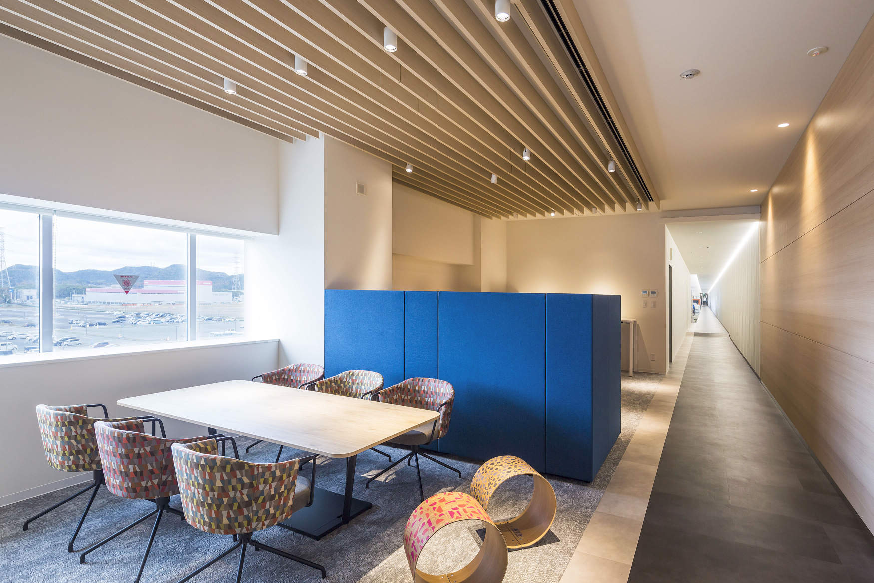 姫路市飾磨区に新設されたプライムプラネットエナジー&ソリューションズ社のオフィス。執務室、リフレッシュエリア、コミュニケーションエリア、会議室、ワーカーの多様な働き方に応じた機能性と演出性に配慮された照明空間となっています。