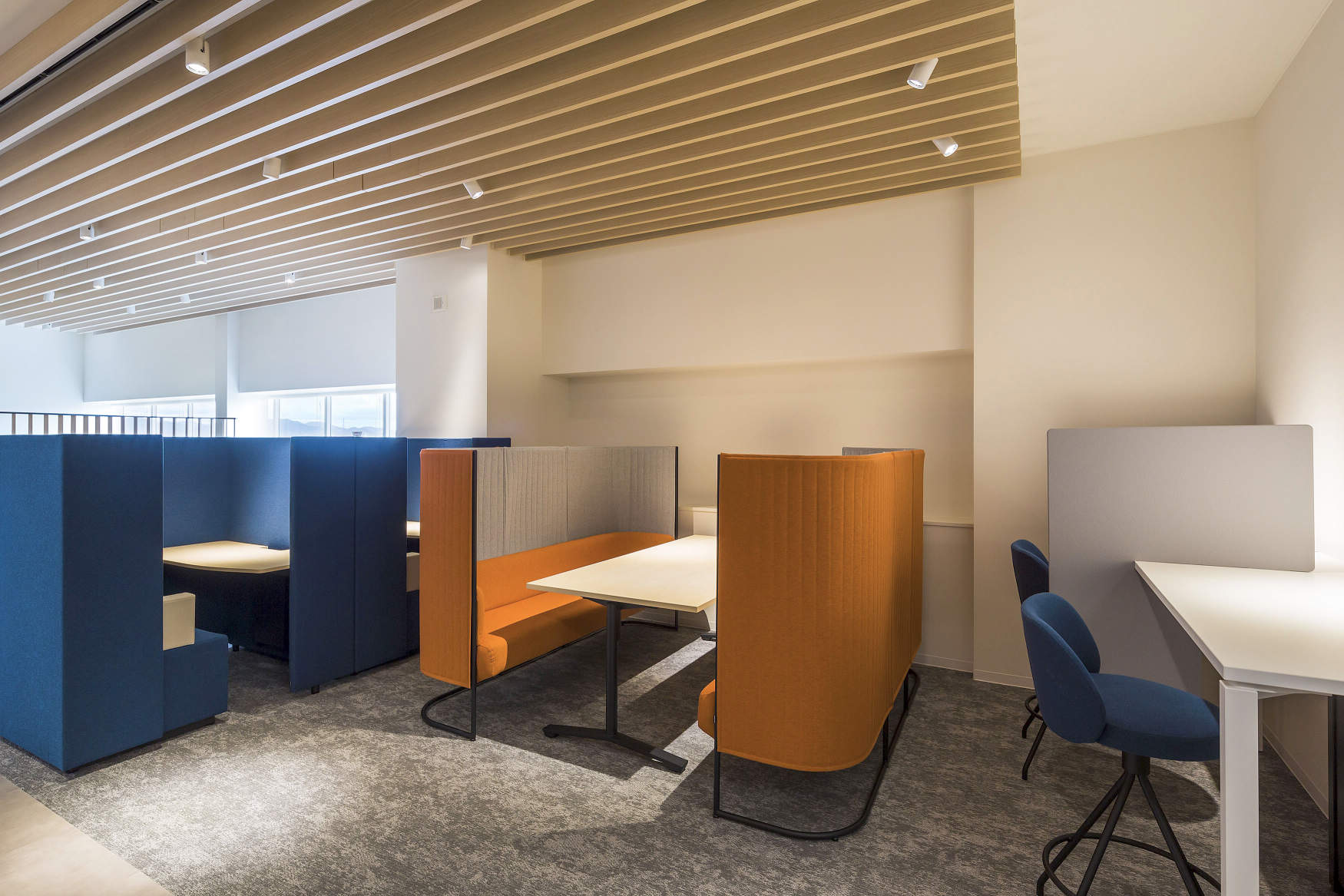 ミーティングエリアではTOLSOビームフリースポットを採用いただきました。 天井ルーバー間に収めることで照明器具の存在感を軽減しながら家具のレイアウトに応じフレキシブルな照明ができる計画としました。また角度調整機能により机のサイズやパーティションによる手暗がりが出ないよう現場で配光を調整することで最適なライティングが可能となりました。