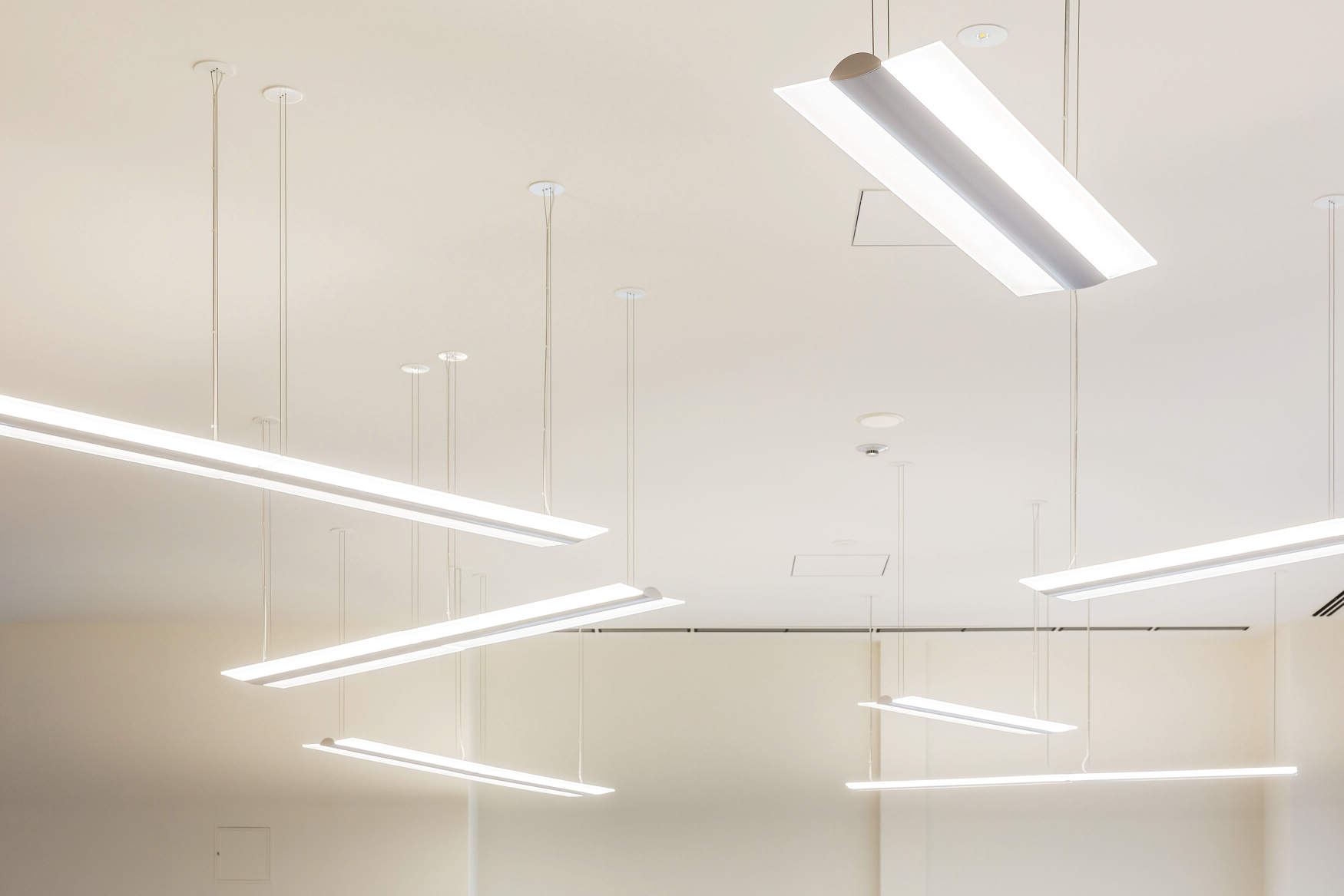 リフレッシュエリアではSmartArchiフロートライトペンダントを採用いただきました。天井が高い空間においてランダムな配置をしていただくことで浮遊感や開放感が高まり、リラックスできる雰囲気づくりに貢献しています。