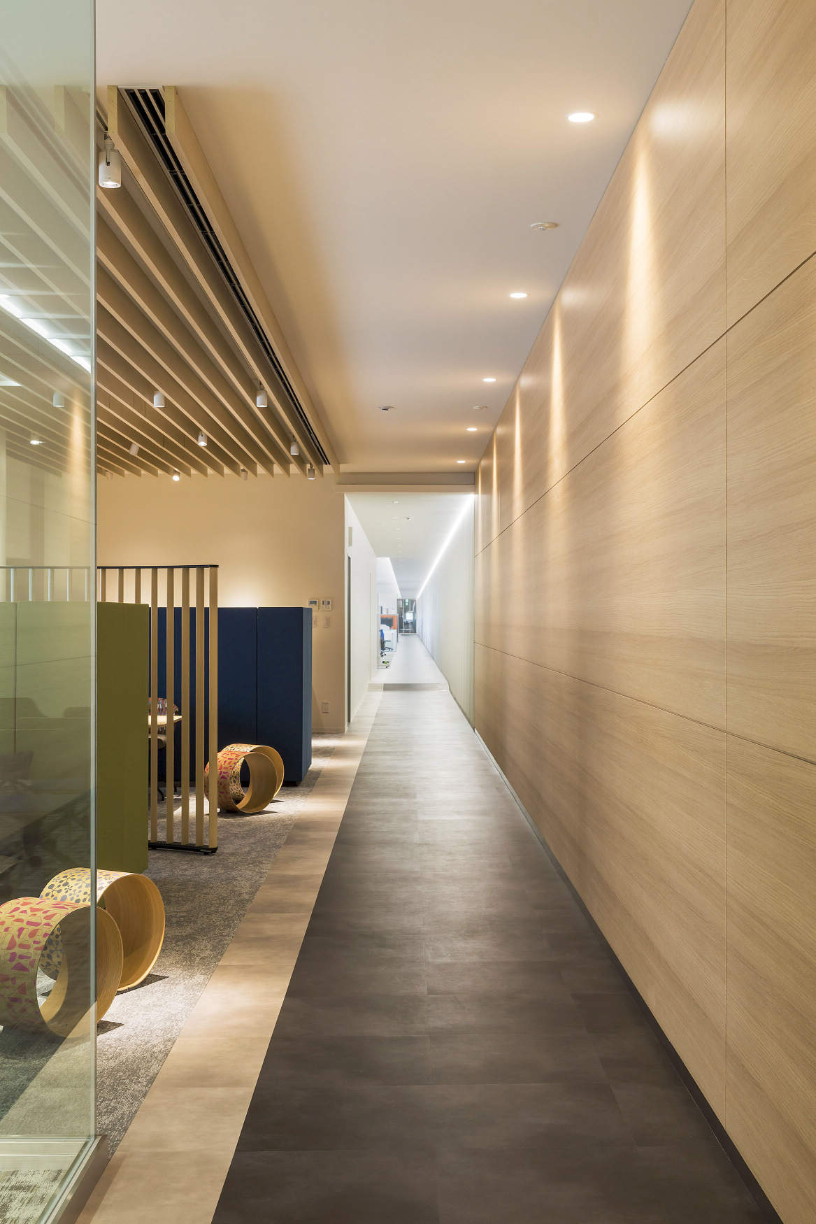 通路にはTOLSOダウンライトのシルバーメタリックコーンを採用いただきました。自然光が入る空間において適度な灯具輝度により明るさ感を高めながら、木目調の壁面を連続的に照射し回遊性を高めています。