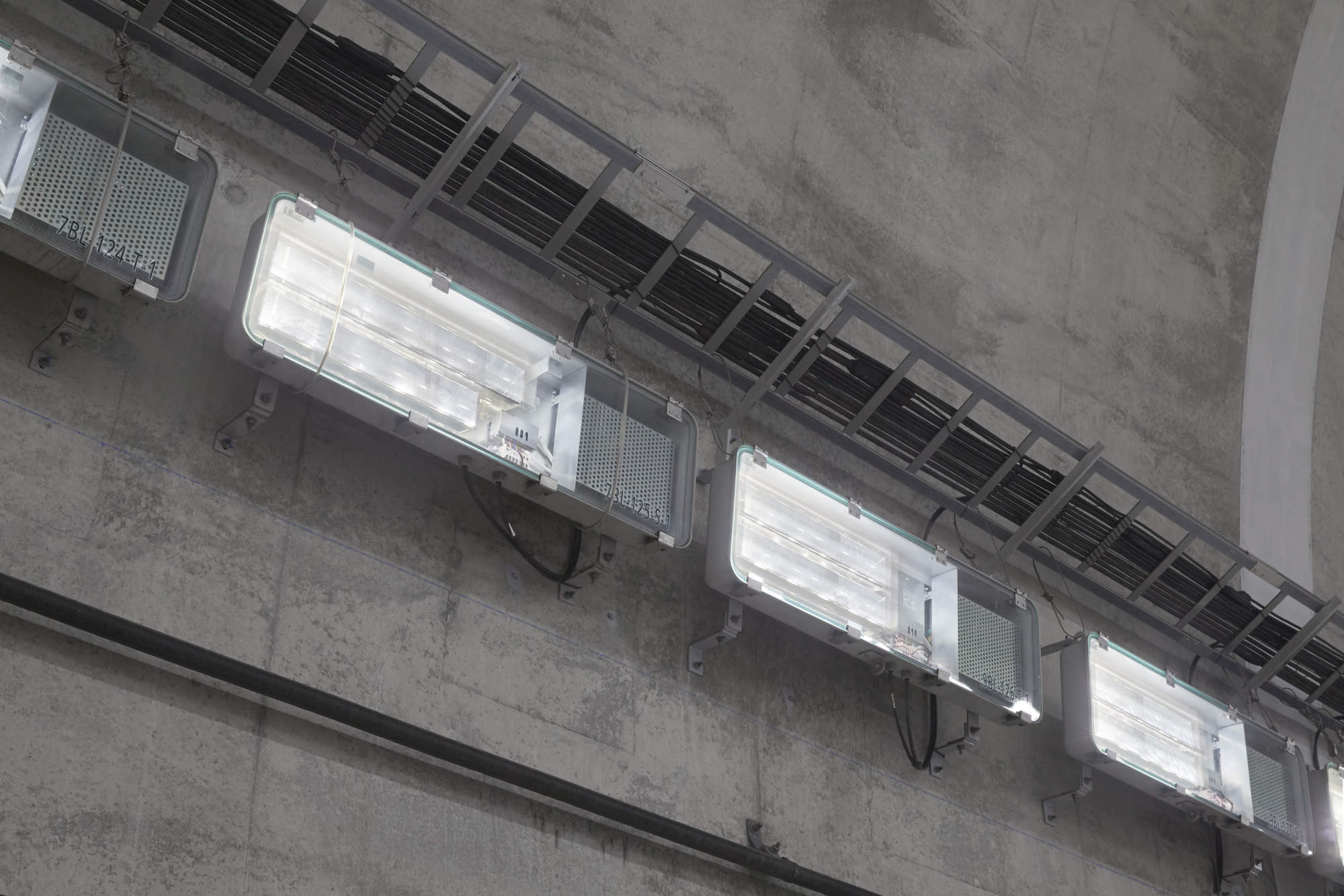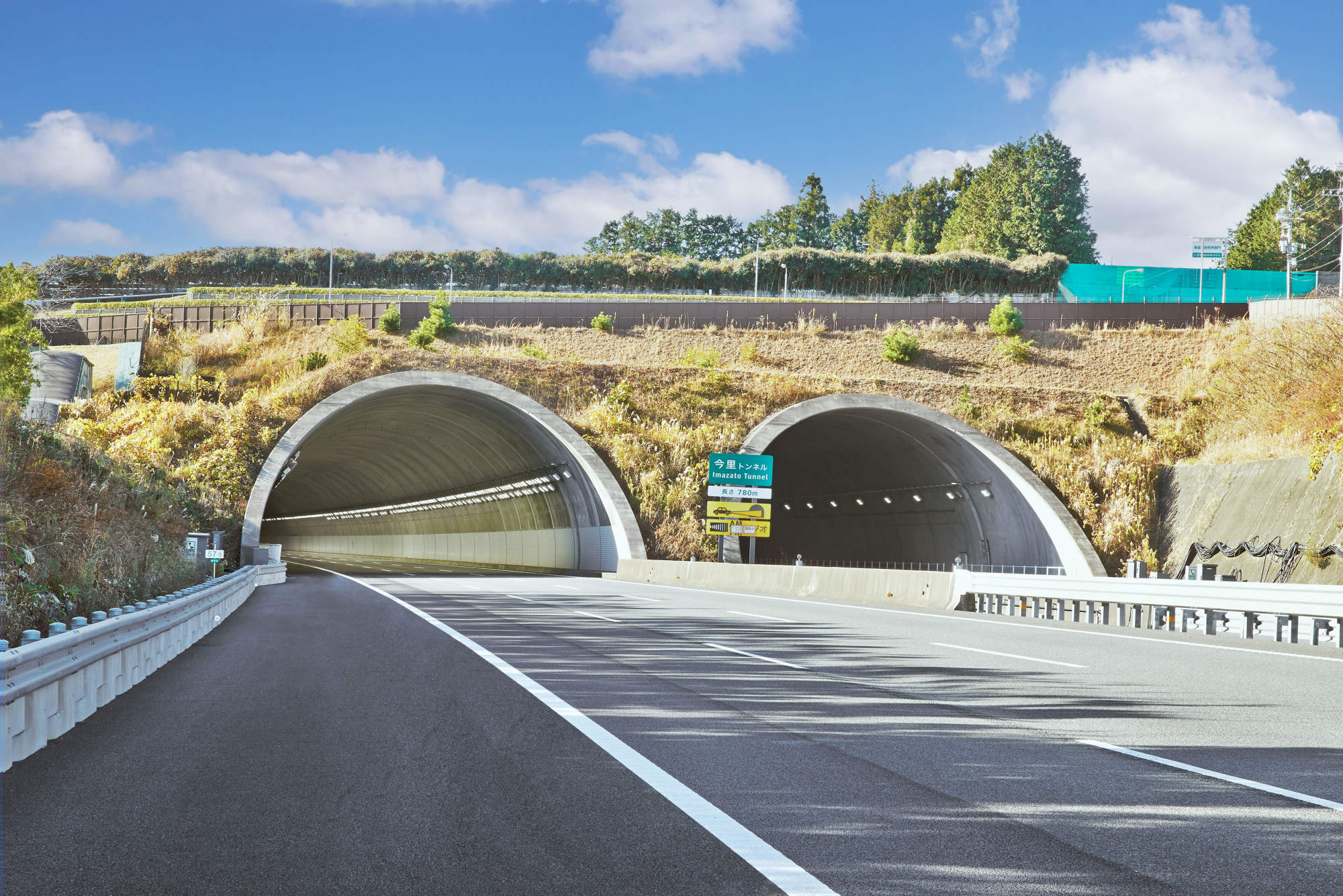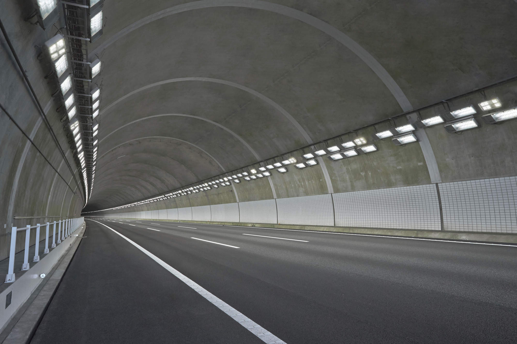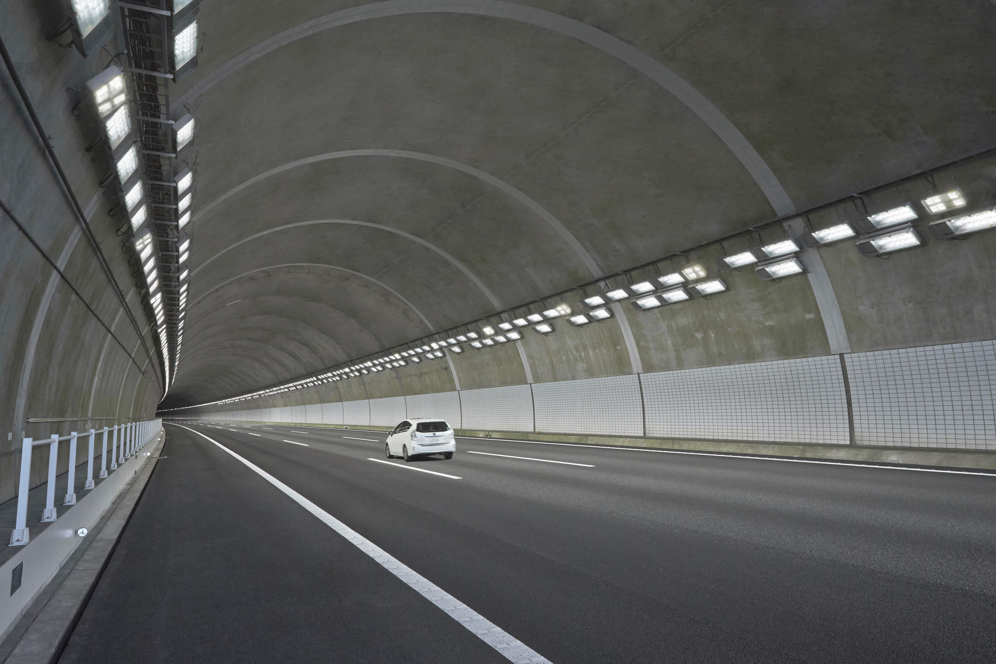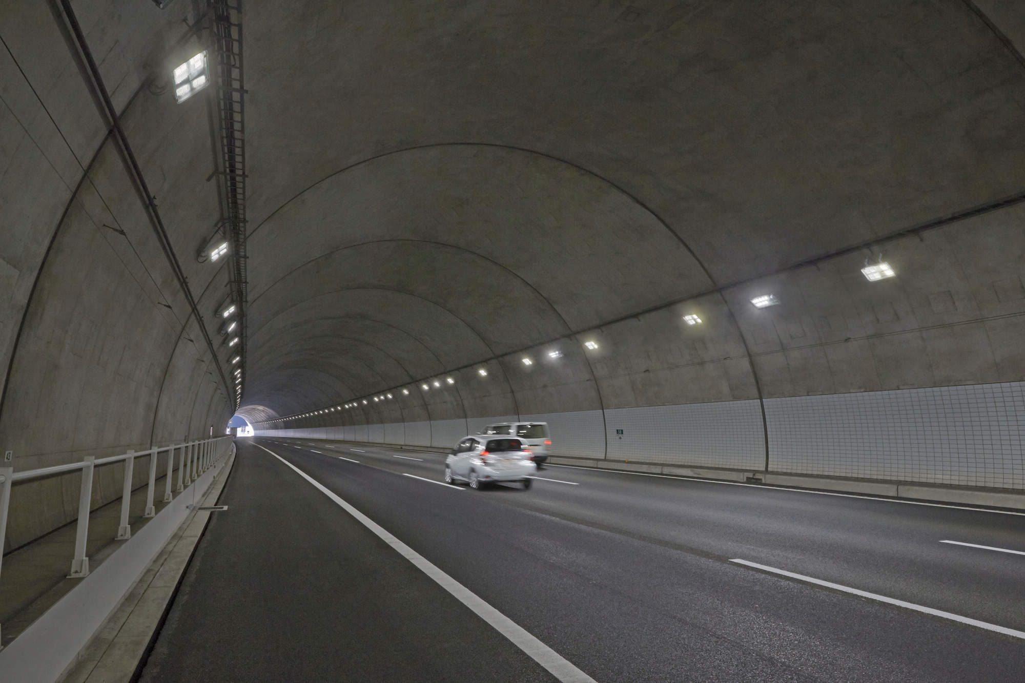 神奈川県海老名市から静岡県を経由して愛知県豊田市までを繋いている高速自動車国道です。新東名高速道路6 車線化事業に伴い, 御殿場JCTから浜松いなさJCT間(約145km)では国内初の最高速度規制120㎞/hへの引上げに対応した上下線のトンネルの基本照明及び 入口照明の改修(内機交換・増設)が行われました。最高速度規制120㎞/hに対応した等価光幕輝度理論による入口照明の設計輝度を採用し, 先行車の視認性が高いプロビーム照明方式を用いる事で,所要の安全性と省エネ性を両立しております。