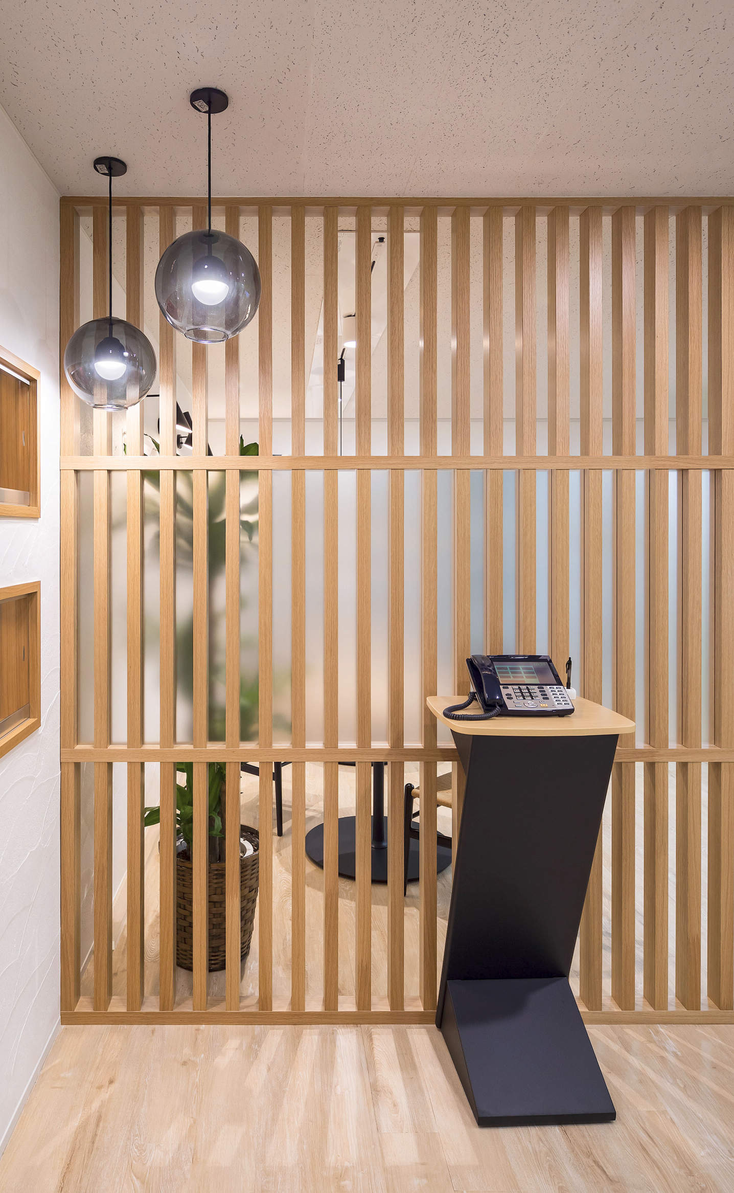 受付部分には球体ガラスの「ペンダント」を配置し、