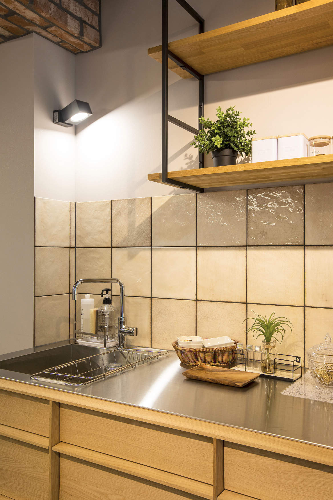 打ち合わせコーナーの壁面アクセントタイルや、