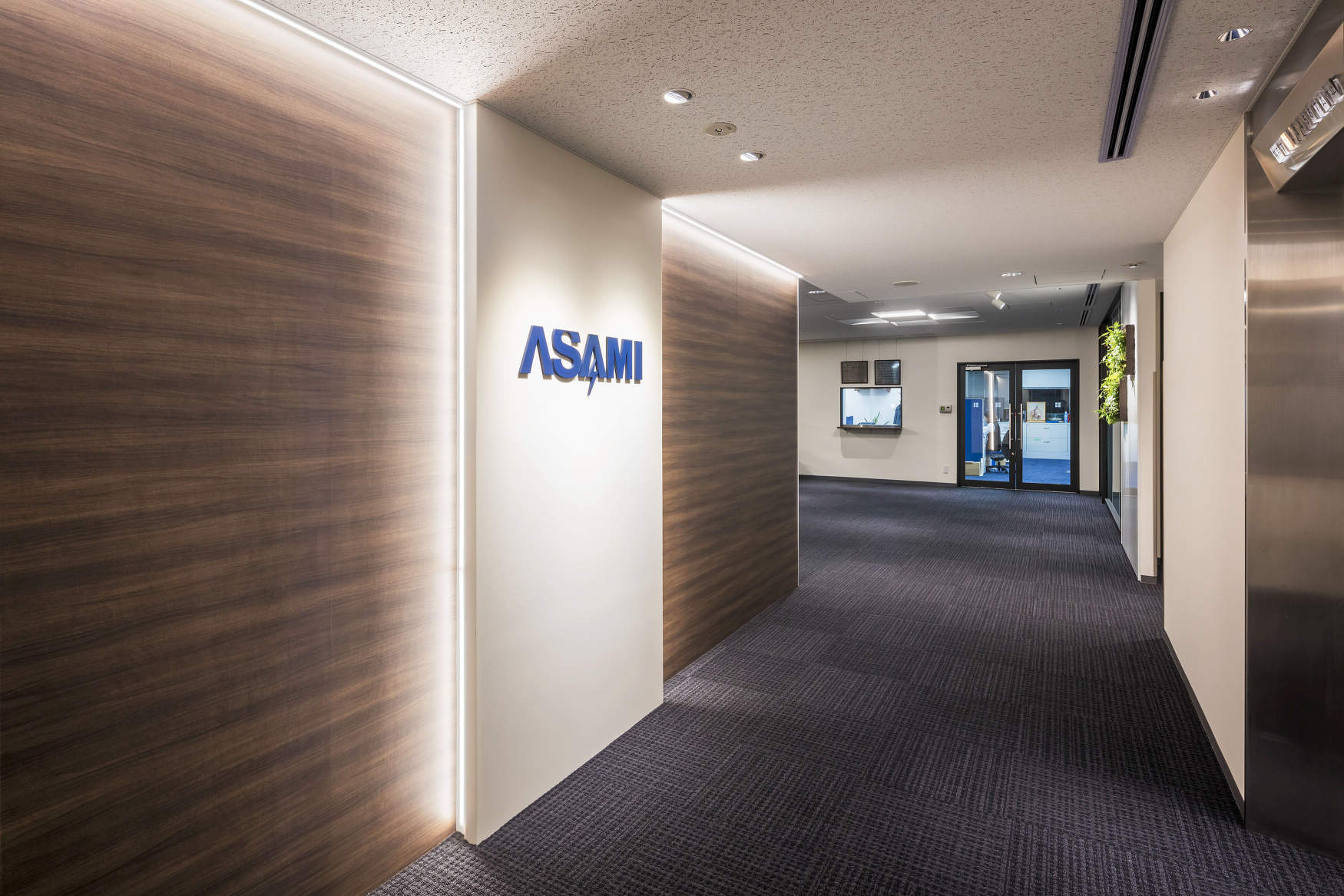 大阪市北区の電気設備工事会社浅海電気株式会社の本社改修工事において、オフィスの顔となるエントランス、ロビー、ミーティングスペースに、導光パネルを用いたFloatLightをはじめ機能的で且つ意匠性の高いオフィス照明を納入しました。