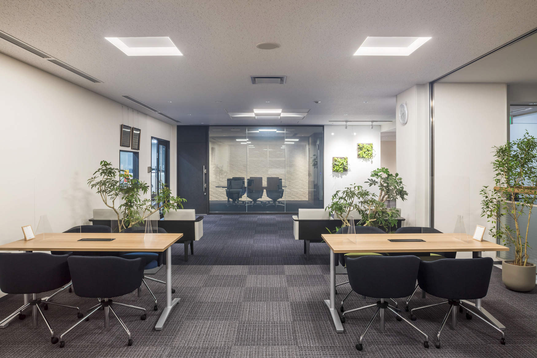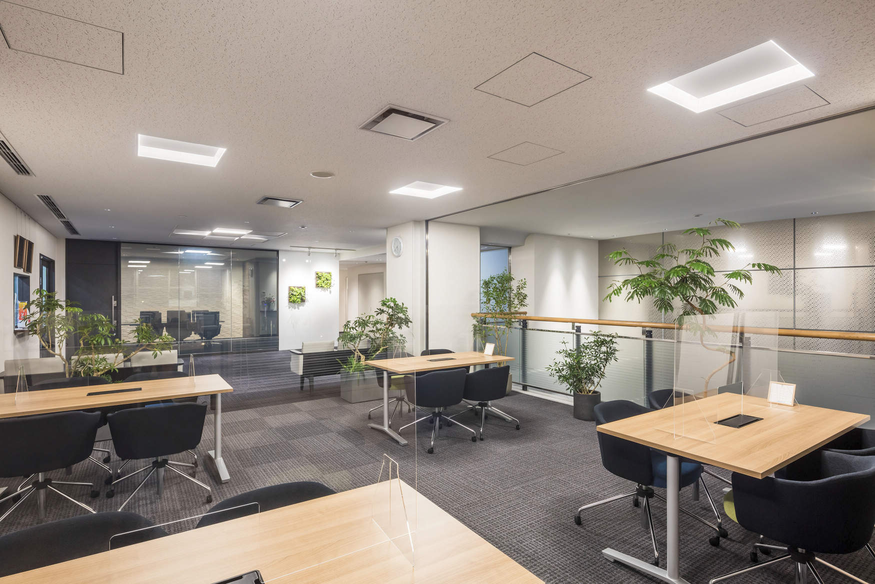 ミーティングスペースは折上げ天井のような表情を持つArchitecturalSquareタイプで机上面照度500ルクスを確保しながら、ノイズレスで且つ均斉度の高い空間をつくっています。