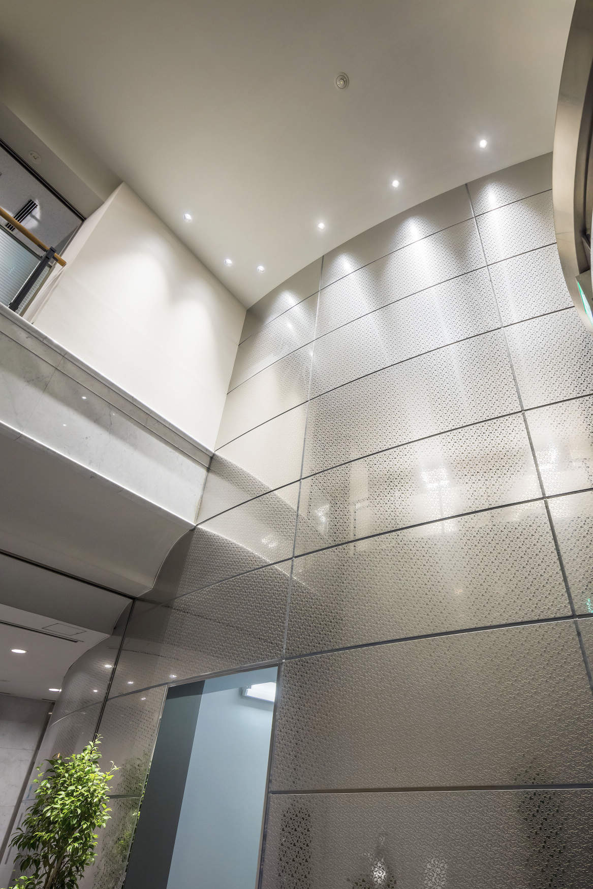 吹抜けのエントランスホールはSmartArchi高Wグレアレスユニバーサルダウンライトにより壁面のテクスチャを浮き上げながら、ホールの奥からあふれだすような光の演出によりエントランスの表情をつくっています。