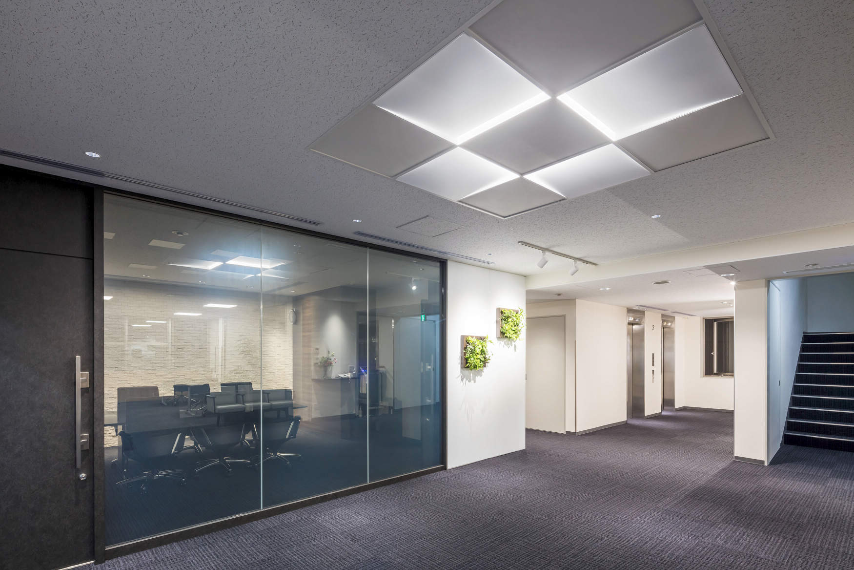 応接室はSmartArchi SquarePanelを連続配置しシンボリックな印象の空間をつくっています。トリムレスな外観により多灯配置でもすっきりとノイズレスな空間を実現しています。奥の壁は入隅まで照らすグレアレスウォールウォッシャーで壁面のテクスチュアを演出しています。
